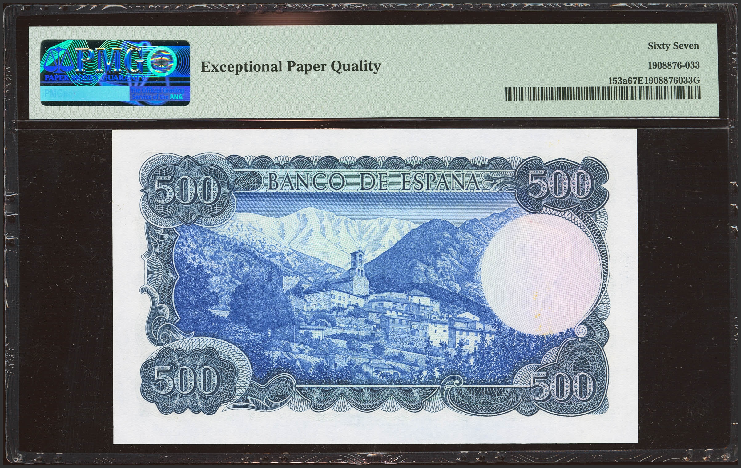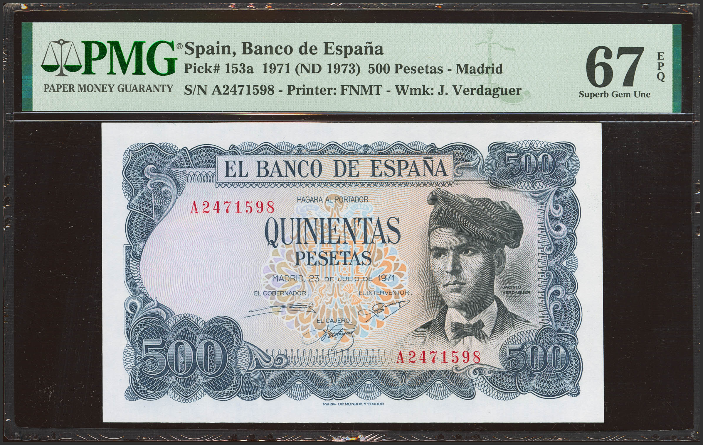500 Pesetas. 23 de Julio de 1971. Serie A. (Edifil 2023: 473a, Pick: 153a). Apresto original. SC. Encapsulado PMG67EPQ.