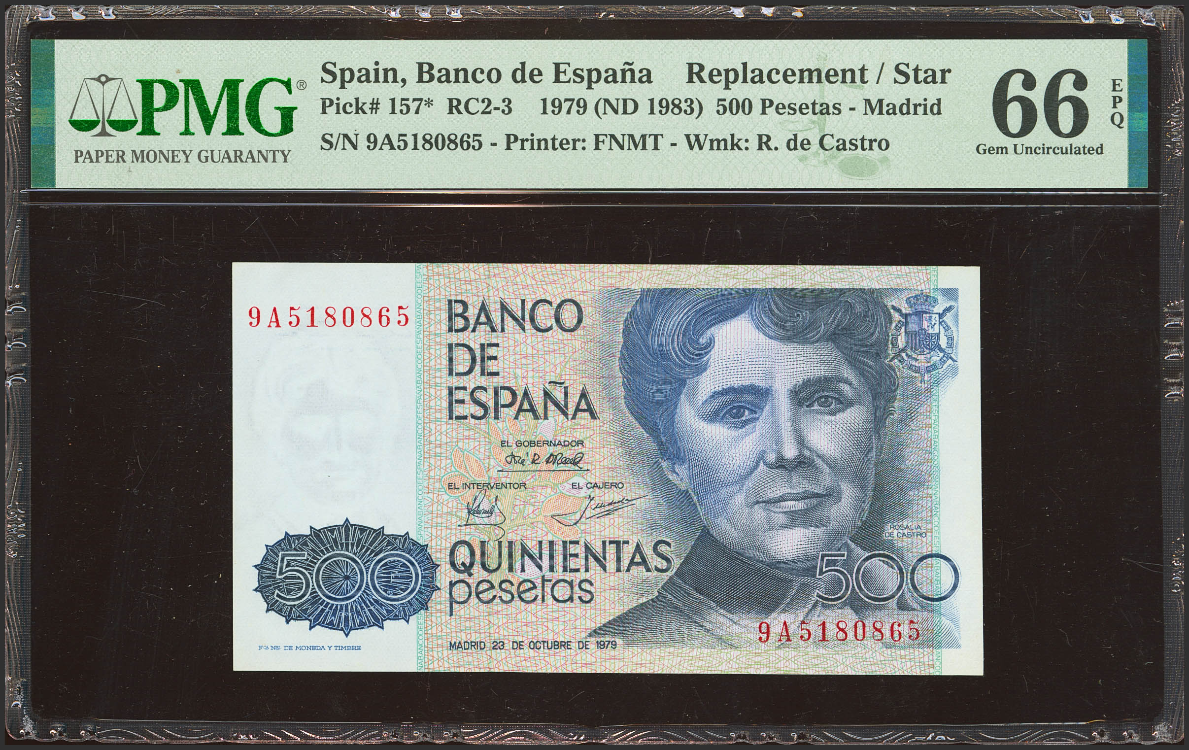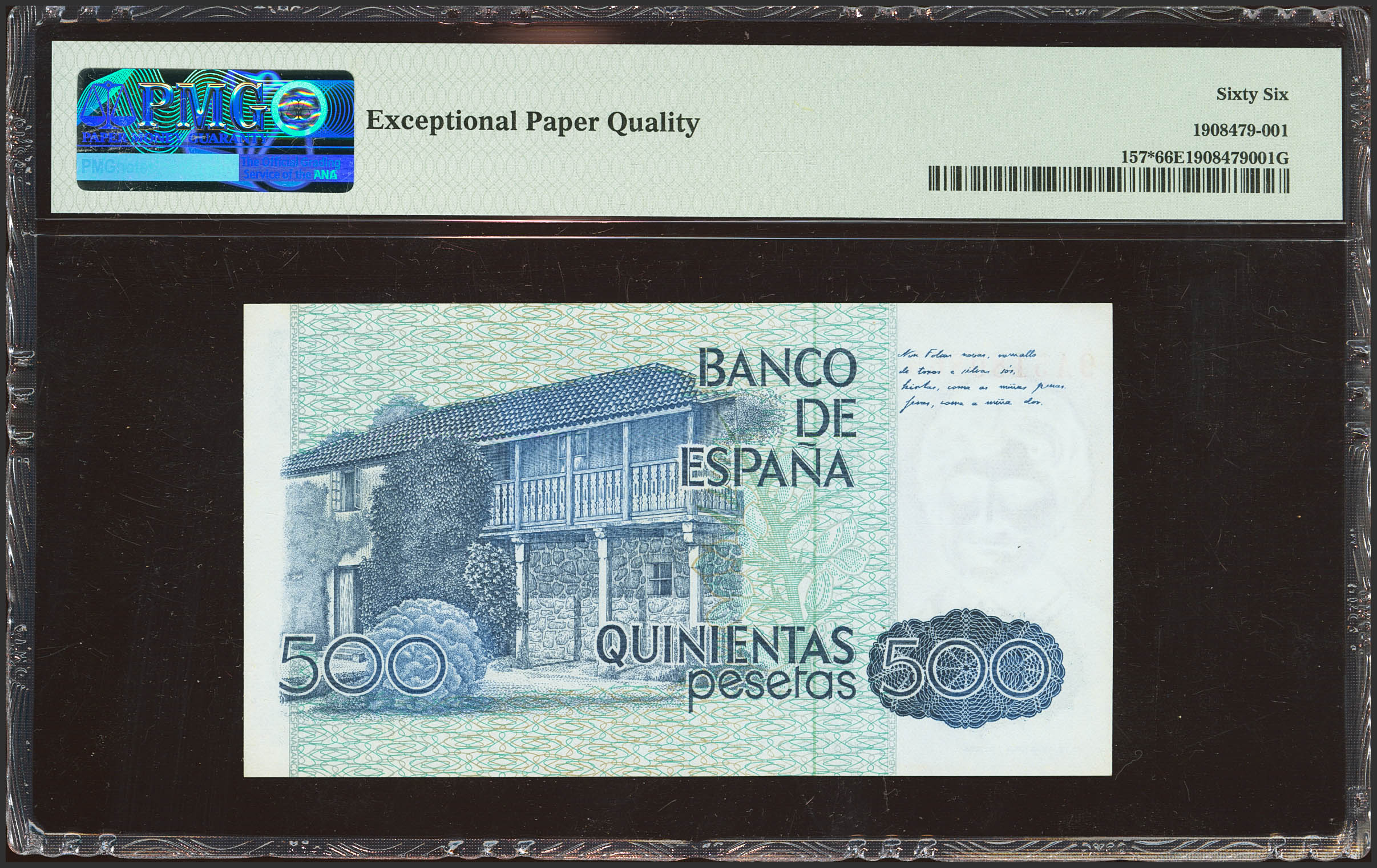 500 Pesetas. 23 de Octubre de 1979. Serie especial 9A. (Edifil 2023: 476b, Pick: 157*). Inusual en esta excepcional calidad y apresto original. SC. Encapsulado PMG66EPQ.