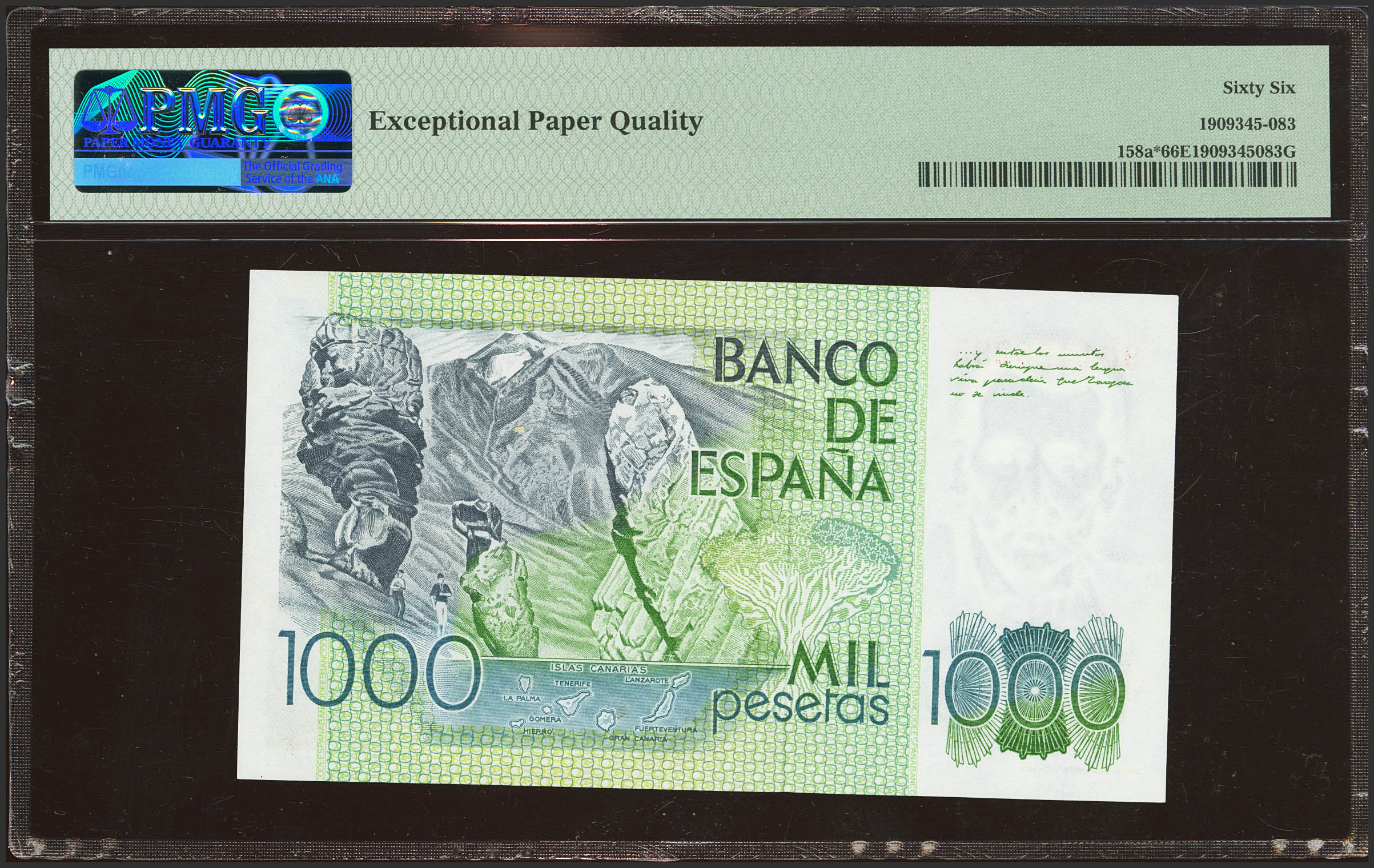 1000 Pesetas. 23 de Octubre de 1979. Serie especial 9C. (Edifil 2023: 477b, Pick: 158a*). Raro en esta excepcional calidad. SC. Encapsulado PMG66EPQ.