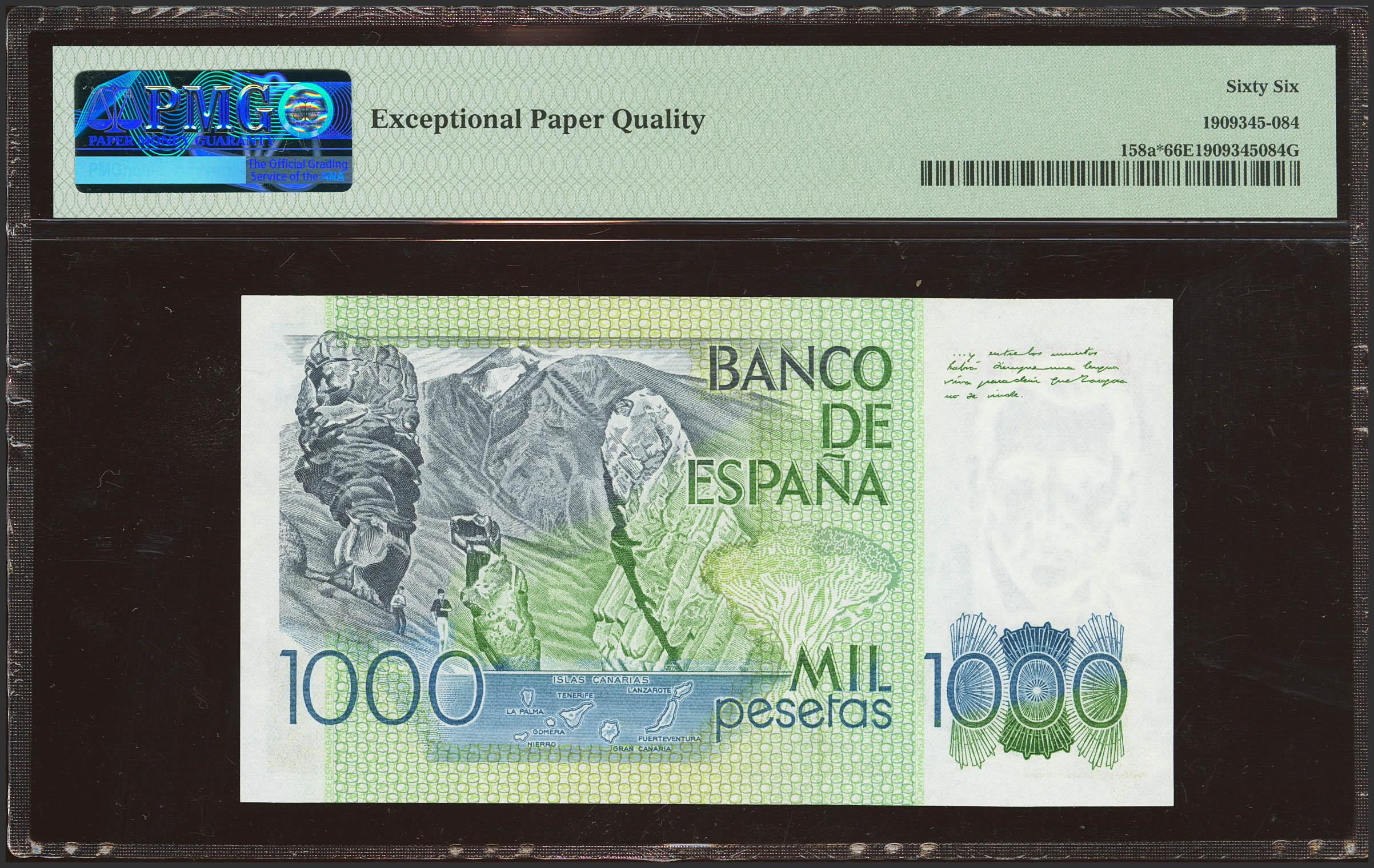 1000 Pesetas. 23 de Octubre de 1979. Serie especial 9D. (Edifil 2023: 477b, Pick: 158a*). Raro en esta excepcional calidad. SC. Encapsulado PMG66EPQ.