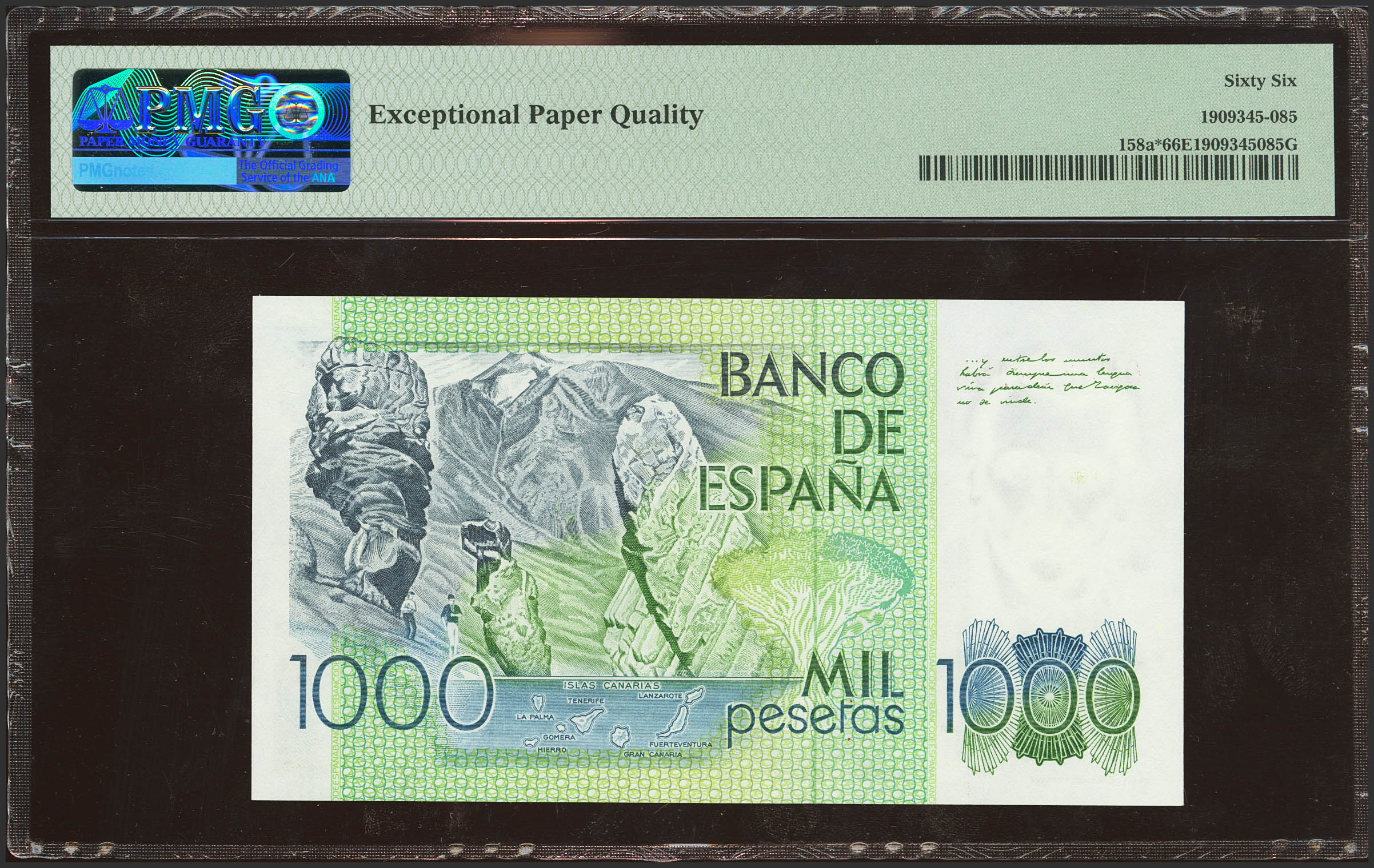 1000 Pesetas. 23 de Octubre de 1979. Serie especial 9F. (Edifil 2023: 477b, Pick: 158a*). Raro en esta excepcional calidad. SC. Encapsulado PMG66EPQ.
