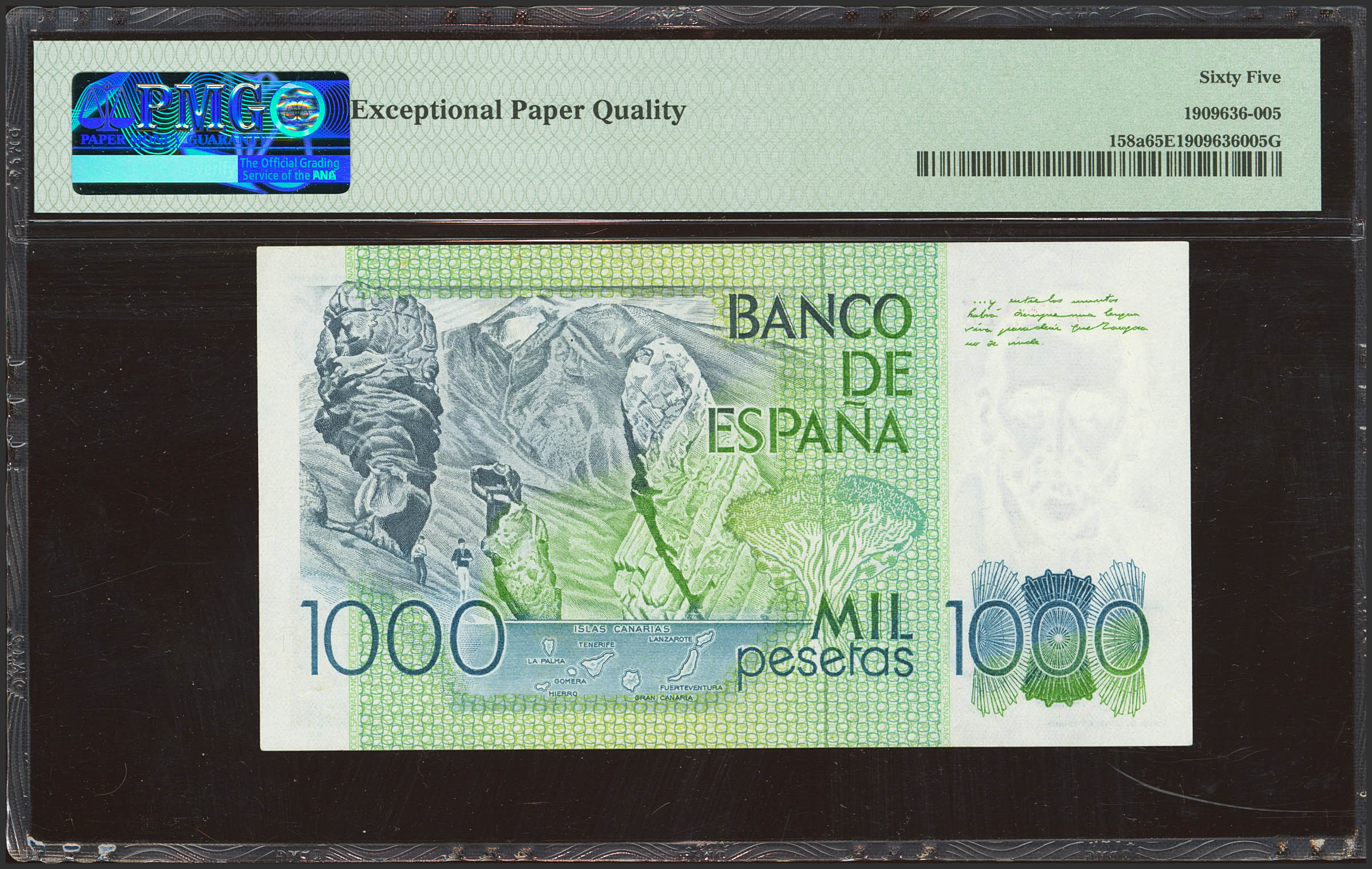 1000 Pesetas. 23 de Octubre de 1979. Sin serie. (Edifil 2023: 477, Pick: 158a). Inusual en esta excepcional calidad. SC. Encapsulado PMG65EPQ.