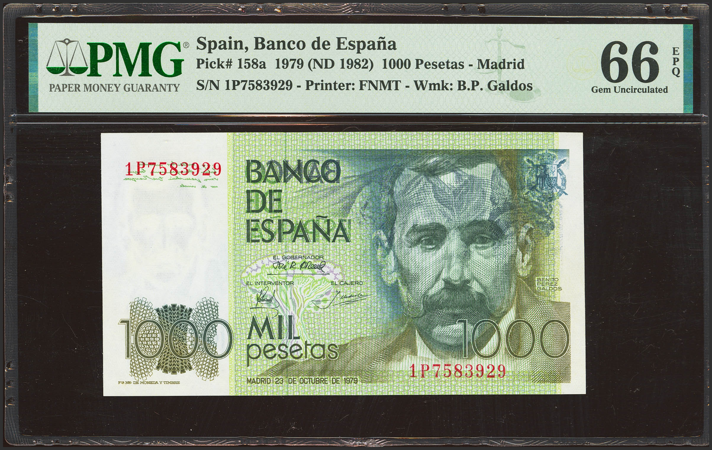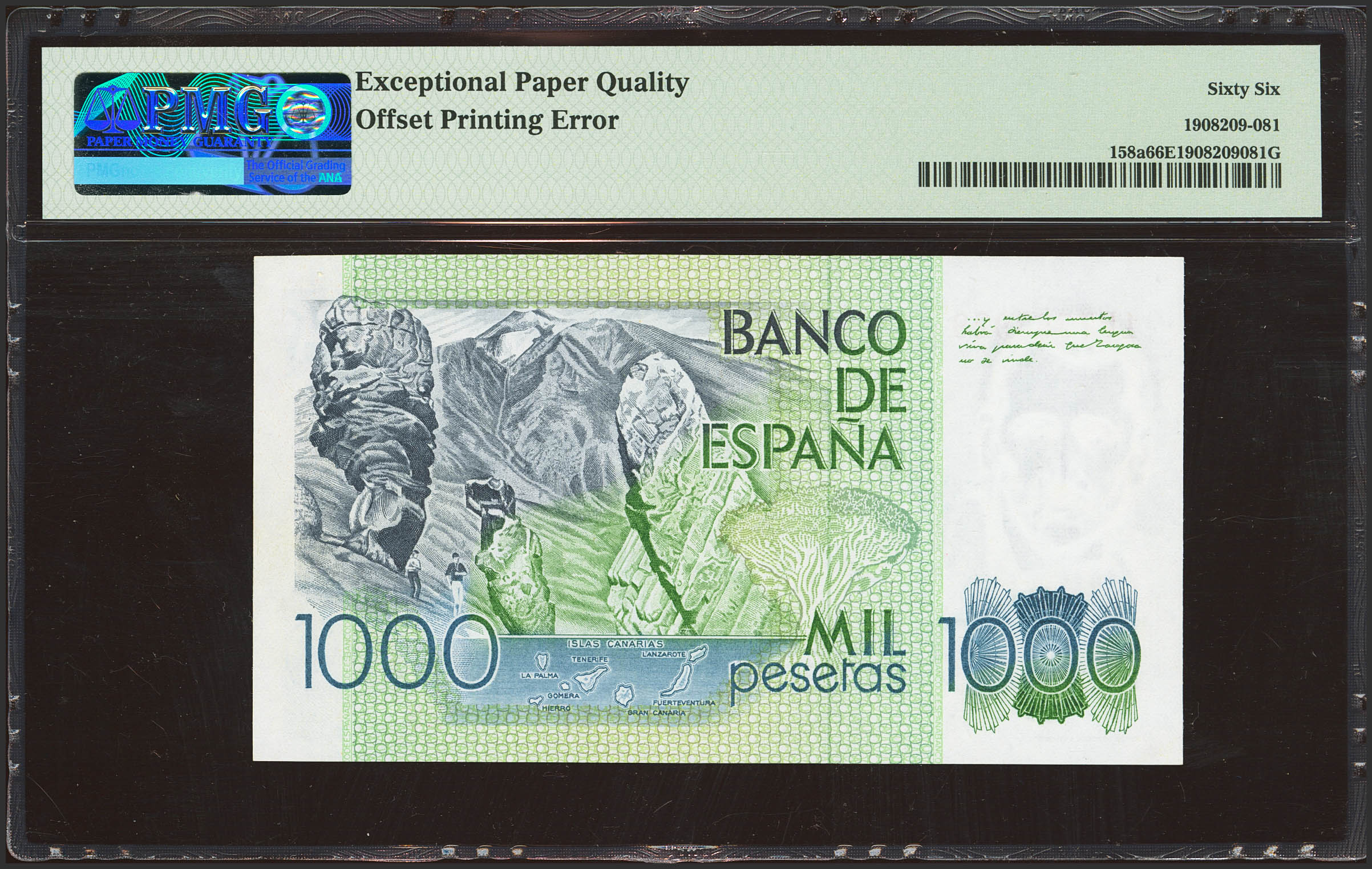 1000 Pesetas. 23 de Octubre de 1979. Error de impresión en el anverso. Serie 1P. (Edifil 2023: 477a, Pick: 158a). Raro y espectacular, para entender mejor la contextualización de este billete recomendamos la obra "Enciclopedia de la Notafilia y Escripofilia Española", de Don José Antonio Castellanos. SC. Encapsulado PMG66EPQ.