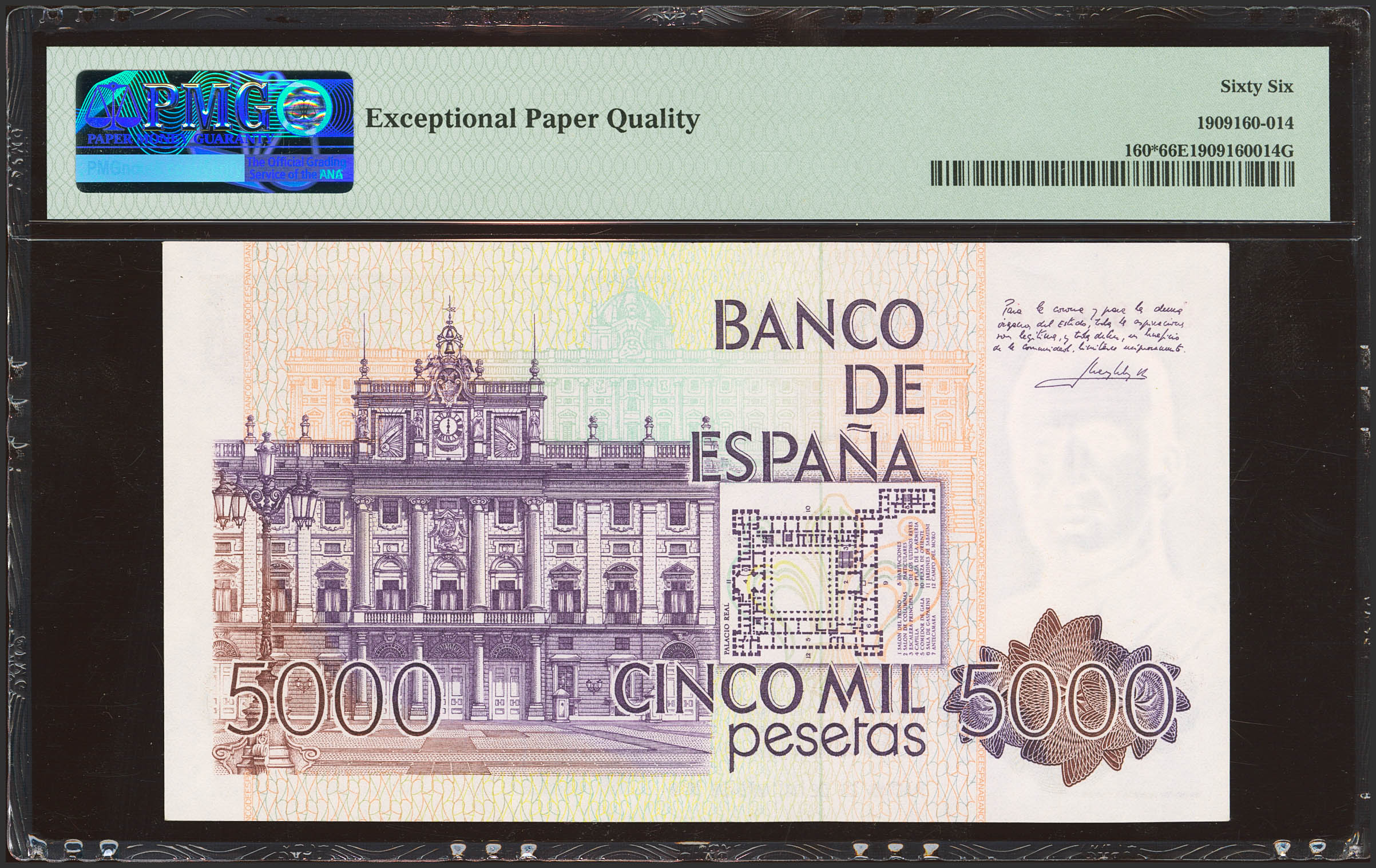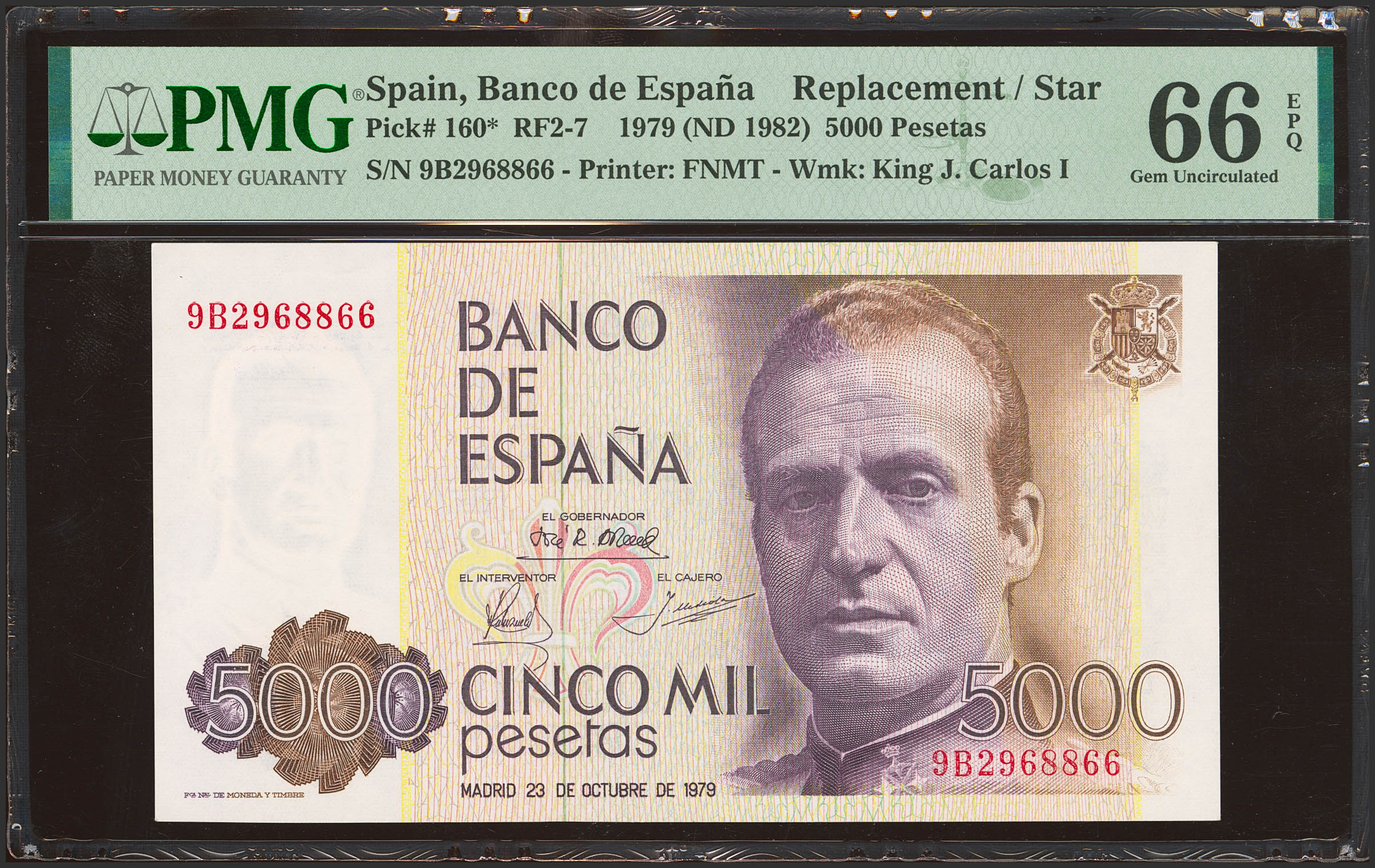 5000 Pesetas. 23 de Octubre de 1979. Serie especial 9B. (Edifil 2023: 478b, Pick: 160*). Raro en esta excepcional calidad. SC. Encapsulado PMG66EPQ.
