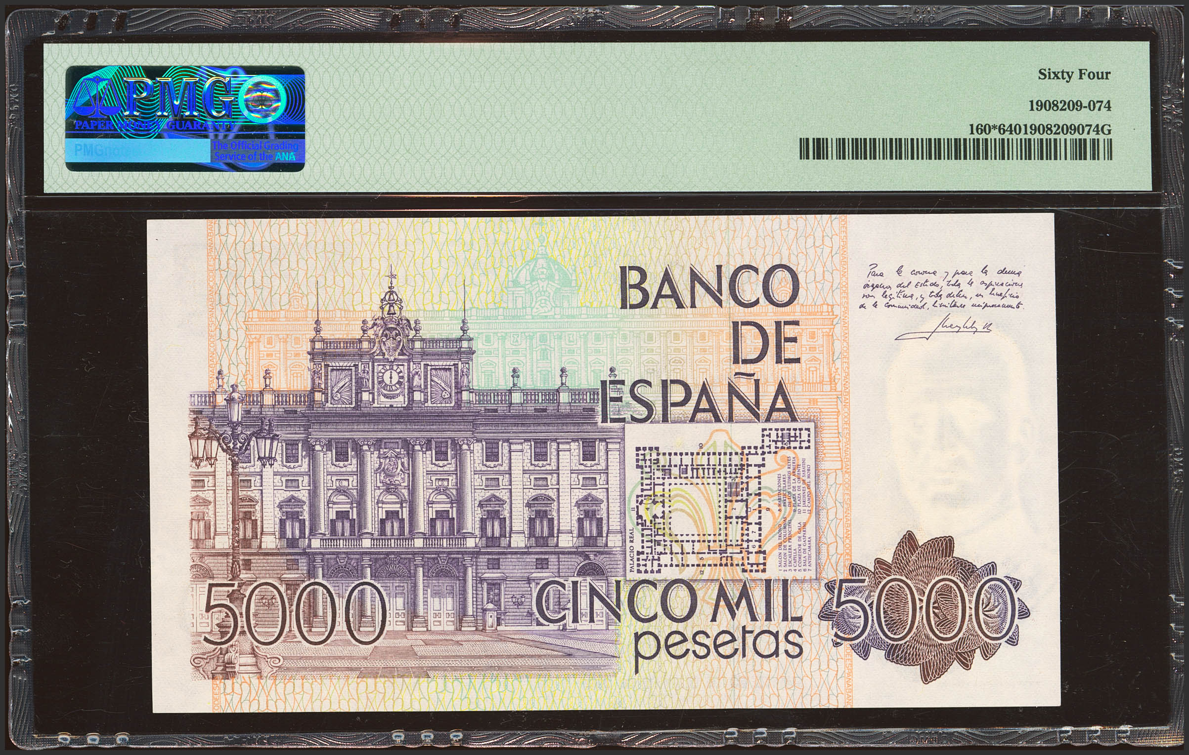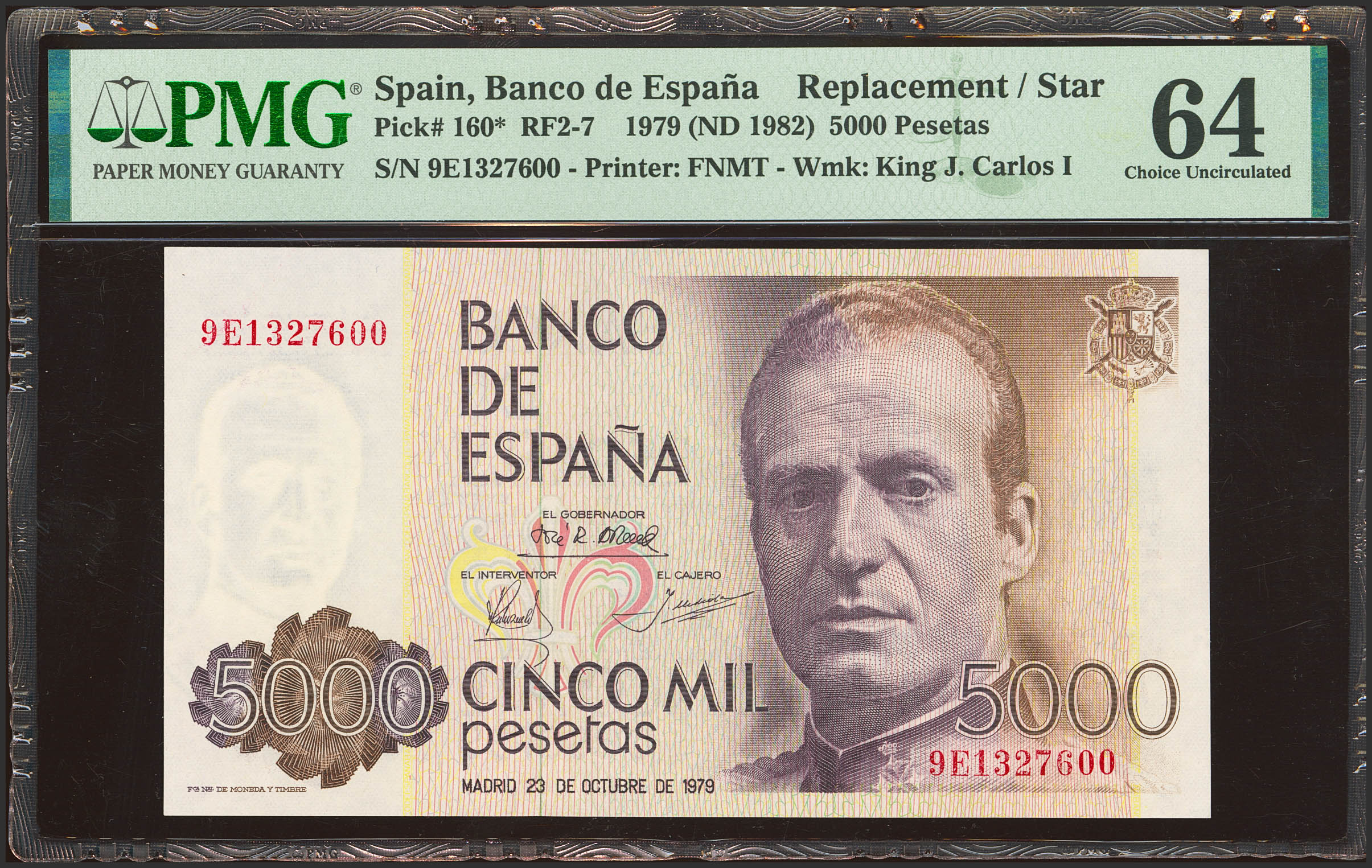 5000 Pesetas. 23 de Octubre de 1979. Serie especial 9E. (Edifil 2023: 478b, Pick: 160*). SC. Encapsulado PMG64.