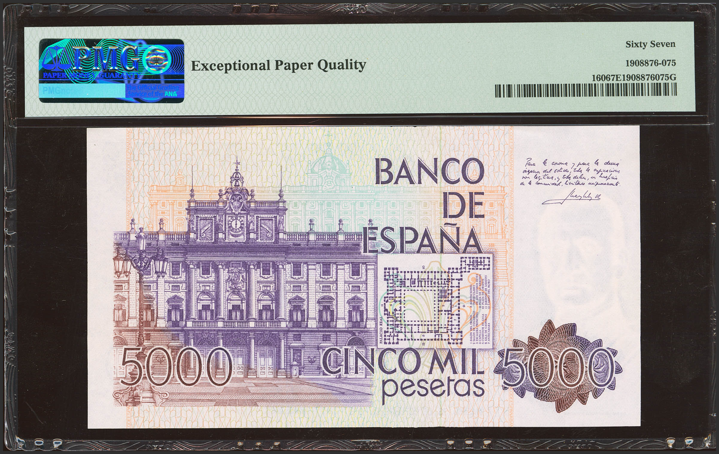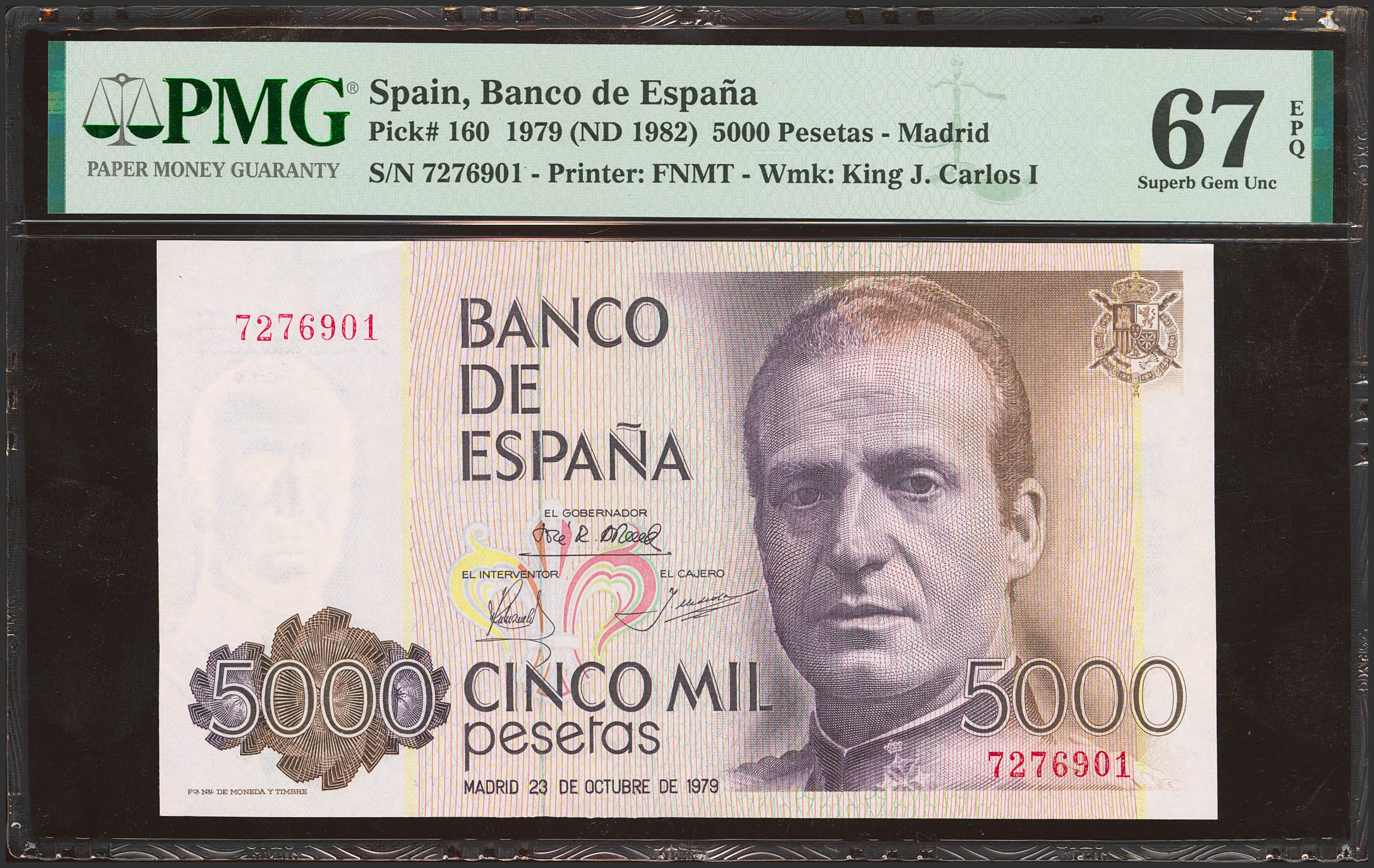 5000 Pesetas. 23 de Octubre de 1979. Sin serie. (Edifil 2023: 478, Pick: 160). Inusual en esta excepcional calidad. SC. Encapsulado PMG67EPQ.