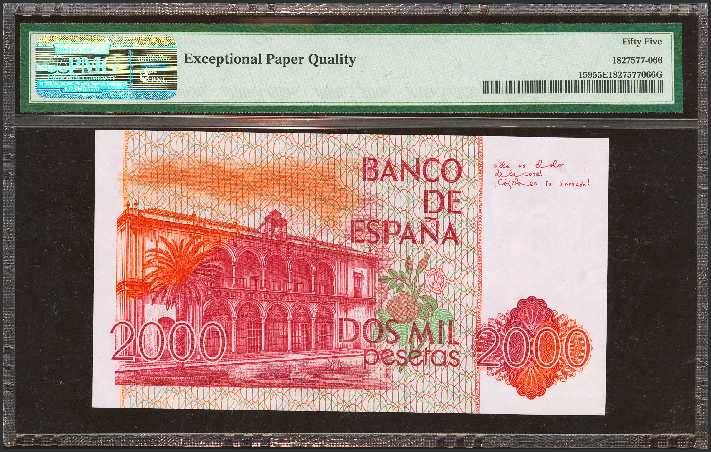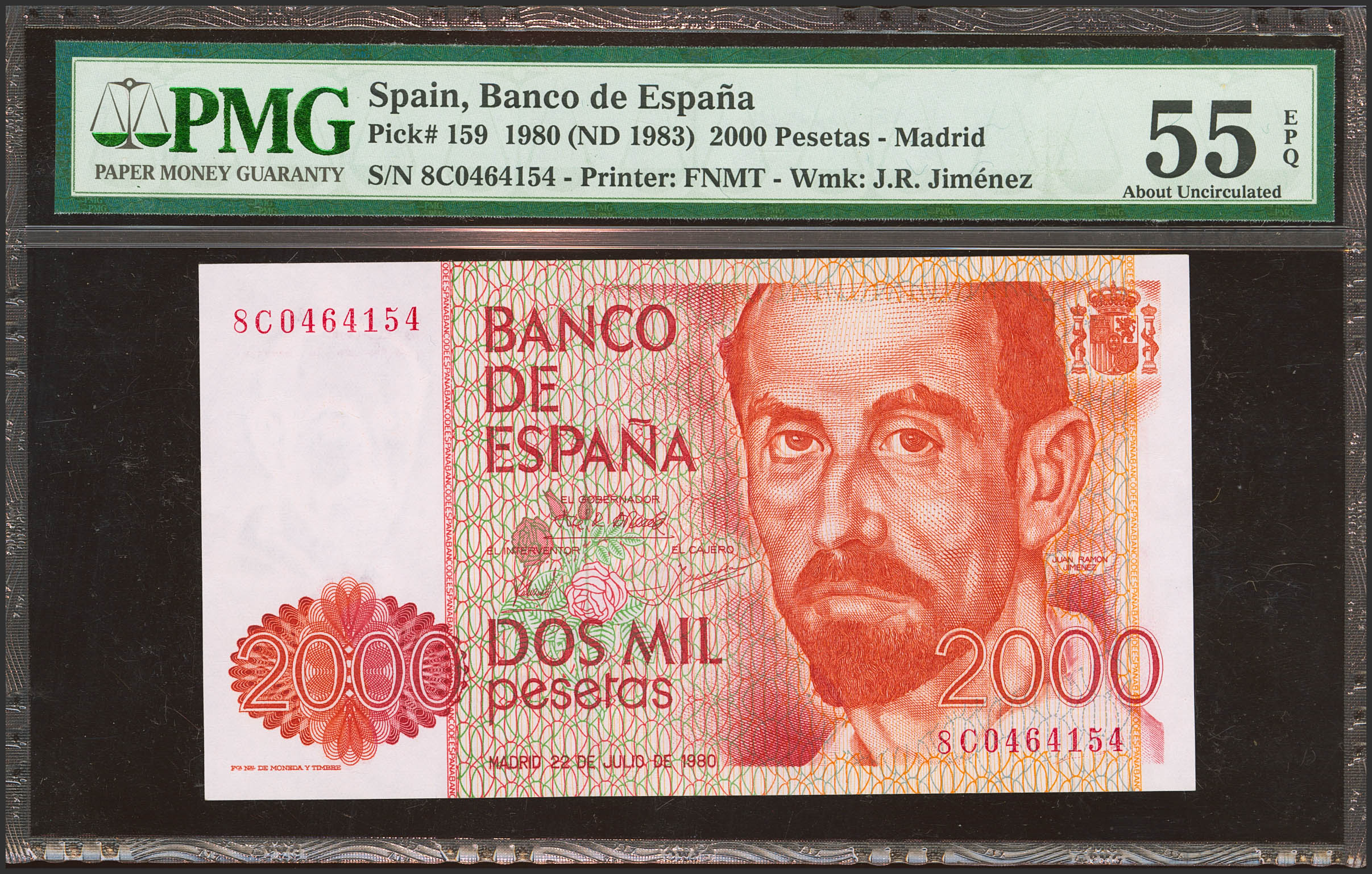 2000 Pesetas. 22 de Julio de 1980. Serie especial 8C. (Edifil 2023: 479c, Pick: 159exp). Extraordinariamente rara serie, para hacernos una idea de su rareza con la información estadística que disponemos nos atrevemos a afirmar que se trata, al menos, de una rareza tan importante como la serie 9B de Rosalía de Castro. EBC+. Encapsulado PMG55EPQ.