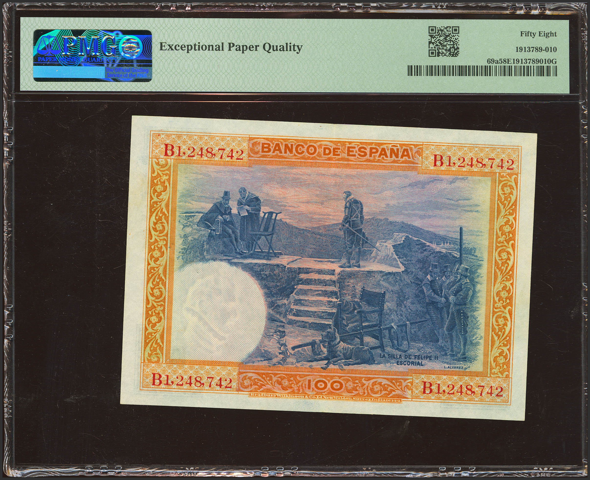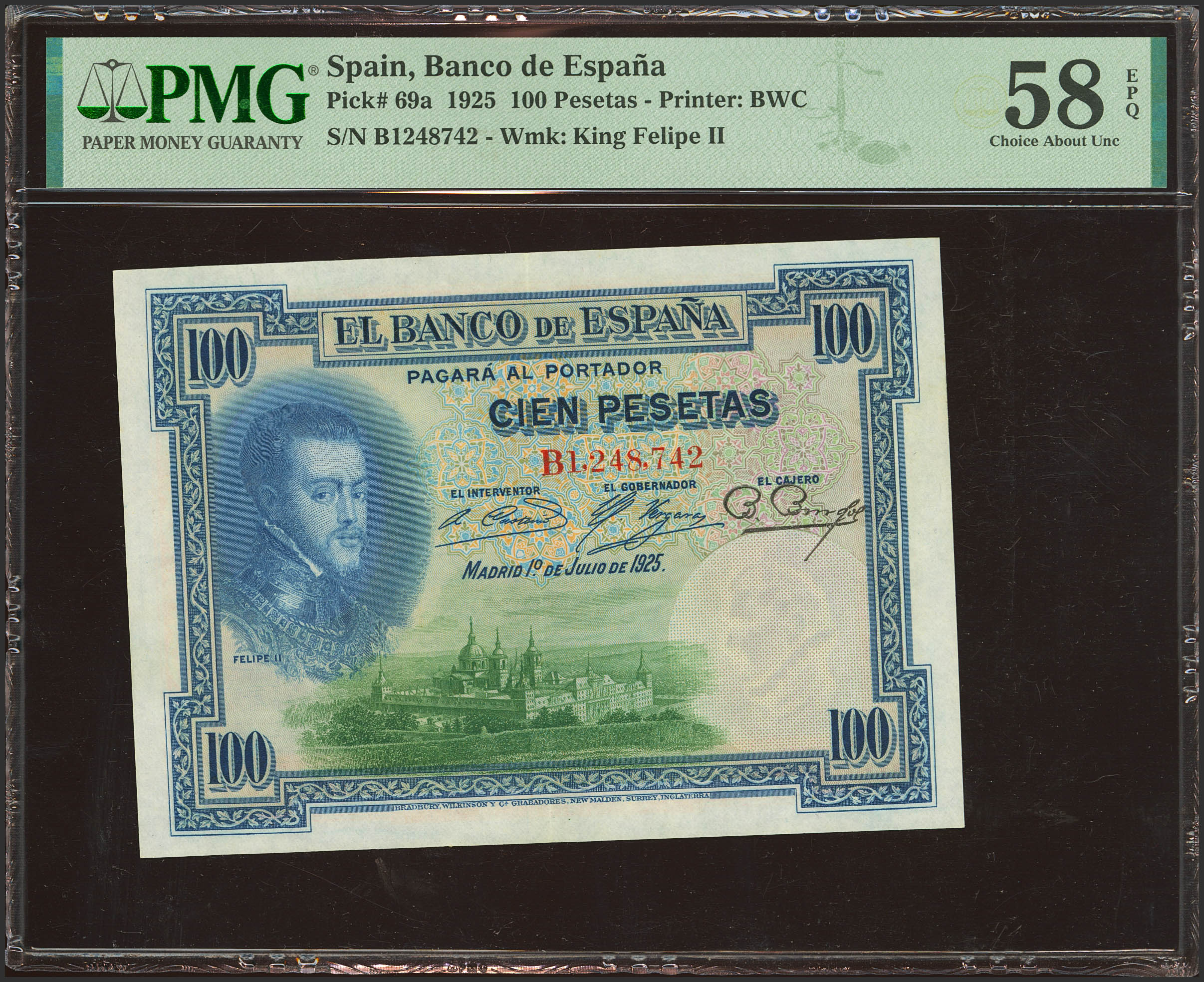 100 Pesetas. 1 de Julio de 1925. Serie B. (Edifil 2023: 323a, Pick: 69a). Inusual, apresto original. EBC+++. Encapsulado PMG58EPQ.
