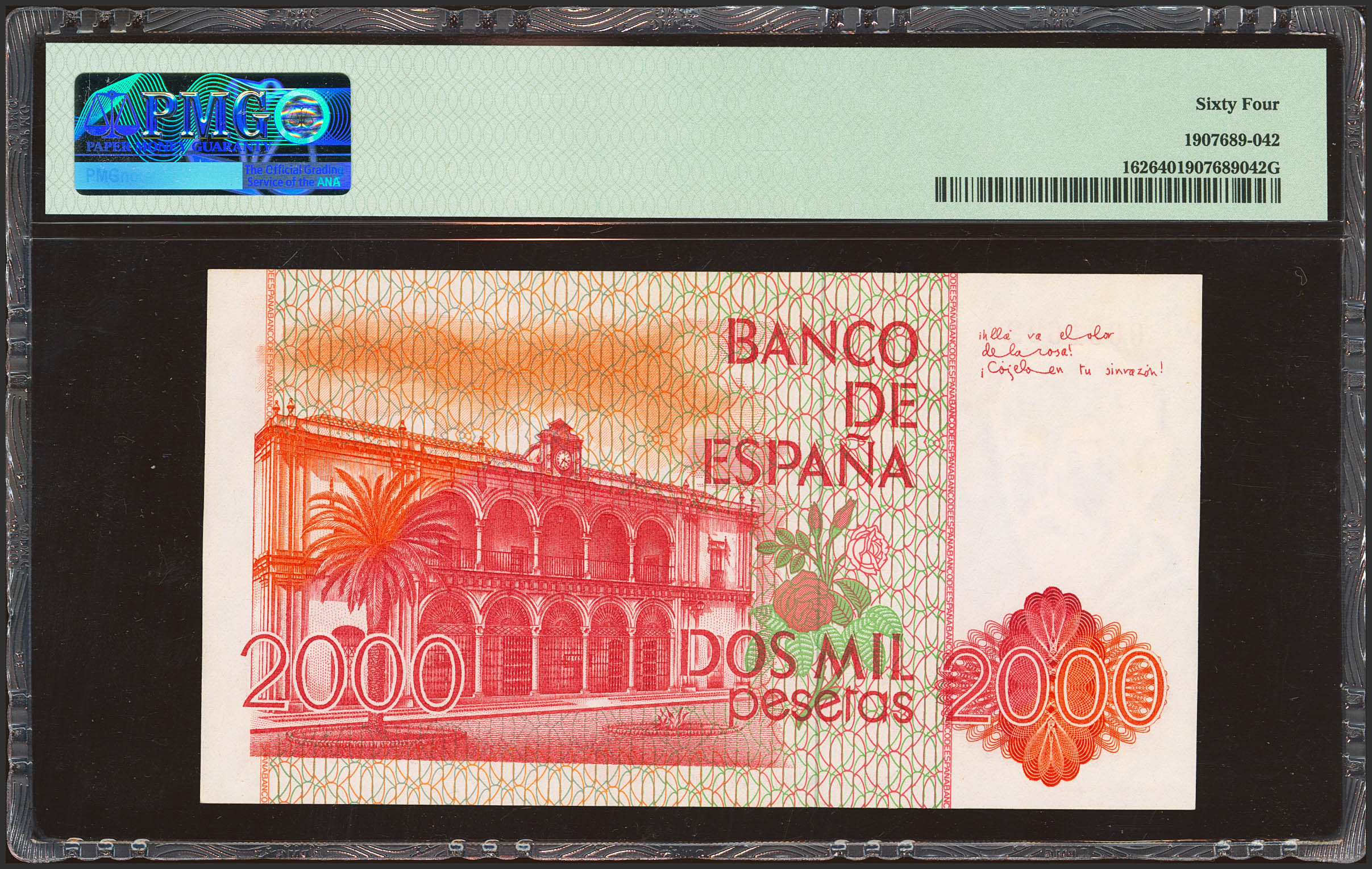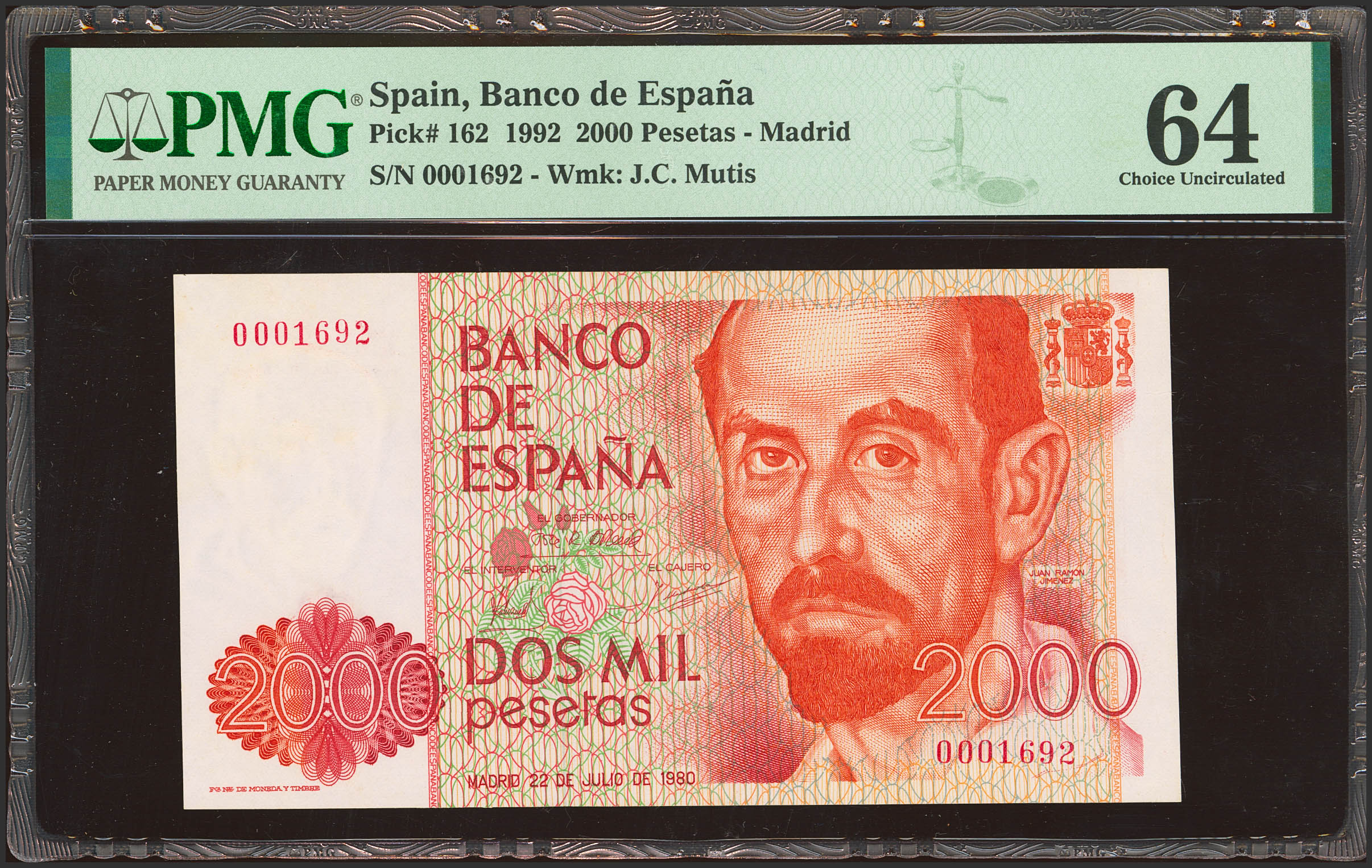 2000 Pesetas. 22 de Julio de 1980. Sin serie y numeración baja. (Edifil 2023: 479, Pick: 162). SC. Encapsulado PMG64.