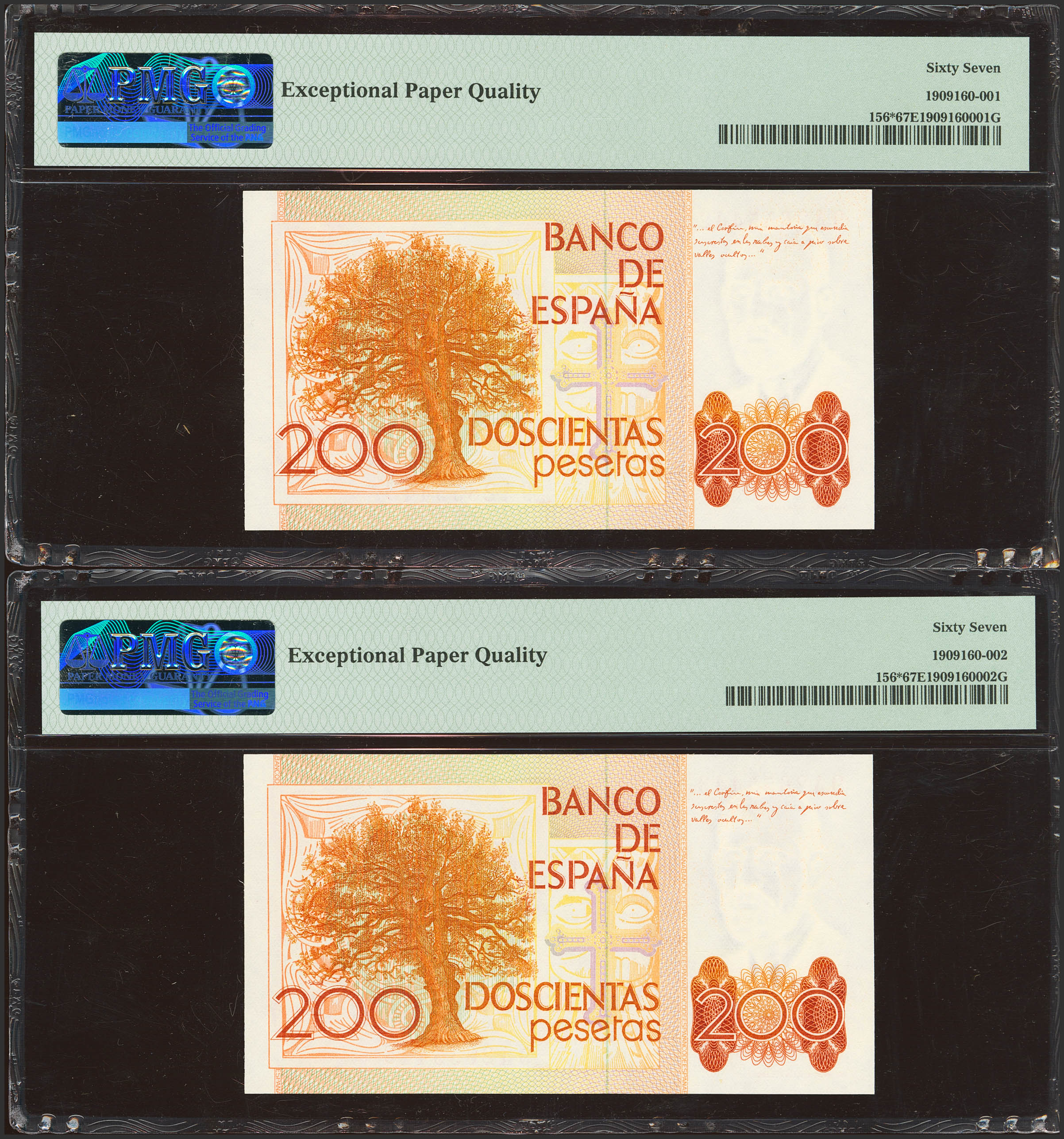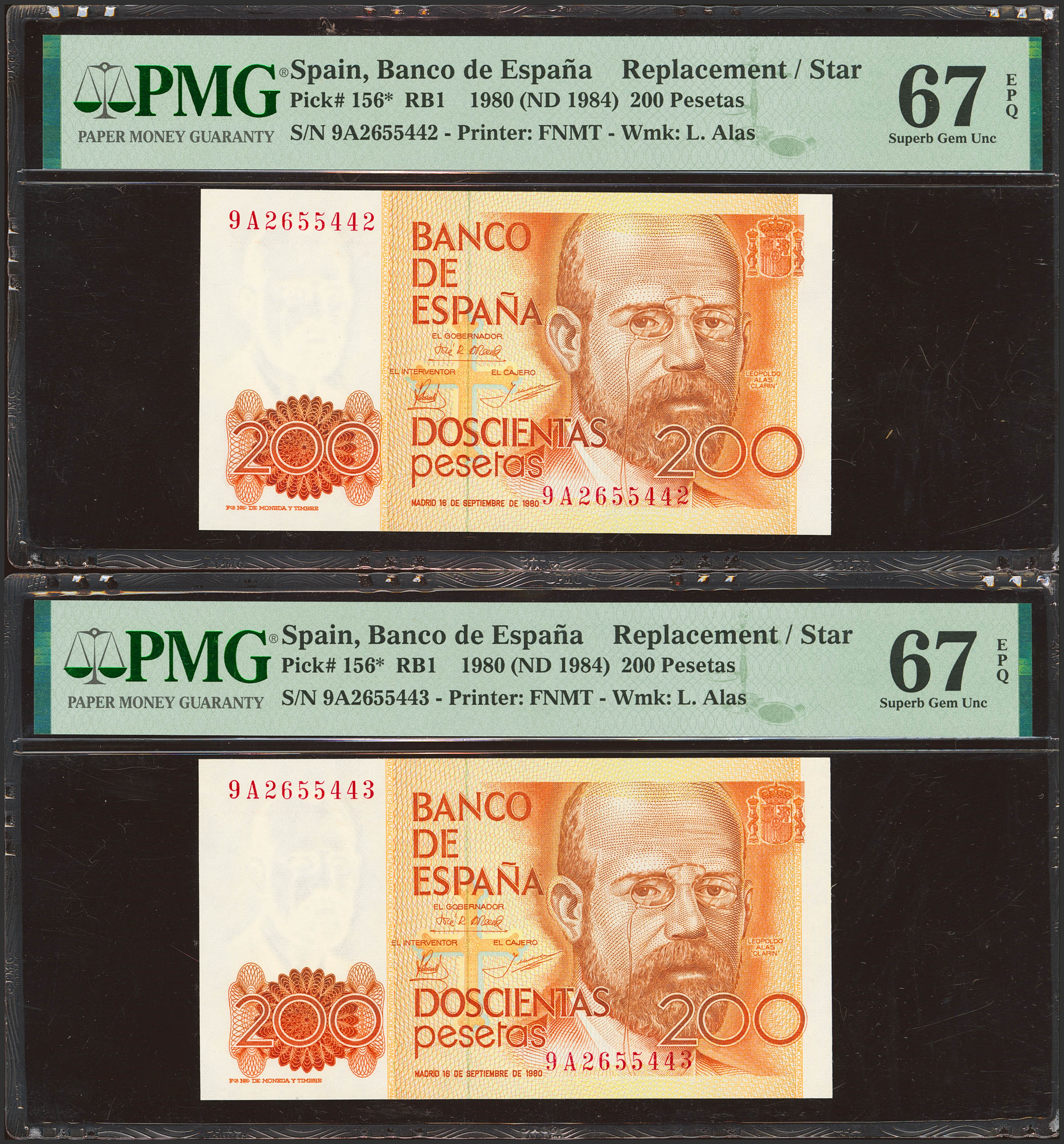 200 Pesetas. 16 de Septiembre de 1980. Pareja correlativa. Serie especial 9A. (Edifil 2023: 480b, Pick: 156*). SC. Encapsulados PMG67EPQ, ambos.