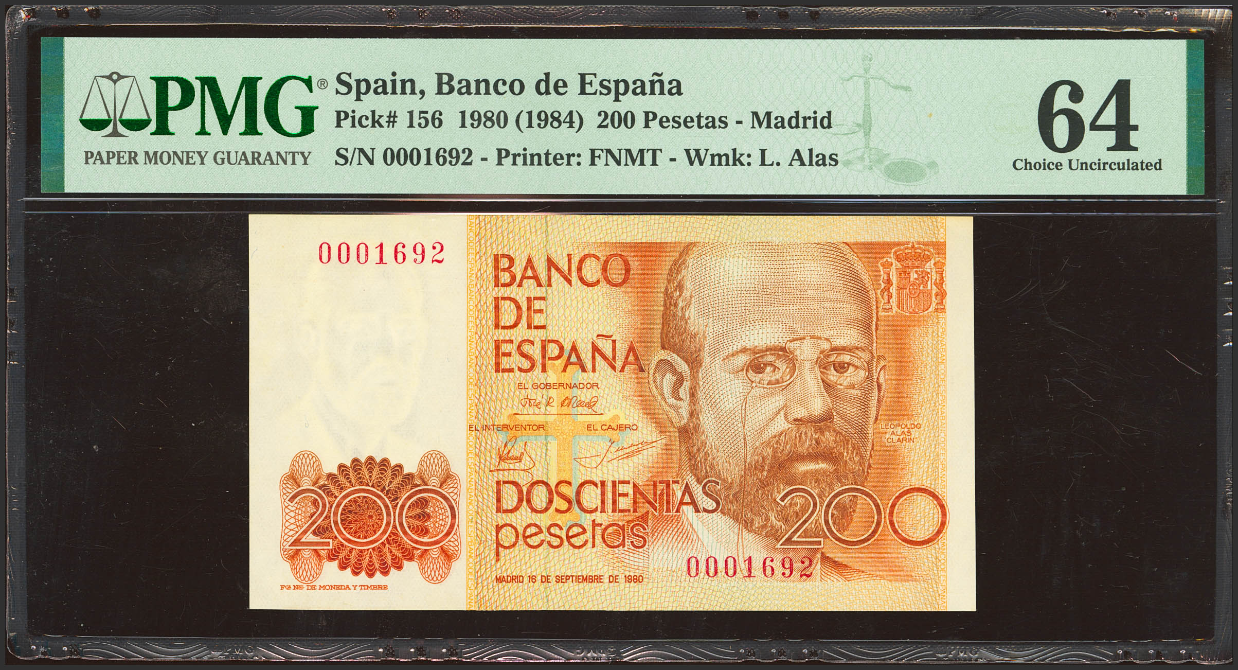 200 Pesetas. 16 de Septiembre de 1980. Sin serie y numeración baja. (Edifil 2023: 480, Pick: 156). SC. Encapsulado PMG64.