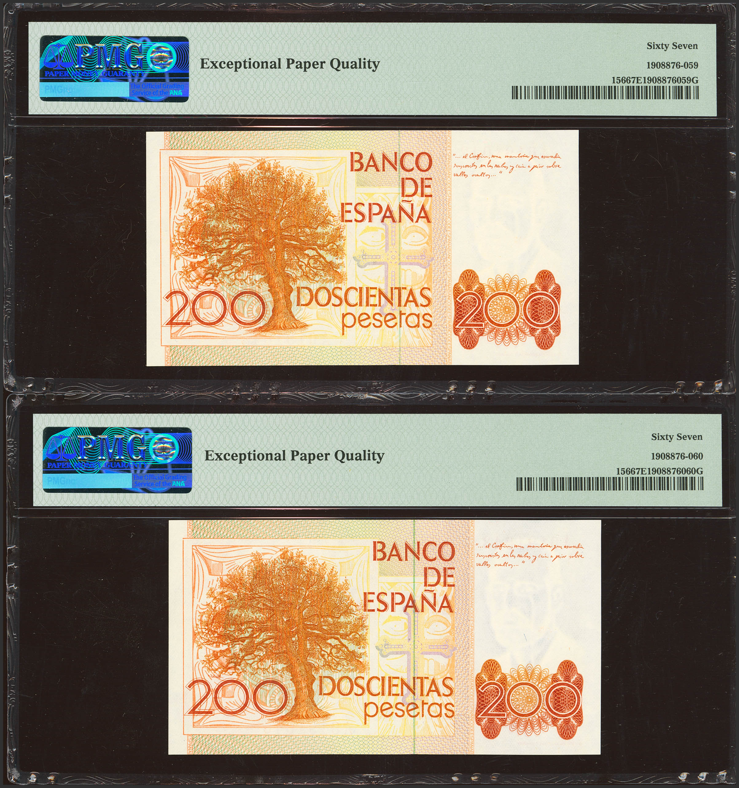 200 Pesetas. 16 de Septiembre de 1980. Pareja correlativa. Serie A. (Edifil 2023: 480a, Pick: 156). SC. Encapsulados PMG67EPQ, ambos.
