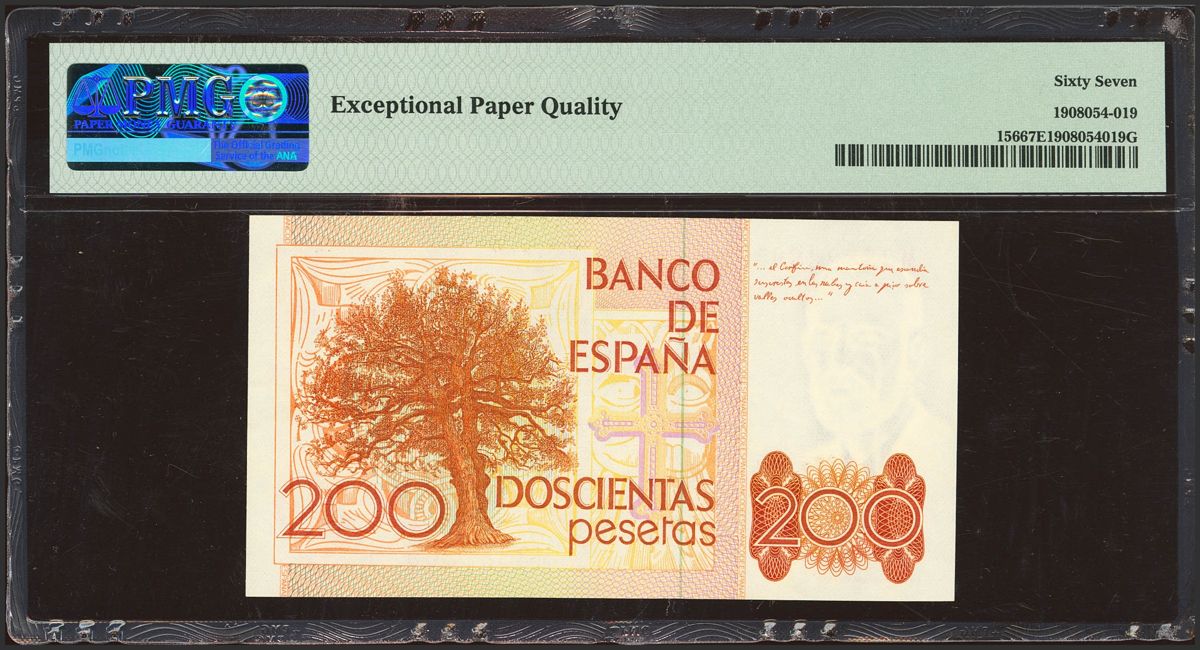 200 Pesetas. 16 de Septiembre de 1980. Serie M, última serie emitida. (Edifil 2023: 480a, Pick: 156). SC. Encapsulado PMG67EPQ.