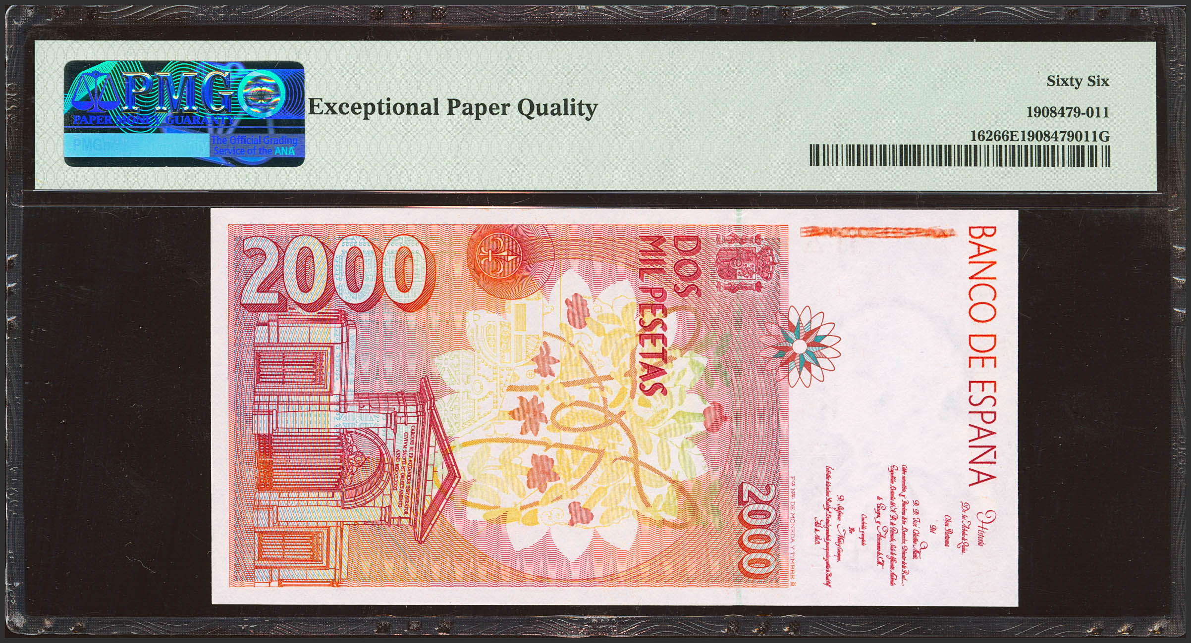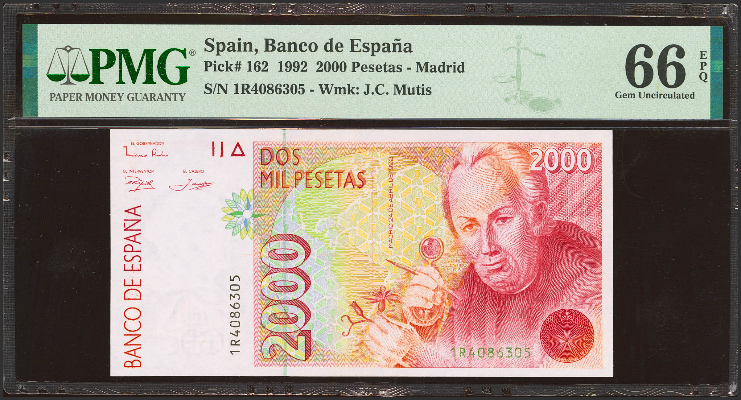 2000 Pesetas. 24 de Abril de 1992. Serie 1R, última serie emitida. (Edifil 2023: 482aa, Pick: 162). Raro. SC. Encapsulado PMG66EPQ.