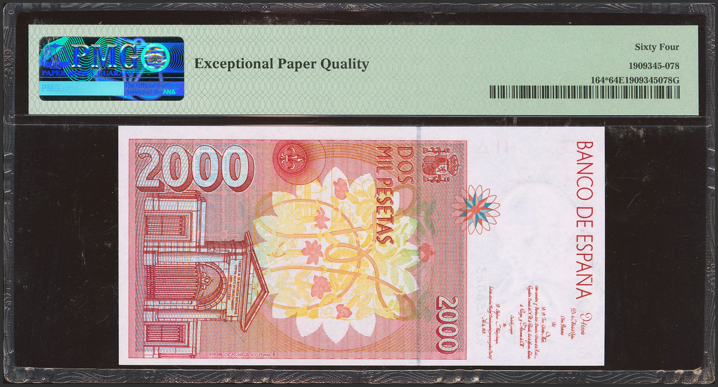 2000 Pesetas. 24 de Abril de 1992. Serie especial 9D (diseño modificado en 1995). (Edifil 2023: 482Ac, Pick: 164*). SC. Encapsulado PMG64EPQ.
