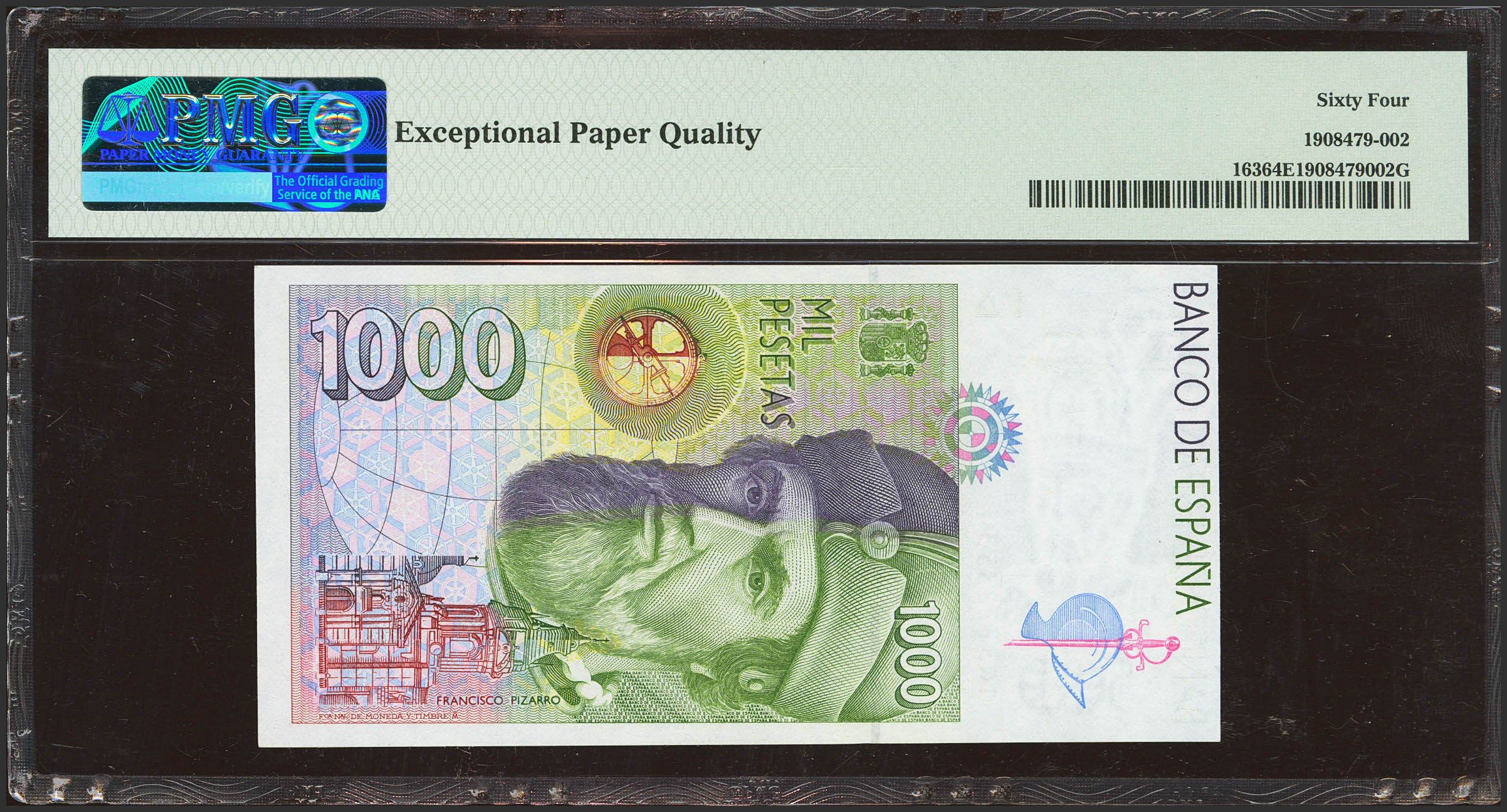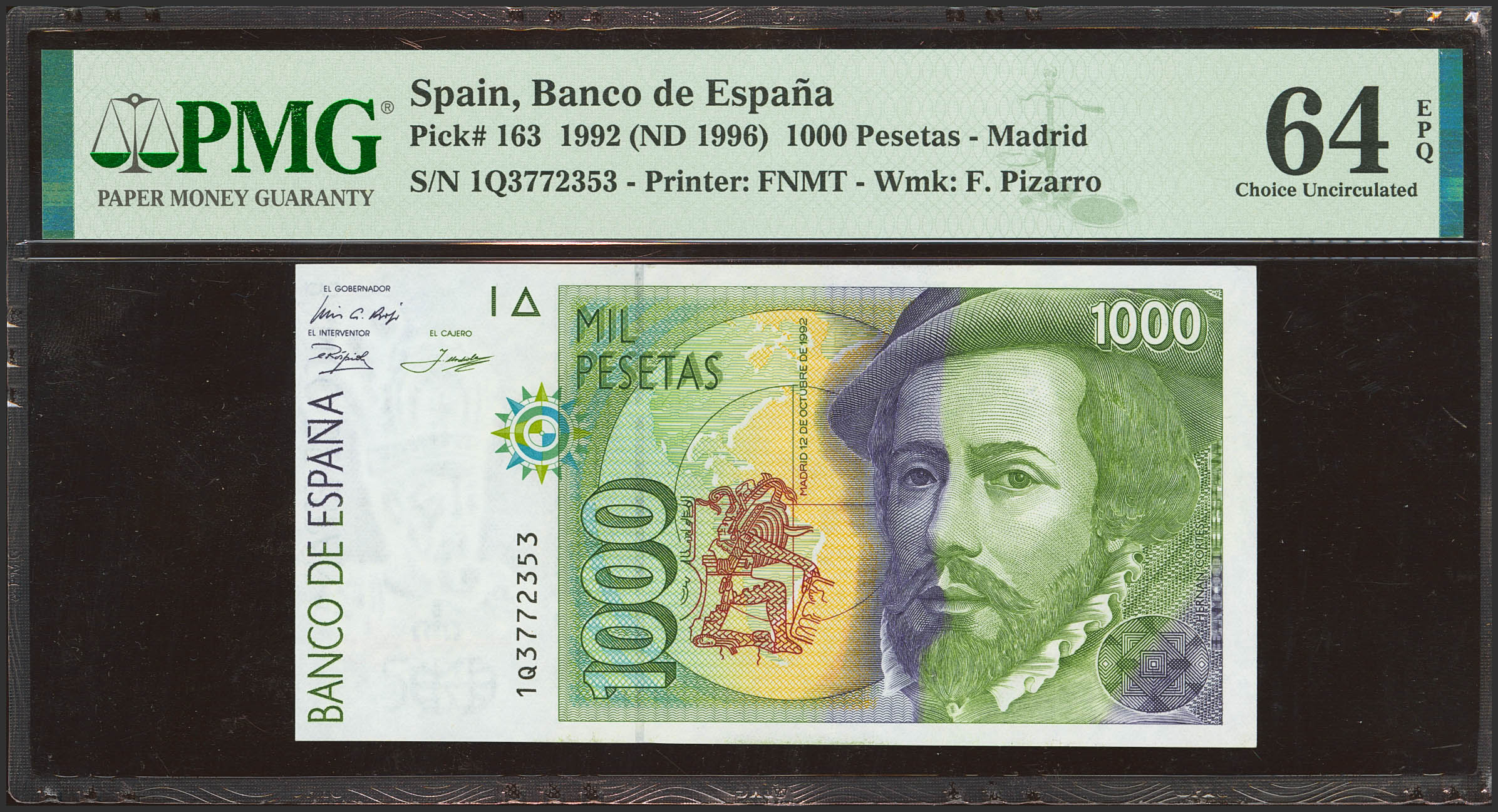 1000 Pesetas. 12 de Octubre de 1992. Serie 1Q. (Edifil 2023: 483a, Pick: 163). SC. Encapsulado PMG64EPQ.