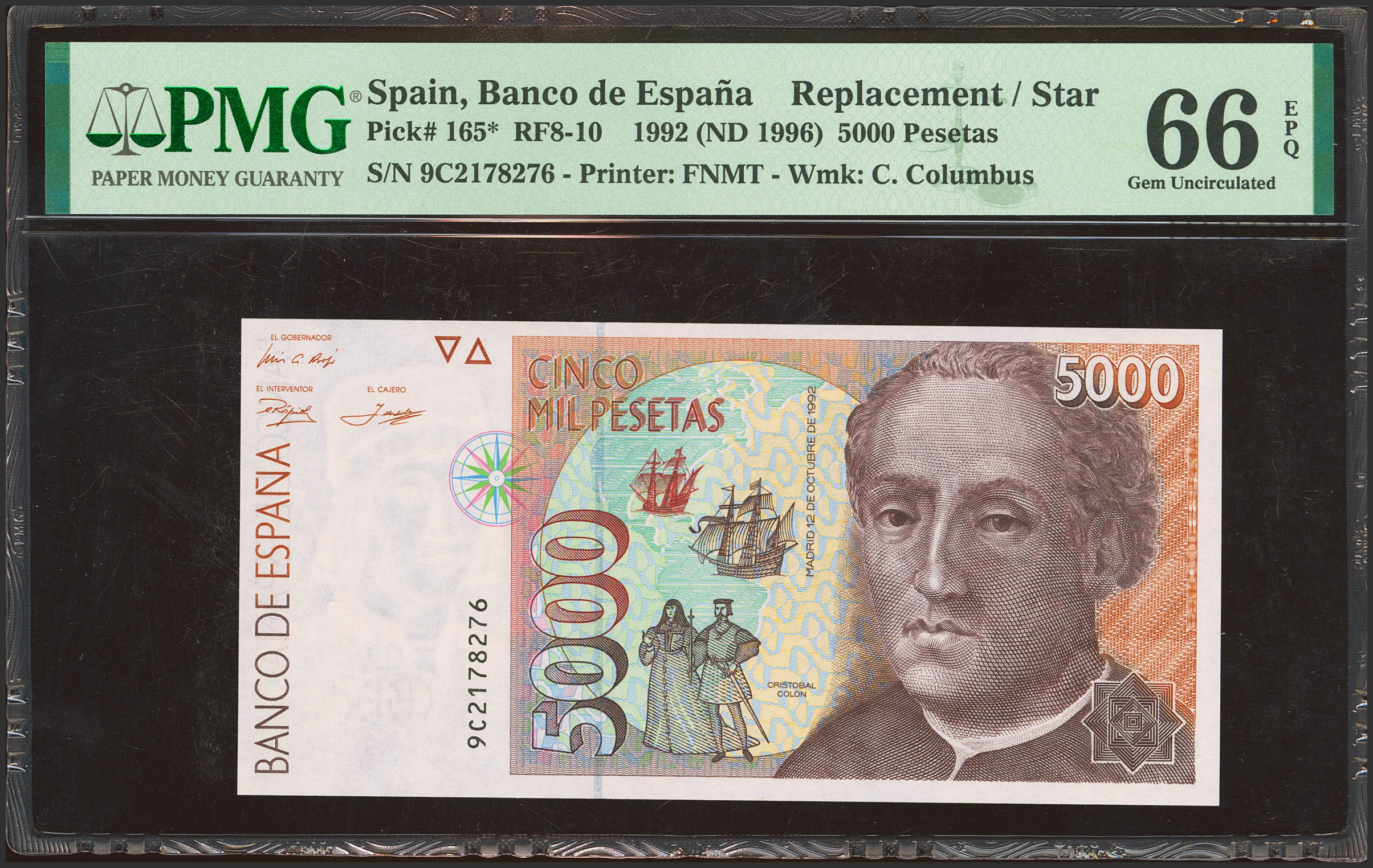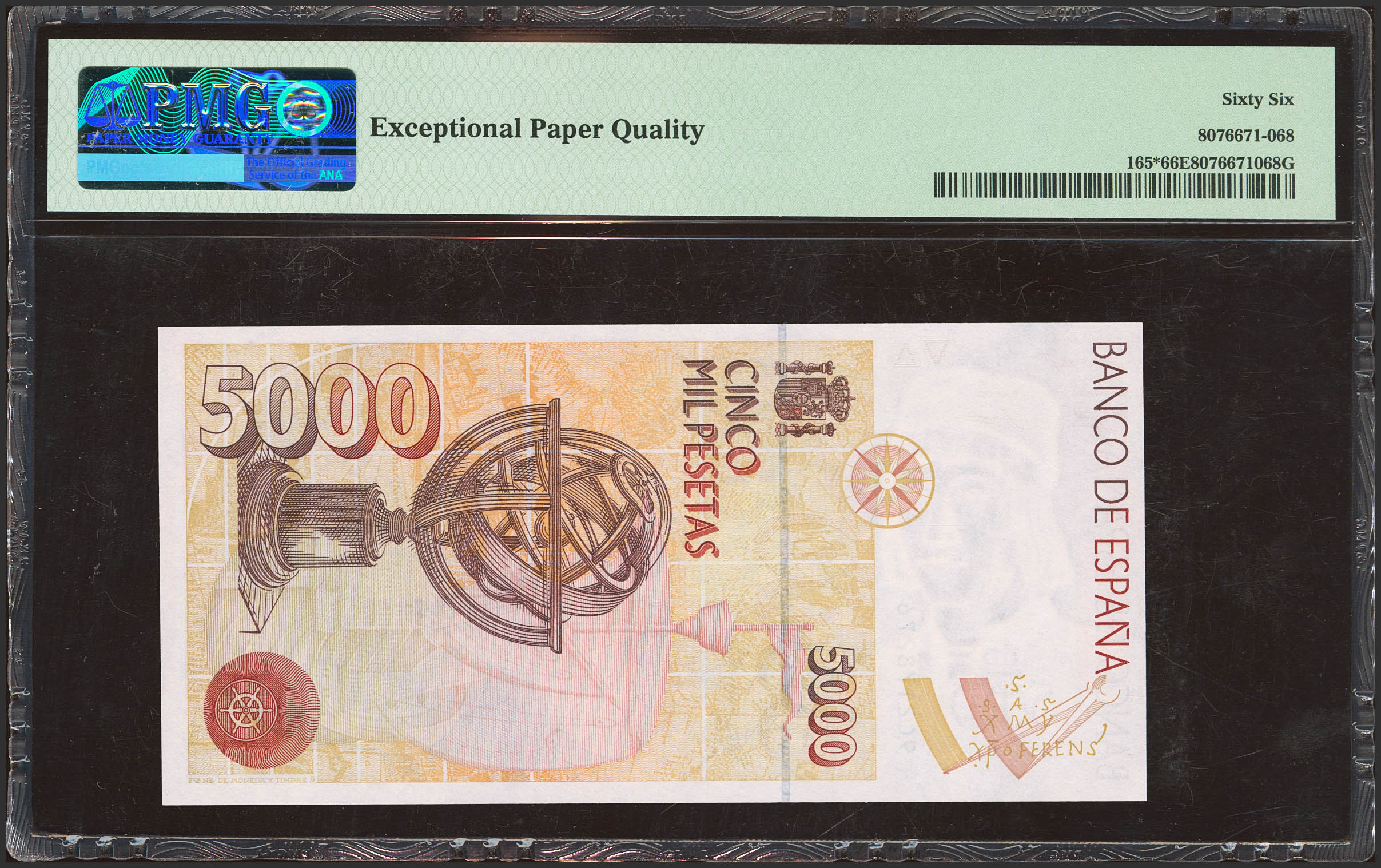 5000 Pesetas. 12 de Octubre de 1992. Serie especial 9C. (Edifil 2023: 484b, Pick: 165*). Inusual en esta excepcional calidad. SC. Encapsulado PMG66EPQ.
