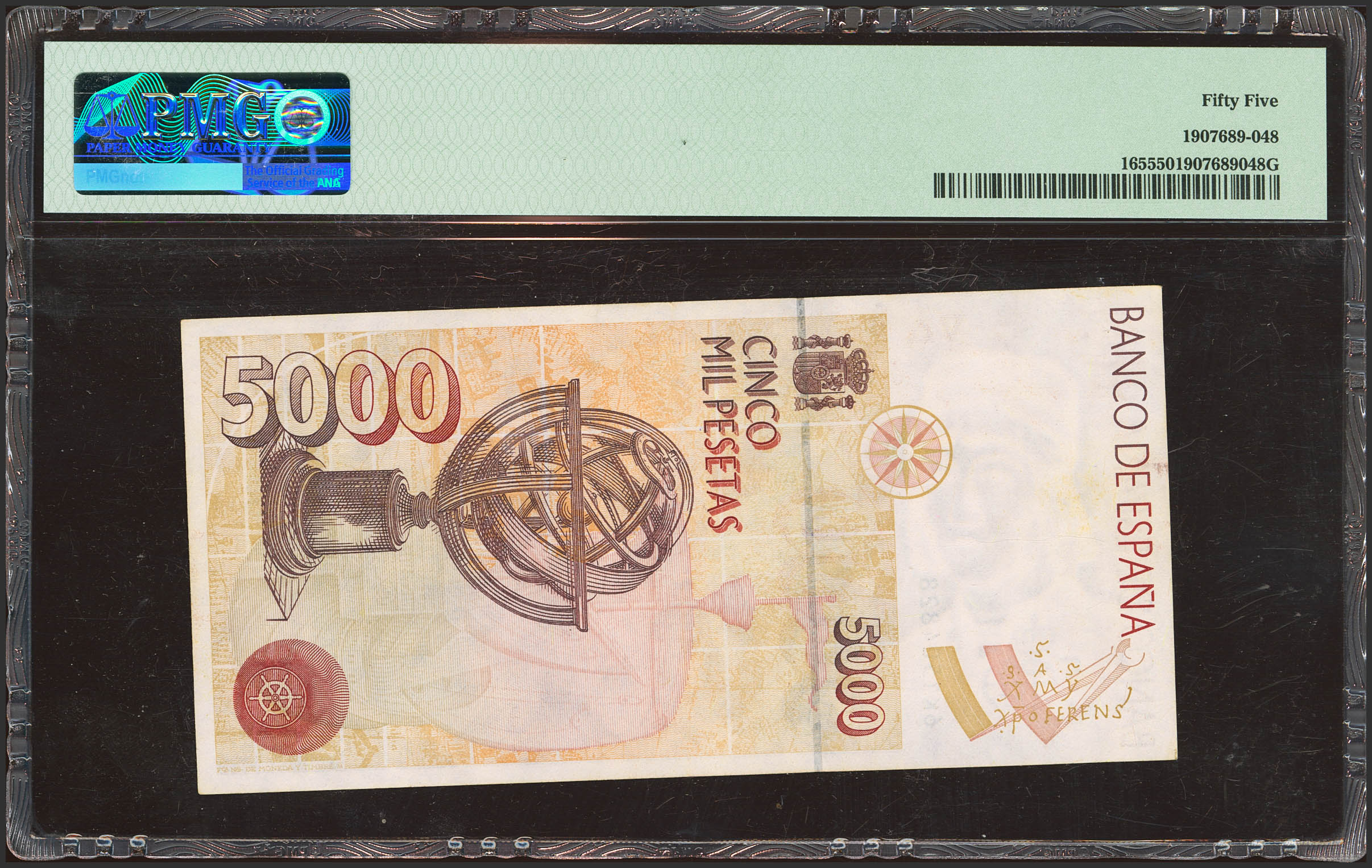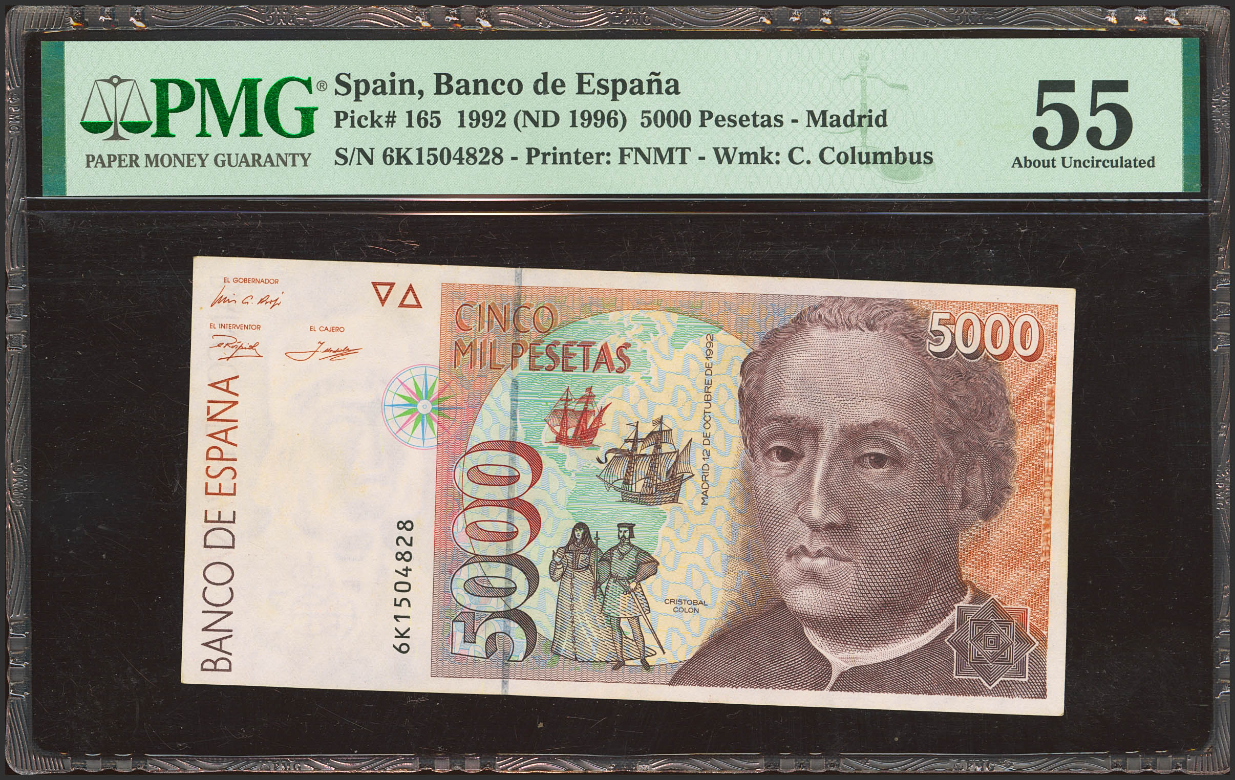 5000 Pesetas. 12 de Octubre de 1992. Serie 6K, última serie emitida. (Edifil 2023: 484aa, Pick: 165). EBC+. Encapsulado PMG55.