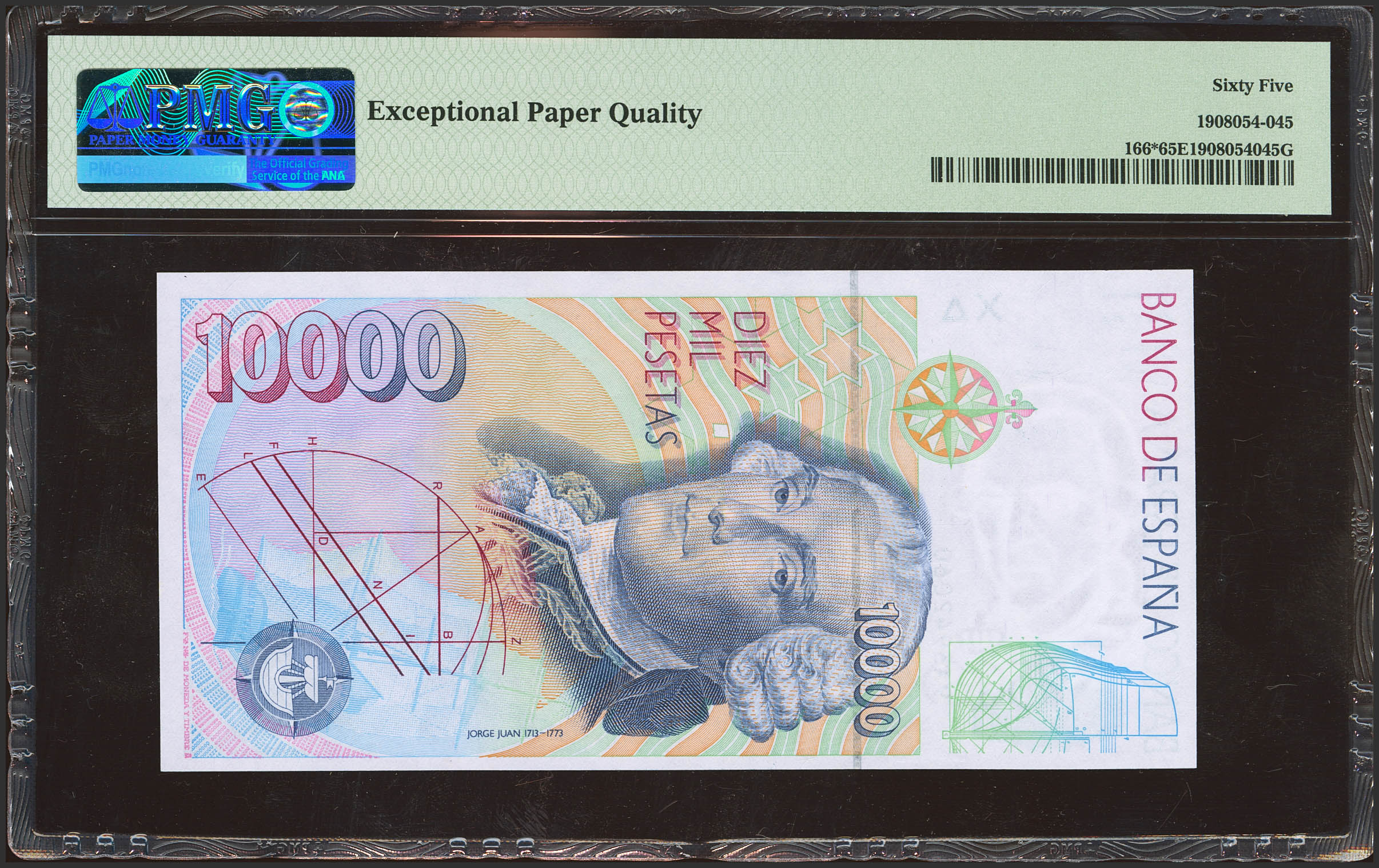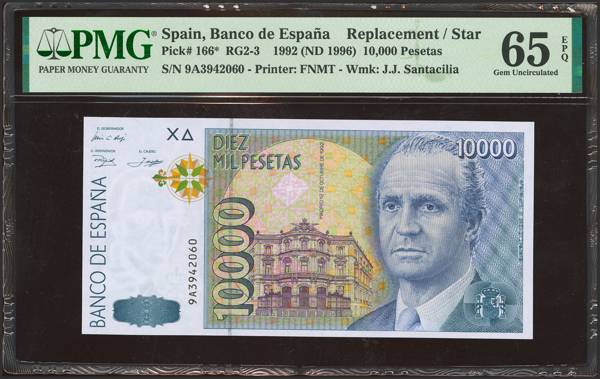 10000 Pesetas. 12 de Octubre de 1992. Serie especial 9A. (Edifil 2021: 485b, Pick: 166*). Raro en esta excepcional calidad. SC. Encapsulado PMG65EPQ.