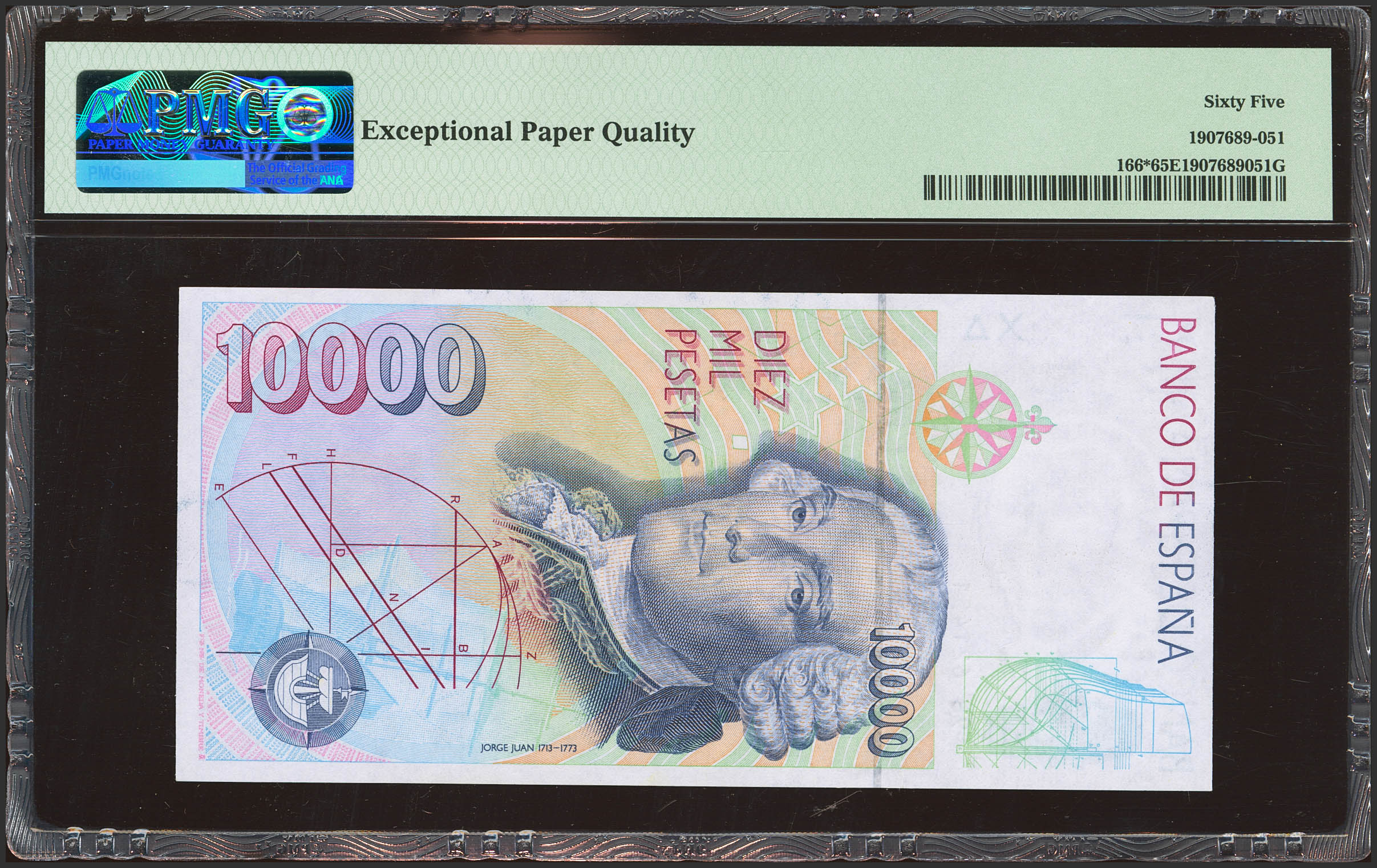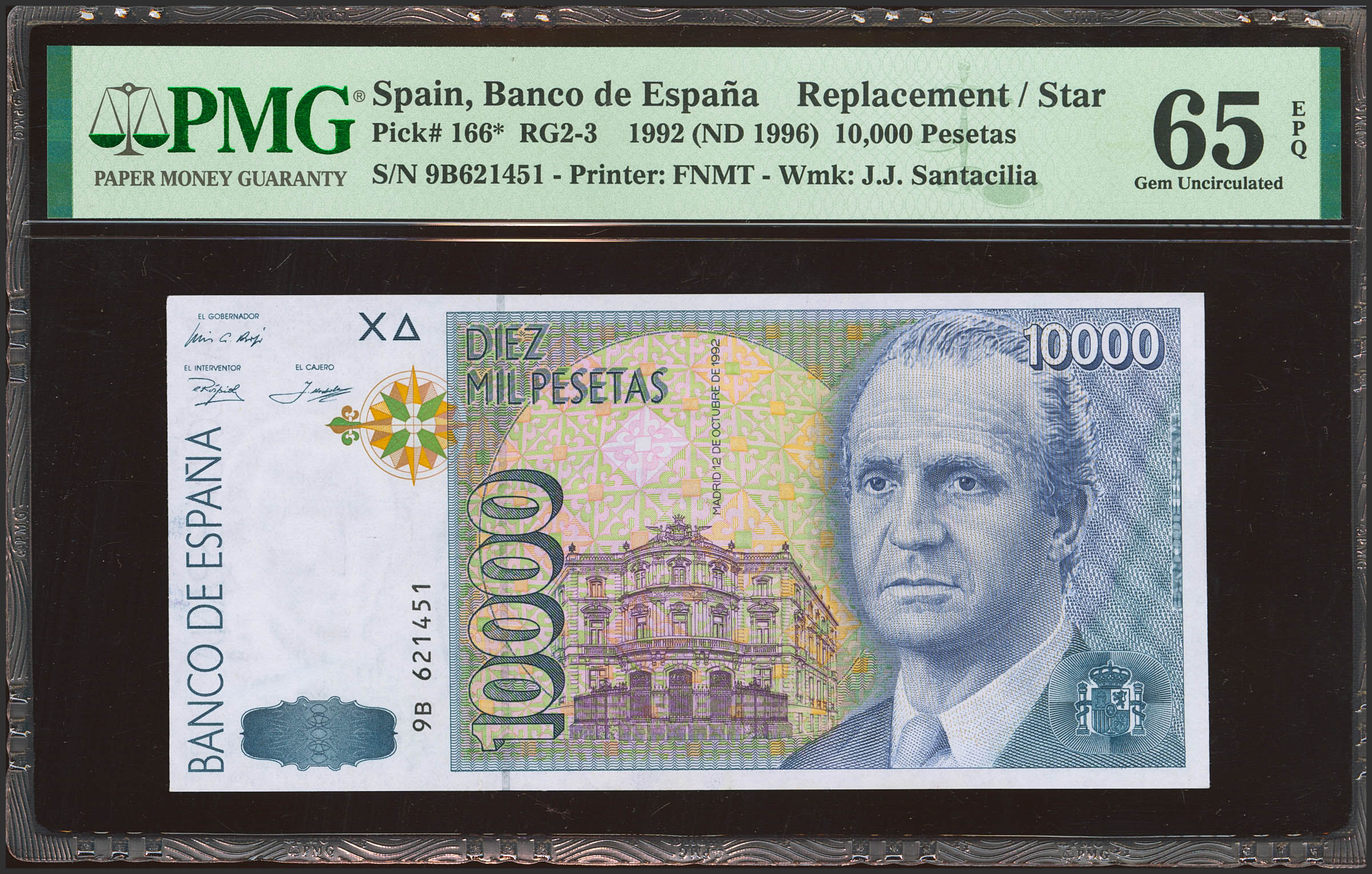 10000 Pesetas. 12 de Octubre de 1992. Serie especial 9B. (Edifil 2023: 485b, Pick: 166*). Rara serie. SC. Encapsulado PMG65EPQ.