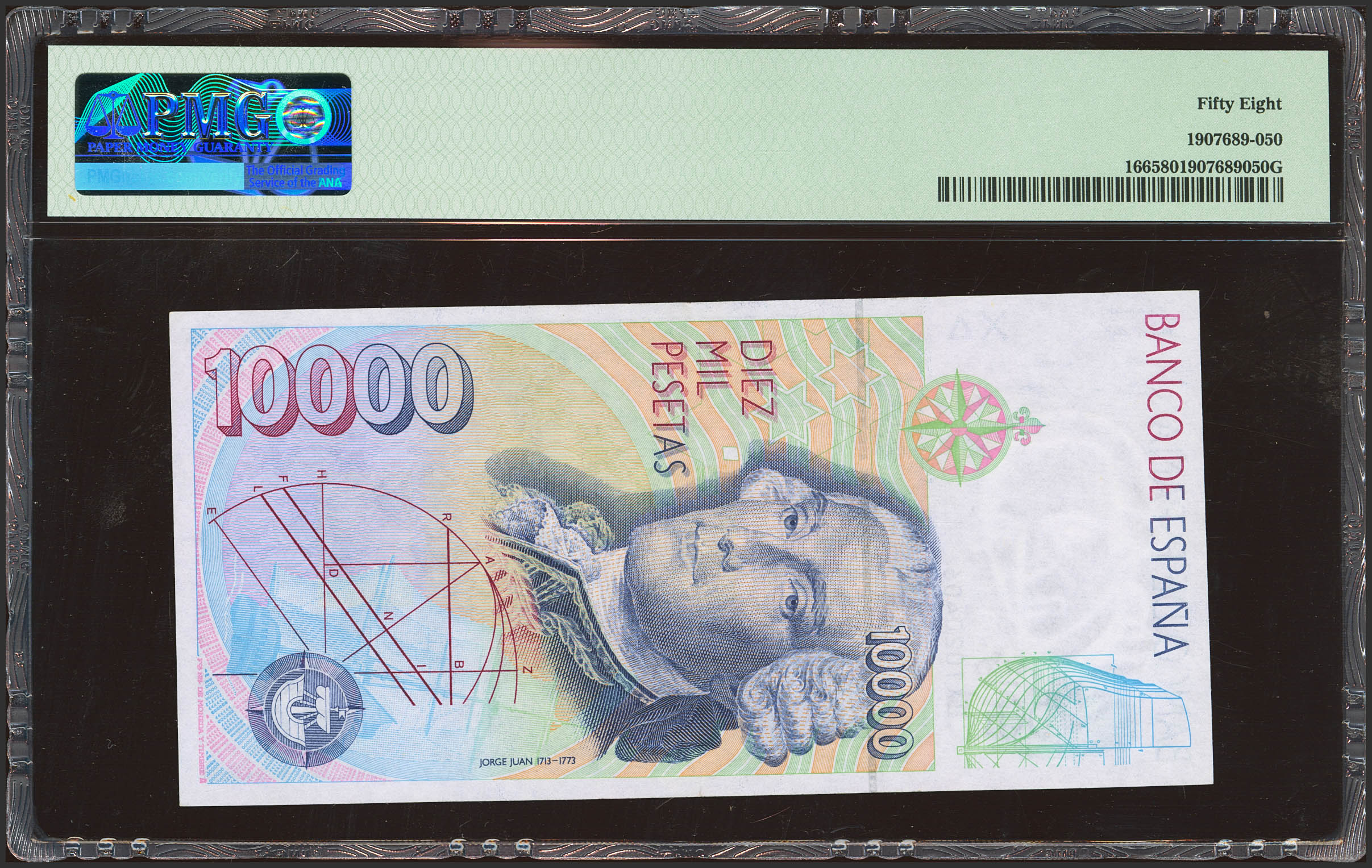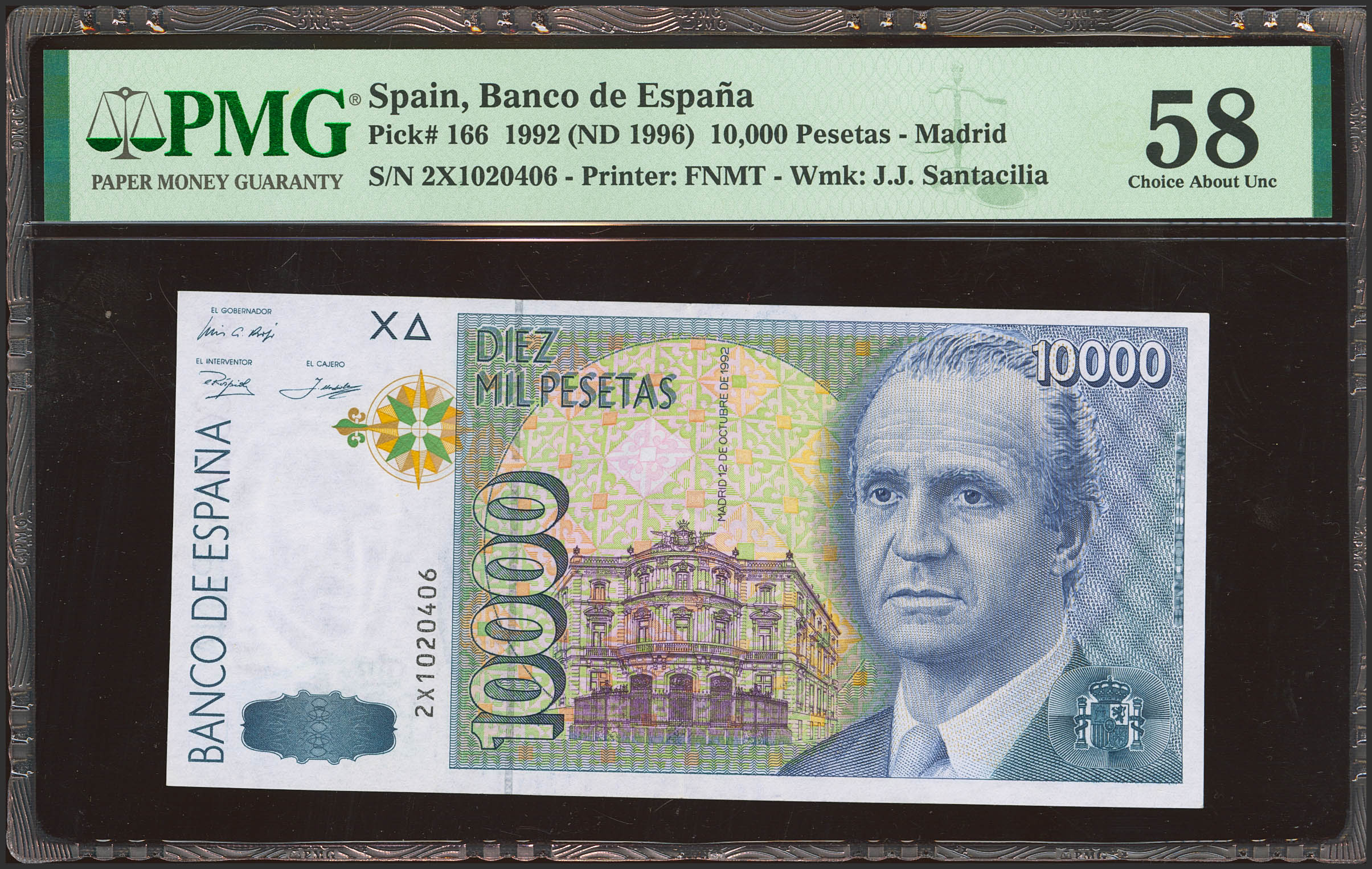 10000 Pesetas. 12 de Octubre de 1992. Serie 2X, última serie emitida. (Edifil 2023: 485aa, Pick: 166). Rara serie. EBC++. Encapsulado PMG58.