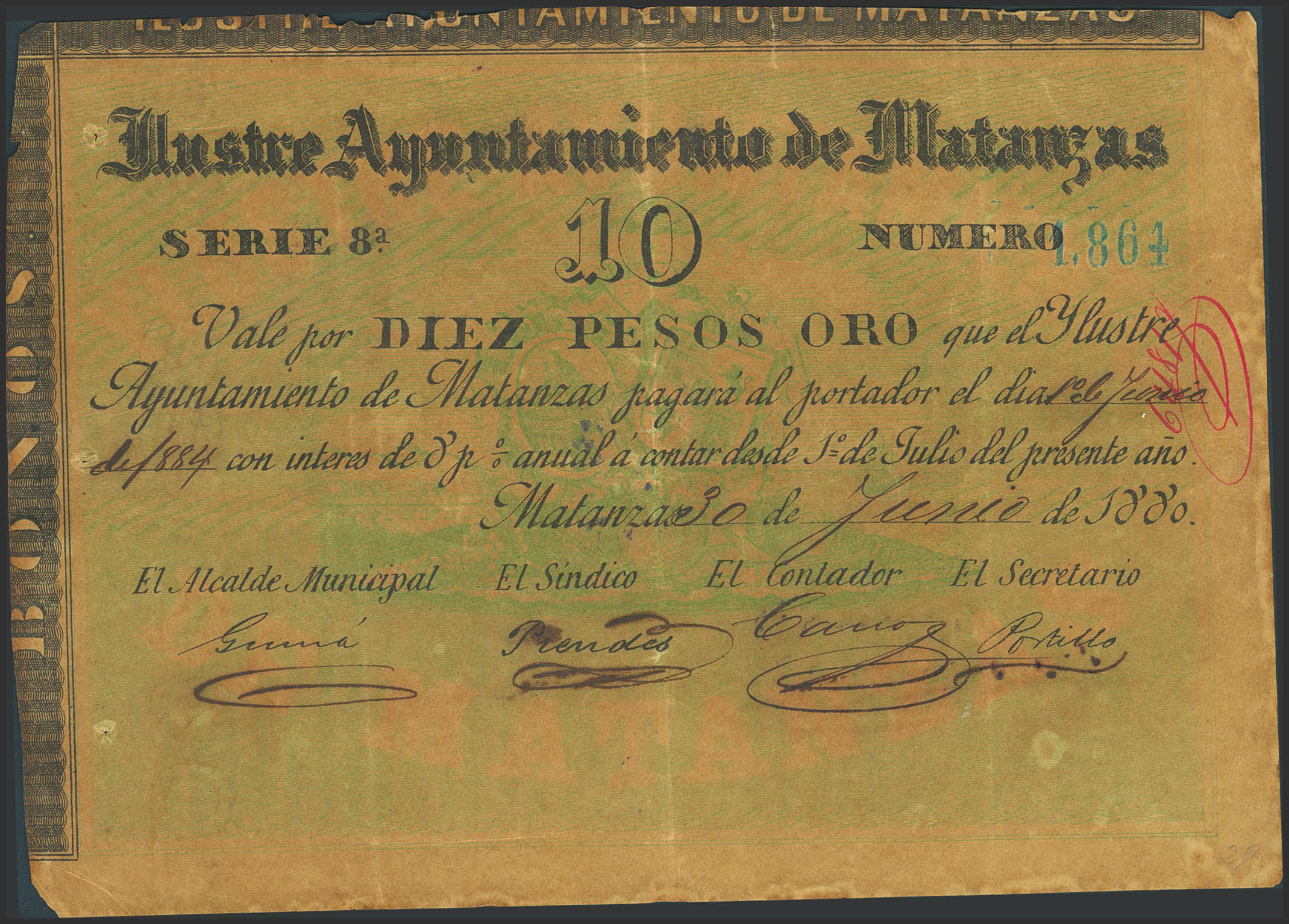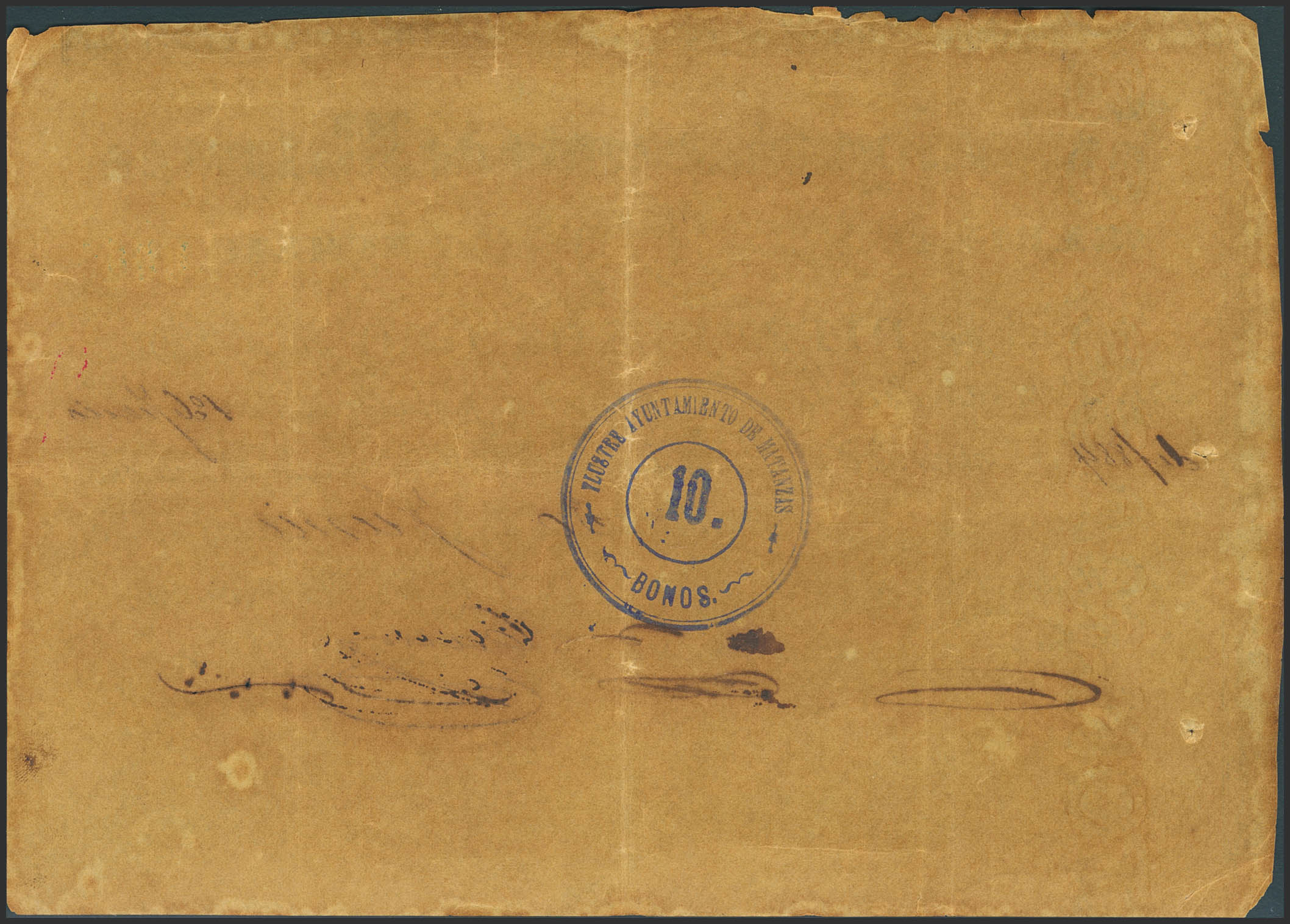 AYUNTAMIENTO DE MATANZAS. 10 Pesos oro. 30 de Junio de 1880. (Pick: Unlisted). Rarísimo bono que llego a circular como billete, con sus firmas correspodientes. MBC.