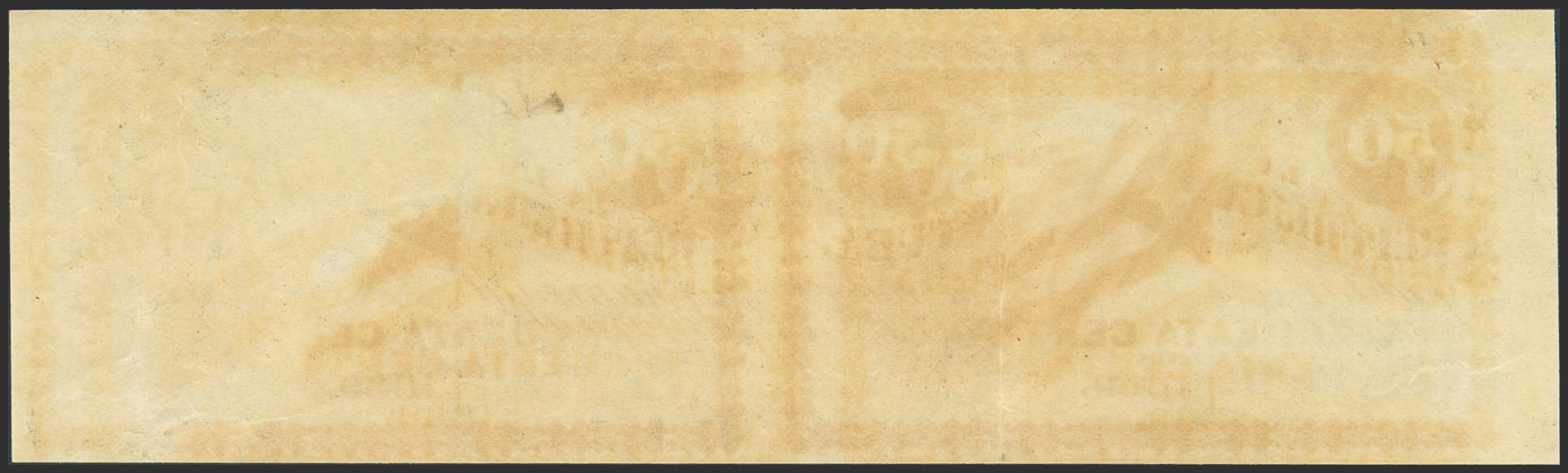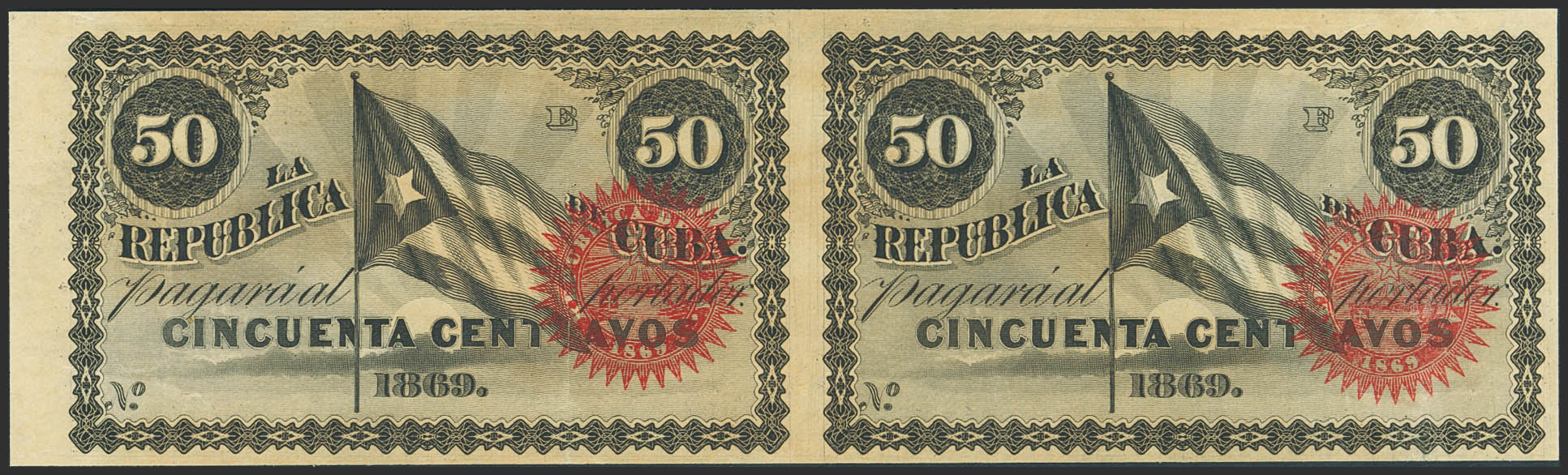 REPUBLICA DE CUBA. Conjunto de 2 billetes correlativos de 50 Centavos (sin desprender), emitidos en 1869. Serie F y sin numeración. (Edifil 2023: 30). Inusual. SC/EBC+++.