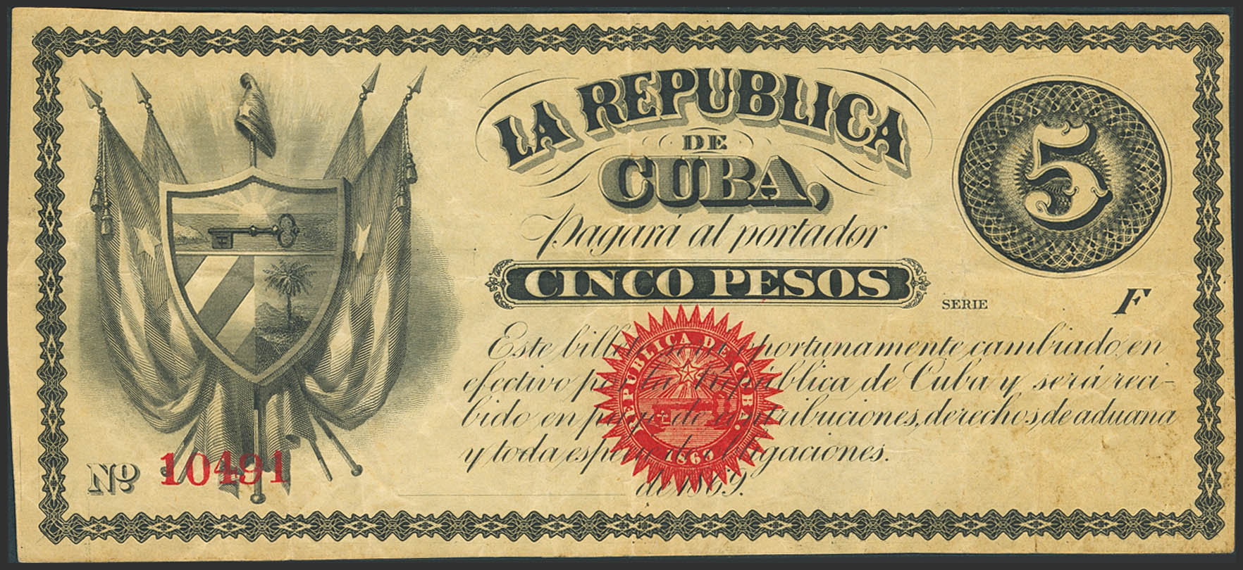 REPUBLICA DE CUBA. 5 Pesos. 1869 (sin fecha). Serie F. (Edifil 2023: 32). MBC.