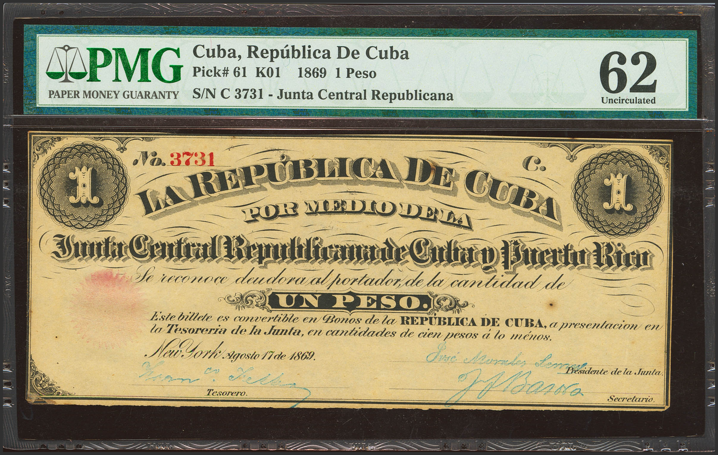 REPUBLICA DE CUBA. 1 Peso. 17 de Agosto de 1869. Serie C. (Edifil 2023: 35, Pick: 62). Rarísimo en esta excepcional calidad. SC-. Encapsulado PMG62 (faded seal).