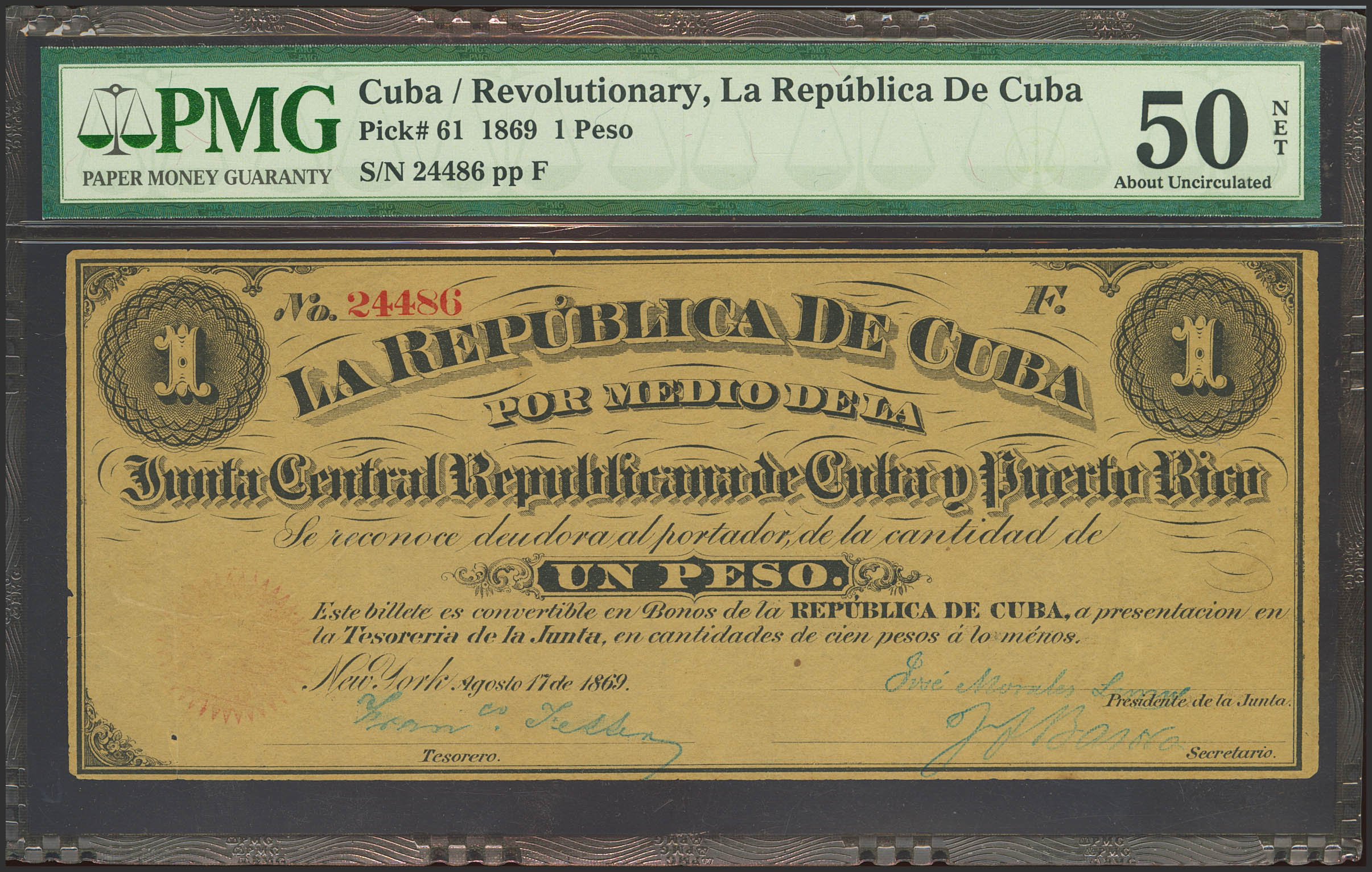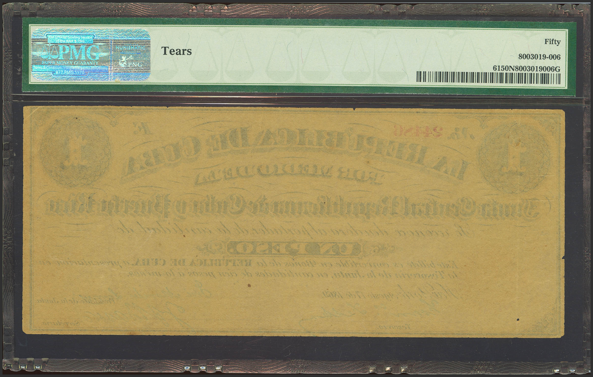 REPUBLICA DE CUBA. 1 Peso. 17 de Agosto de 1869. Serie E. (Edifil 2023: 35, Pick: 62). SC-. Encapsulado PMG50NET (tears).