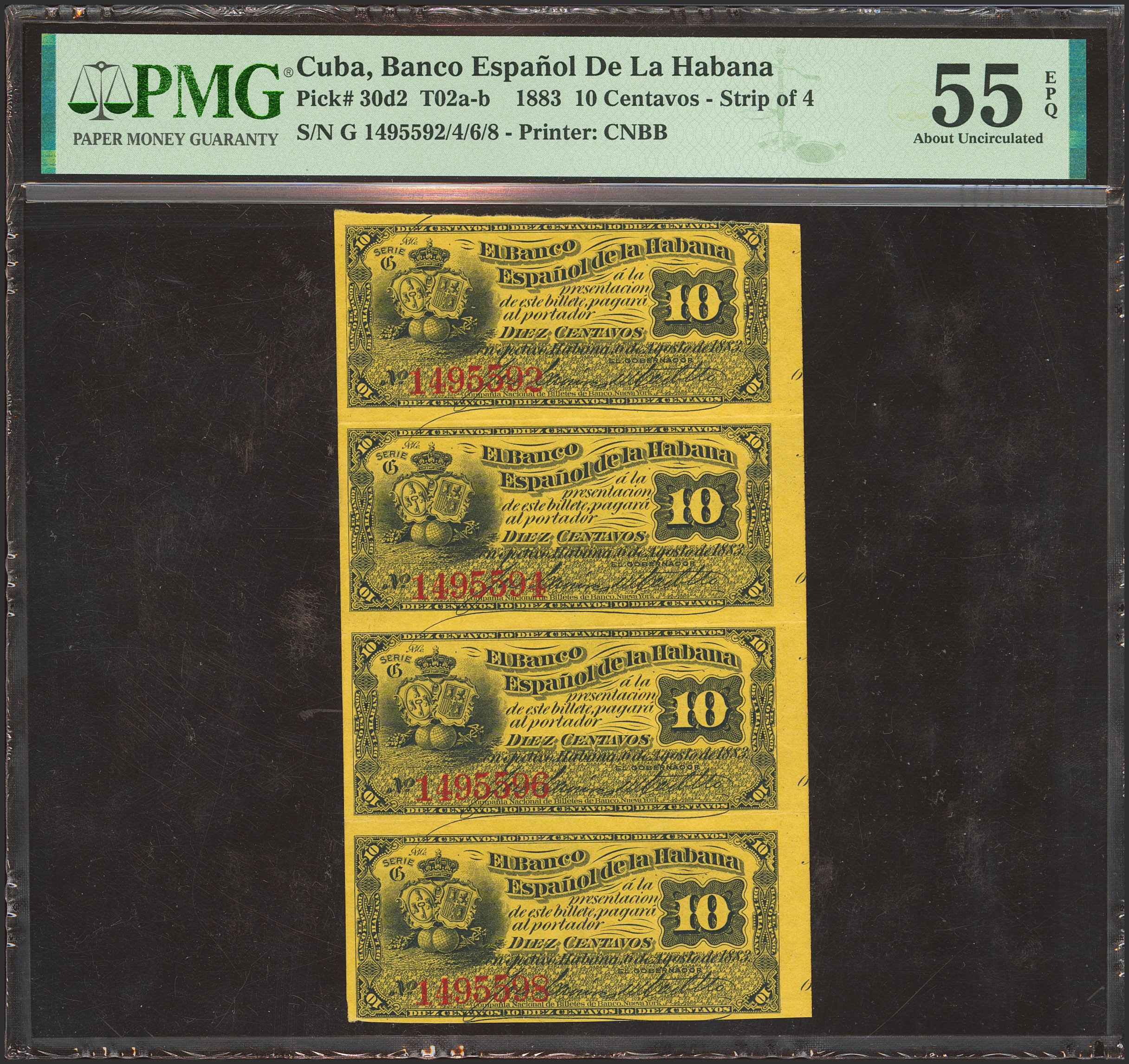BANCO ESPAÑOL DE LA HABANA. Conjunto de 4 billetes casi correlativos de 10 Centavos (sin guillotinar) emitidos el 6 de Agosto de 1886. Serie G. (Edifil 2023: 46, Pick: 30d2). Rarísimo, especialmente en esta excepcional calidad. EBC+. Encpasulado PMG55EPQ.