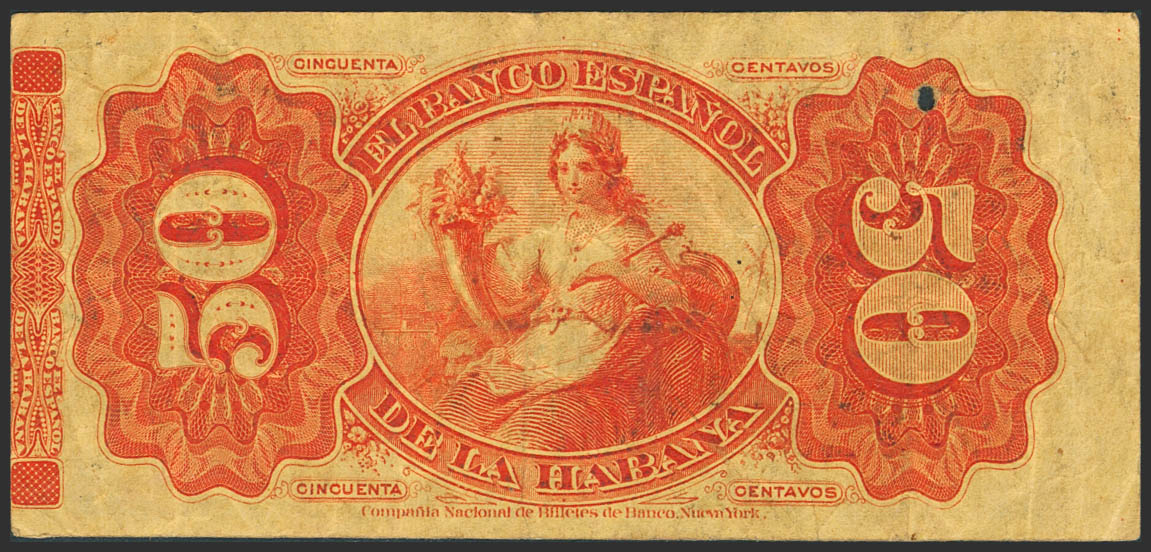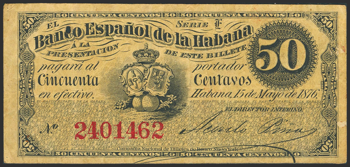 BANCO ESPAÑOL DE LA HABANA. 50 Centavos. 15 de Mayo de 1876. Serie E. (Edifil 2023: 50). Muy raro, puntito de "polilla". MBC.
