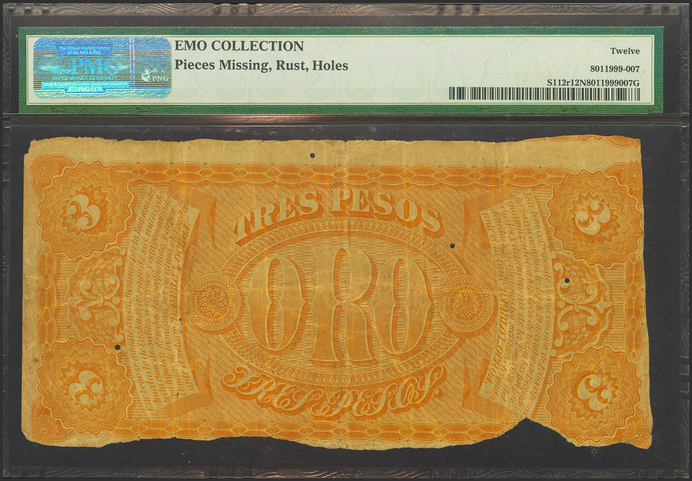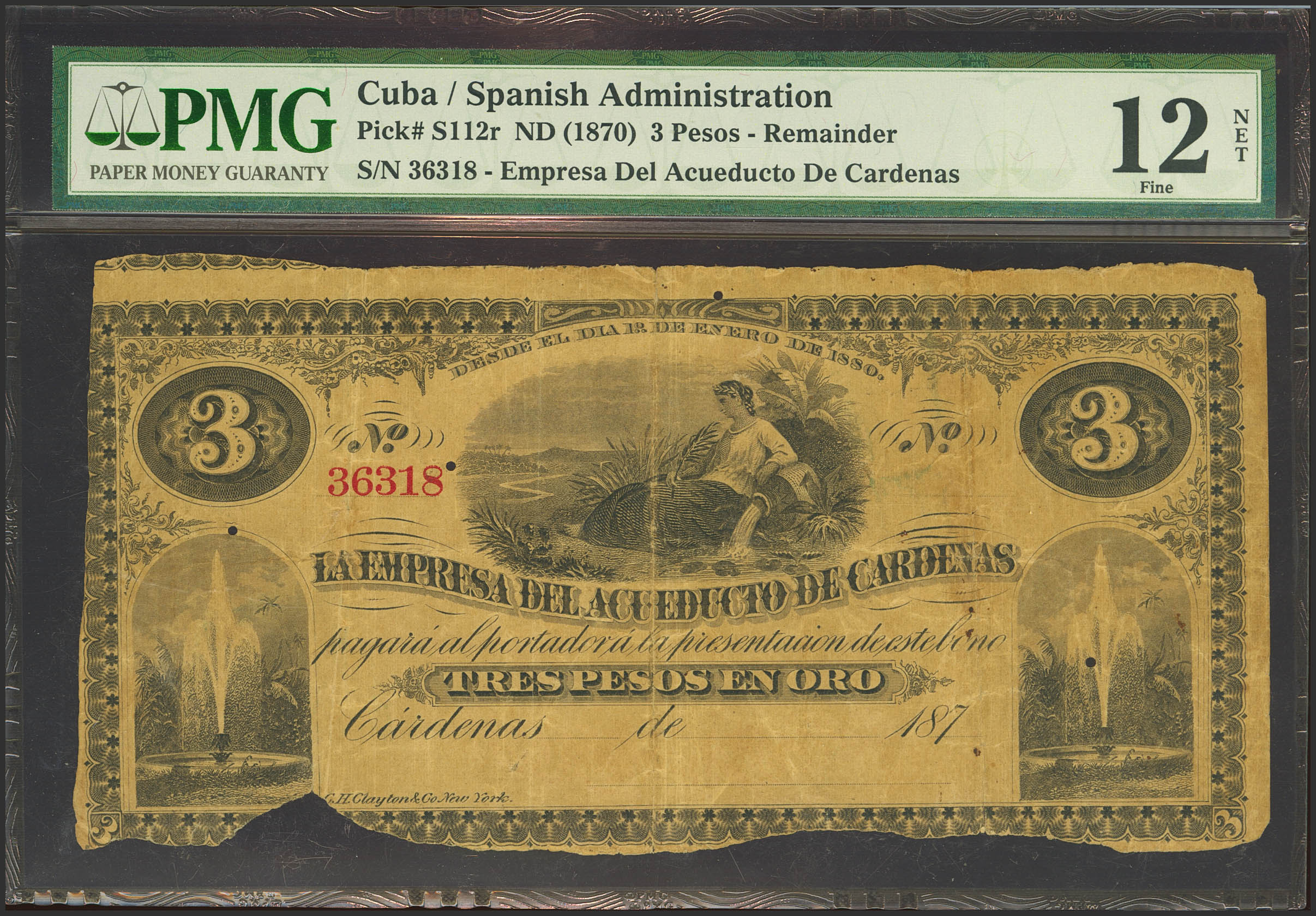SUCURSAL DE CARDENAS. 3 Pesos oro. (1870ca). (Edifil: no catalogado, Filabo: 59CU, Pick: S112r). Rarísimo, puntitos de "polilla" y con faltas. MBC-. PMG12NET.