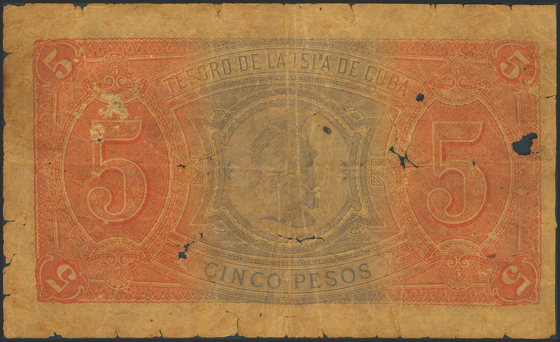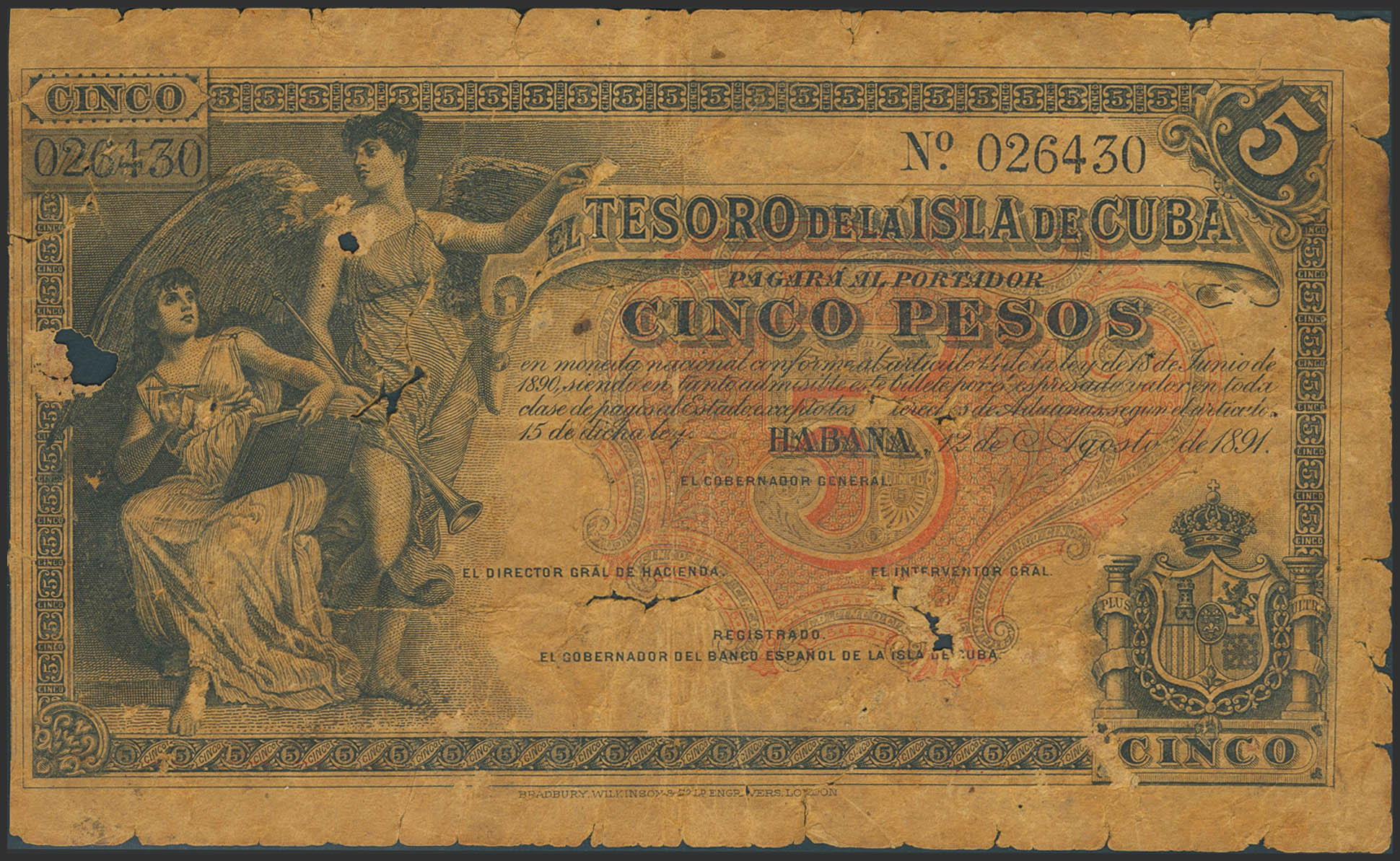 BANCO ESPAÑOL DE LA ISLA DE CUBA. 5 Pesos. 12 de Agosto de 1891. Sin serie y sin firmas como los ejemplares conocidos. (Edifil 2023: 63). Raro. RC-.