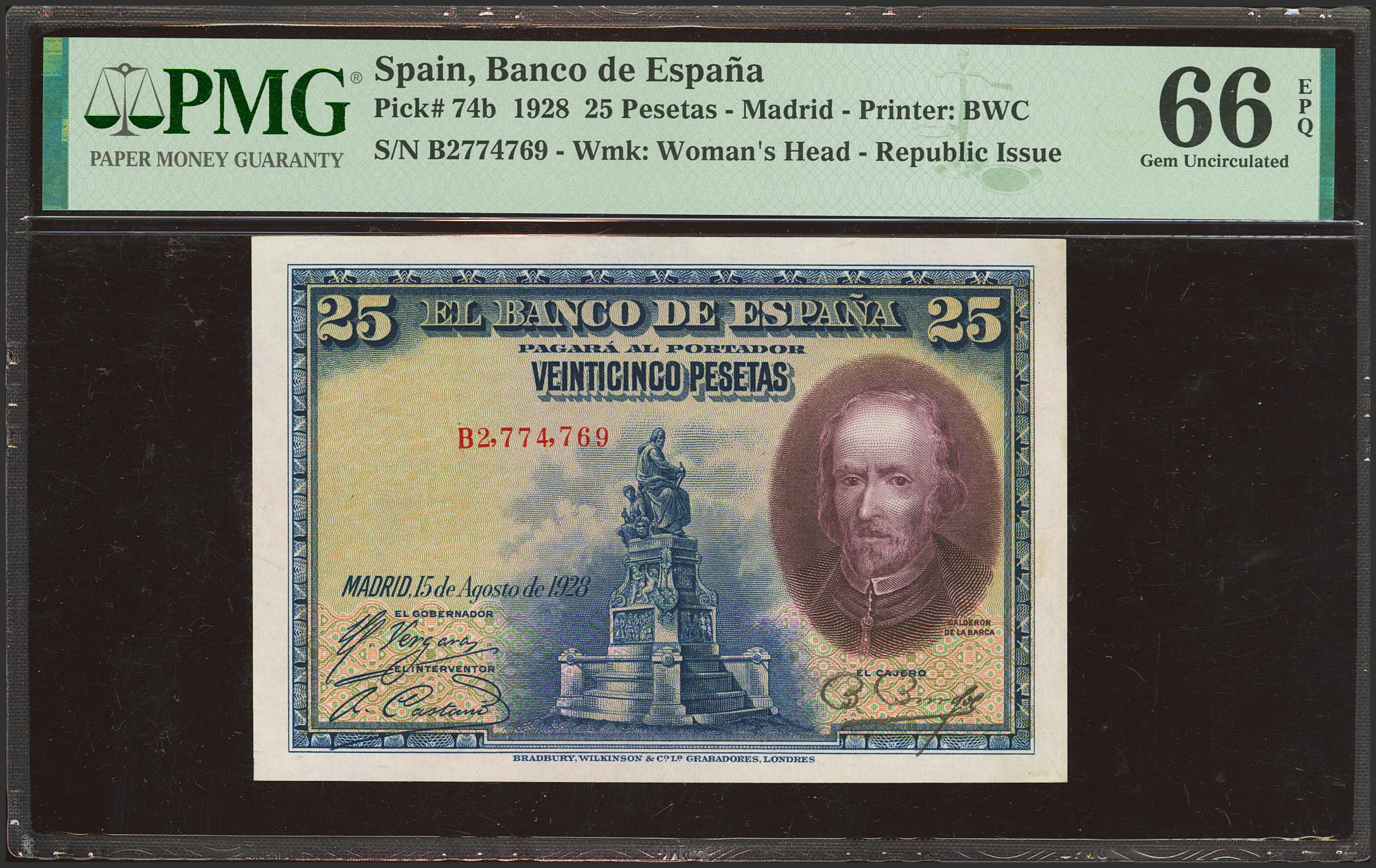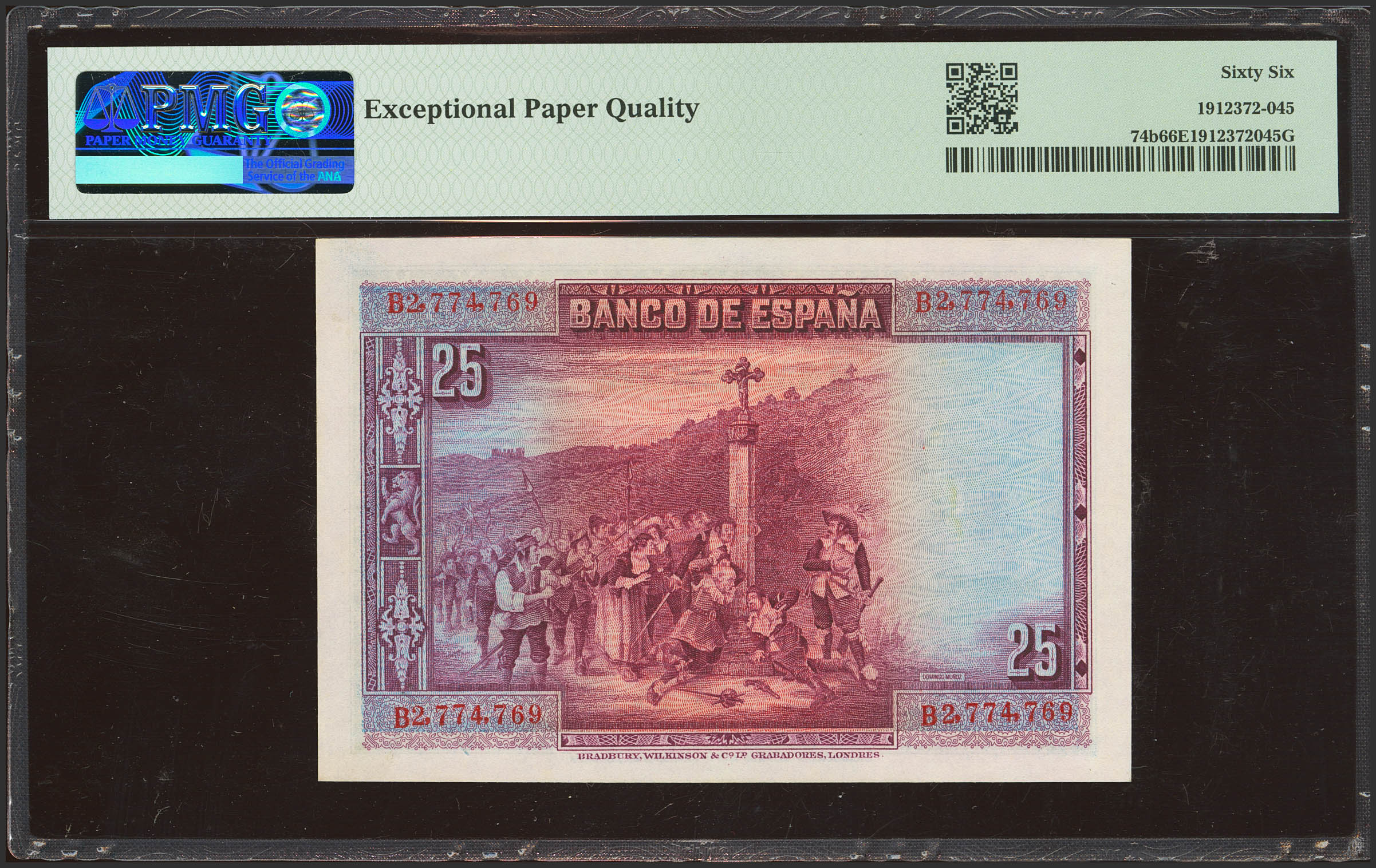 25 Pesetas. 15 de Agosto de 1928. Serie B. (Edifil 2023: 353, Pick: 74b). Inusual en esta calidad, apresto original. SC. Encapsulado PMG66EPQ.