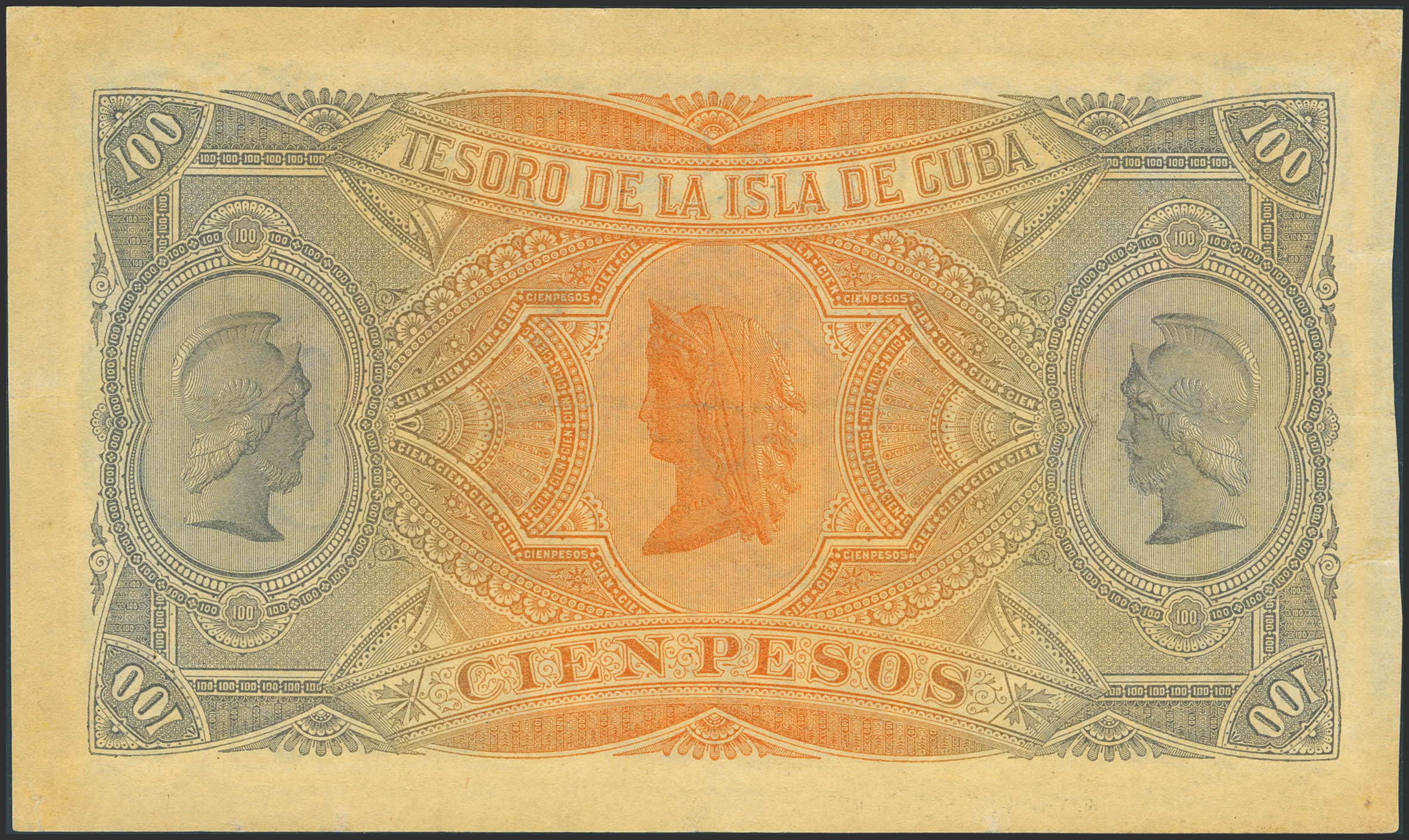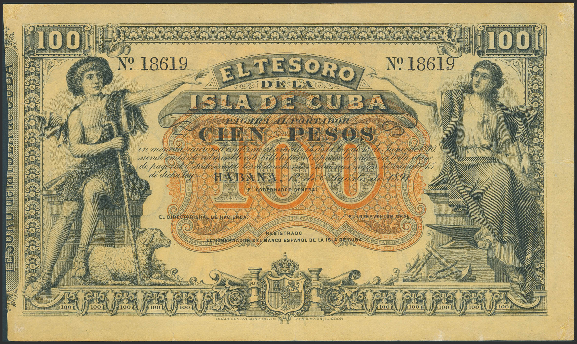BANCO ESPAÑOL DE LA ISLA DE CUBA. 100 Pesos. 12 de Agosto de 1891. Sin serie y sin firmas como los ejemplares conocidos de esta emisión. (Edifil 2023: 67). Rarísimo y mínimamente reparado. MBC+.