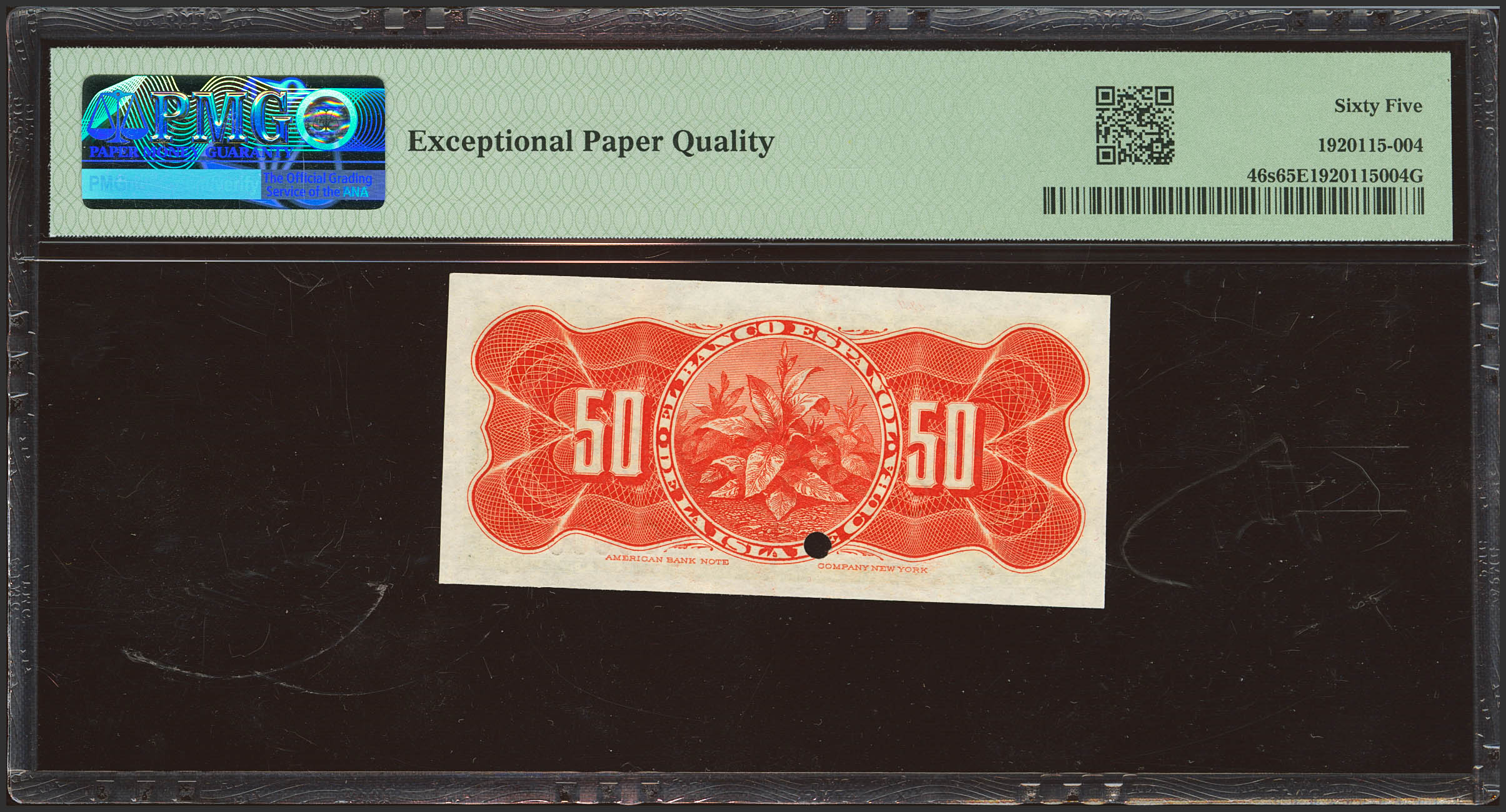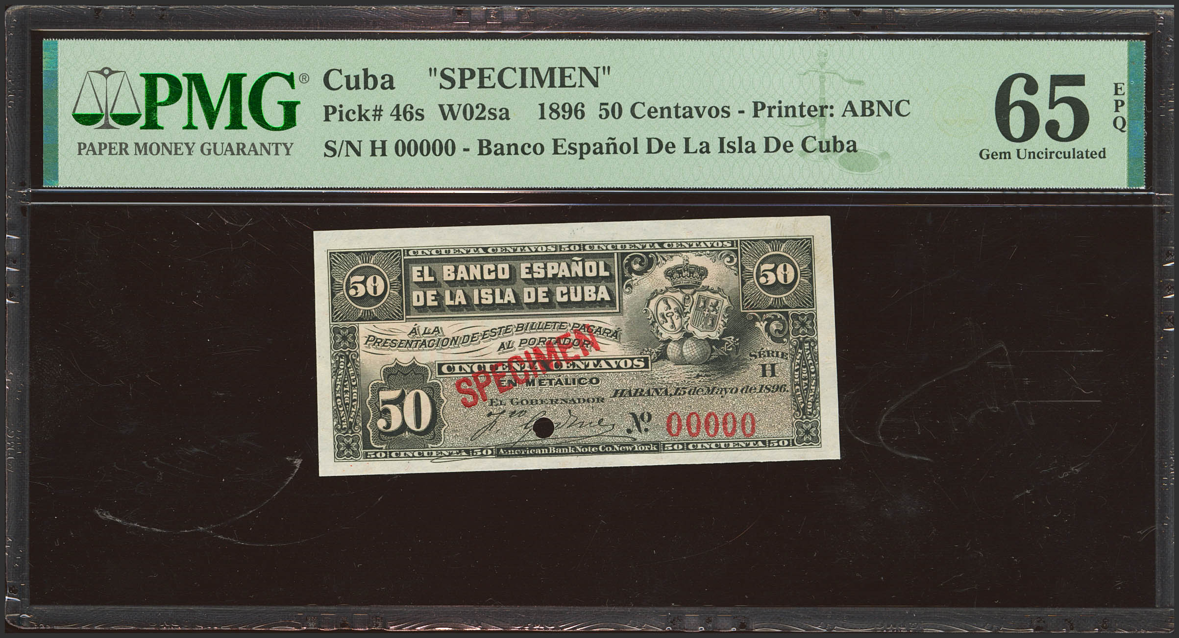 BANCO ESPAÑOL DE LA ISLA DE CUBA. 50 Centavos. 15 de Mayo de 1896. Serie H, espécimen y numeración 00000. (Edifil 2023: 70, Pick: 46s). Rarísimo, especialmente en esta excepcional calidad. SC. Encapsulado PMG65EPQ.