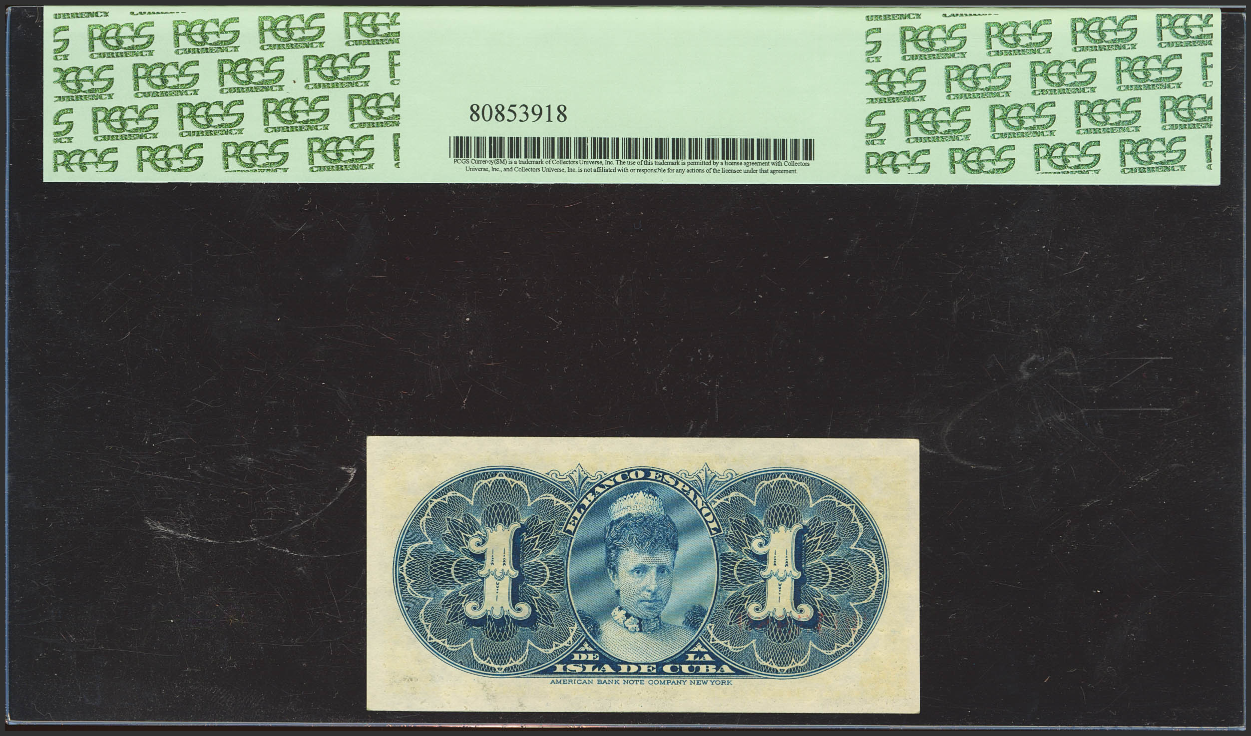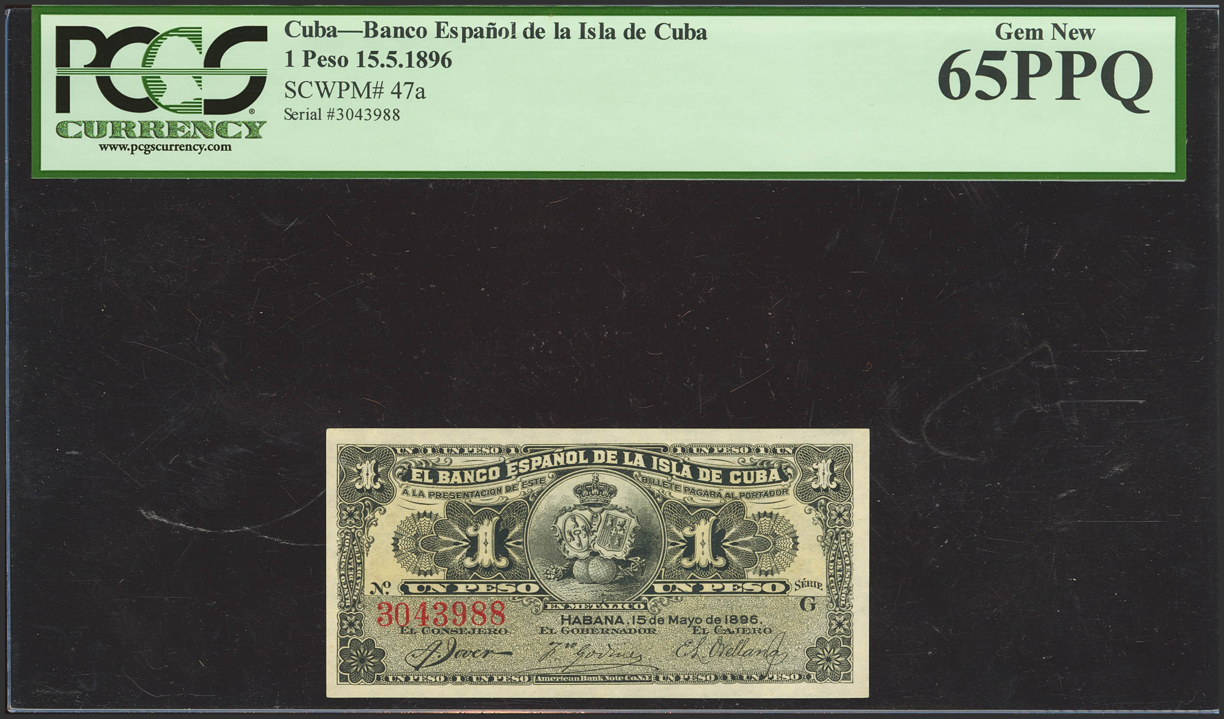 BANCO ESPAÑOL DE LA ISLA DE CUBA. 1 Peso. 15 de Mayo de 1896. Serie G. (Edifil 2023: 71, Pick: 47a). Apresto original. SC. Encapsulado PCGS65PPQ.