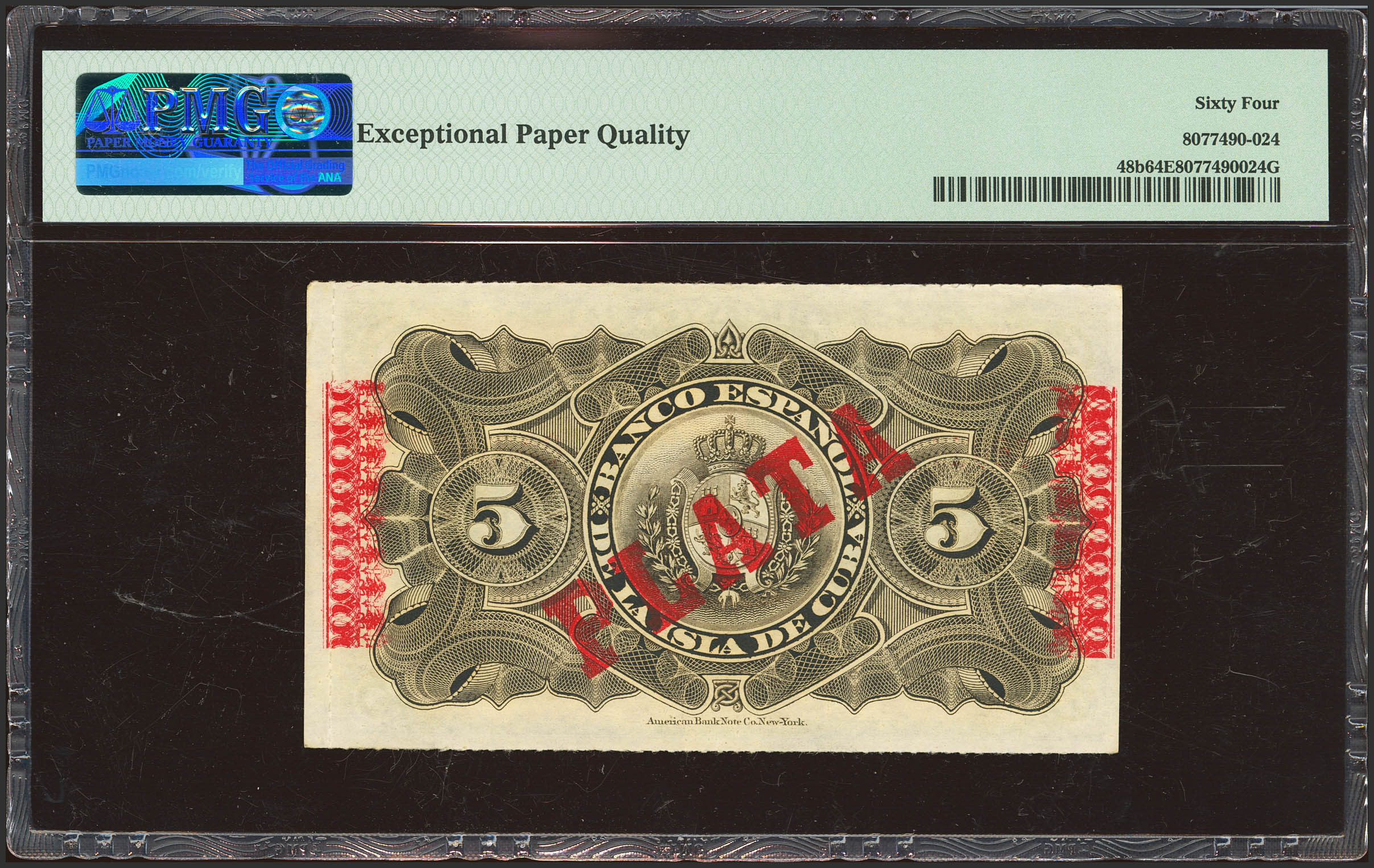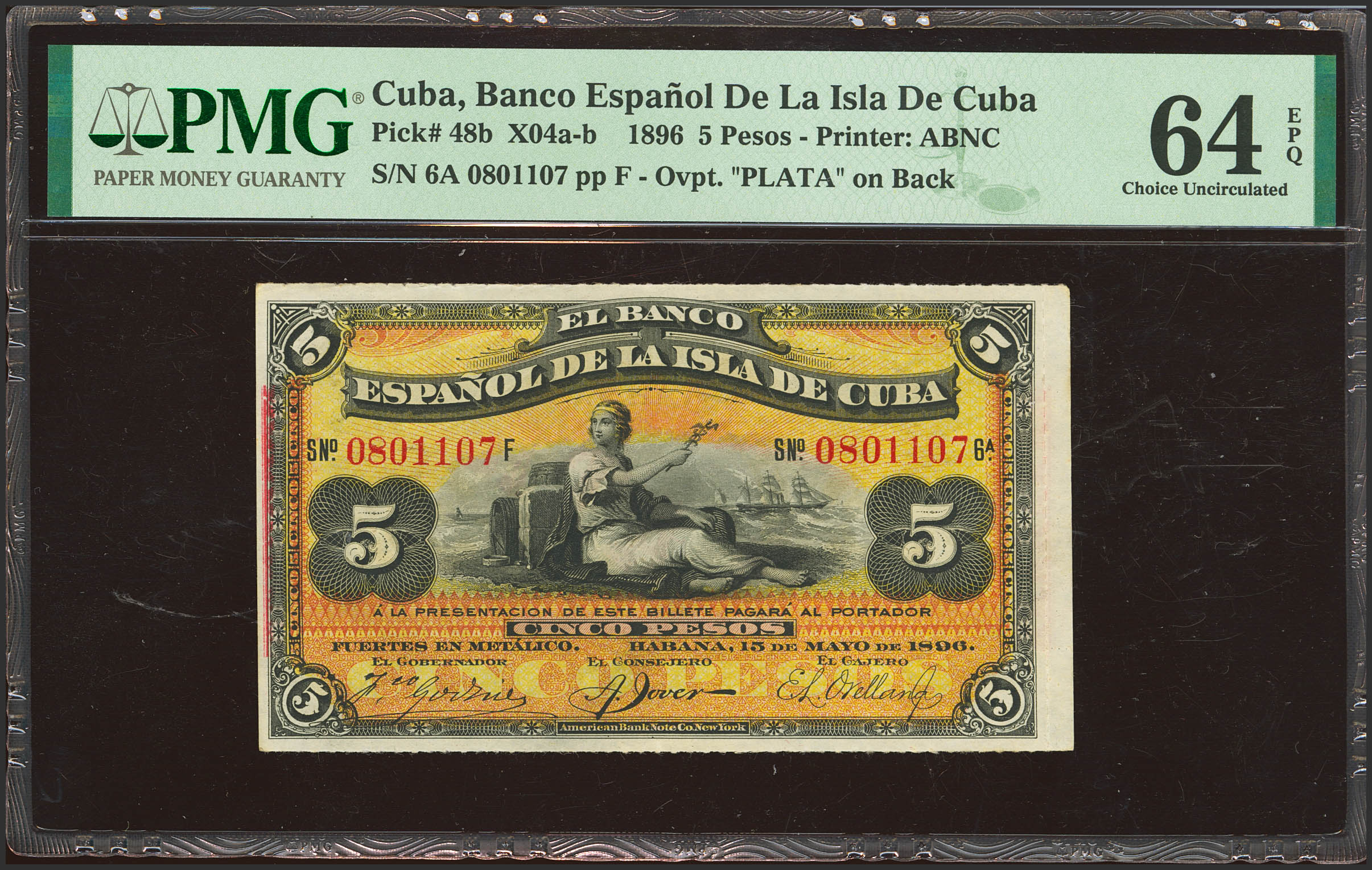BANCO ESPAÑOL DE LA ISLA DE CUBA. 5 Pesos. 15 de Mayo de 1896. Sobrecarga PLATA, en el reverso. (Edifil 2023: 81, Pick: 48b). Raro, apresto original. SC. Encapsulado PMG64EPQ.