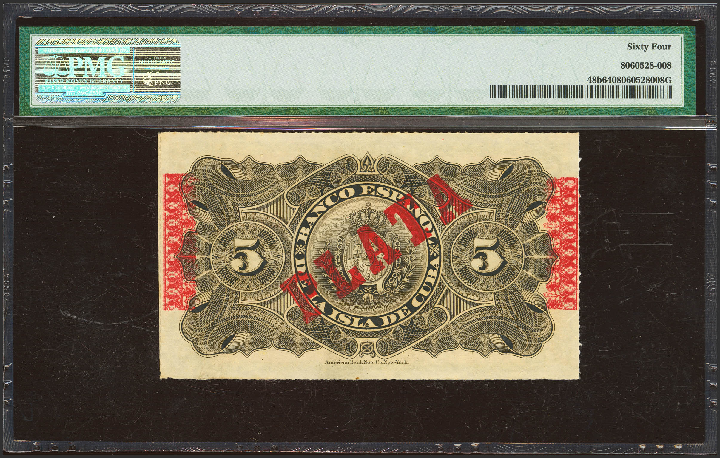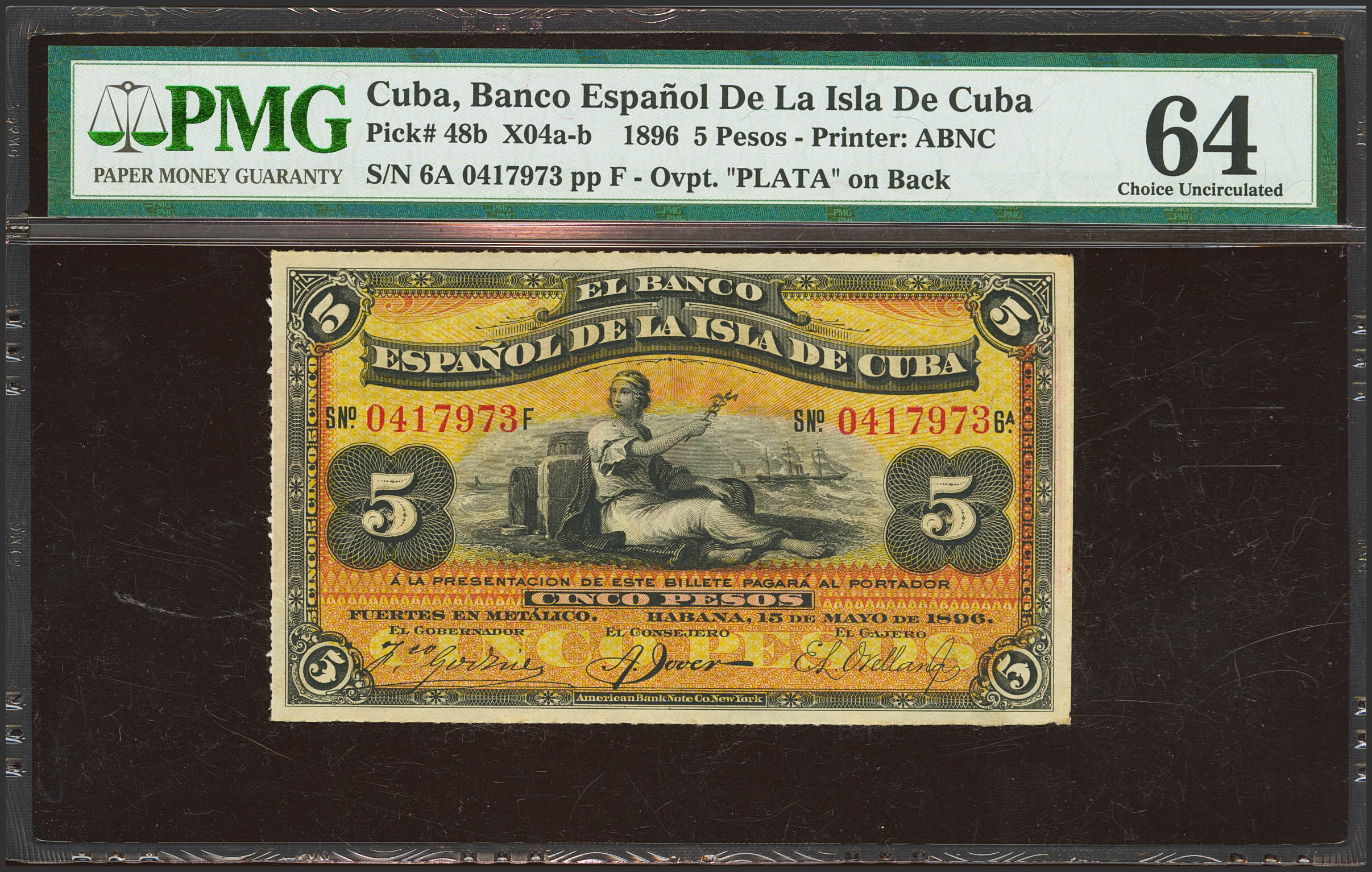 BANCO ESPAÑOL DE LA ISLA DE CUBA. 5 Pesos. 15 de Mayo de 1896. Sobrecarga PLATA, en el reverso. (Edifil 2023: 81, Pick: 48b). Raro. SC. Encapsulado PMG64.