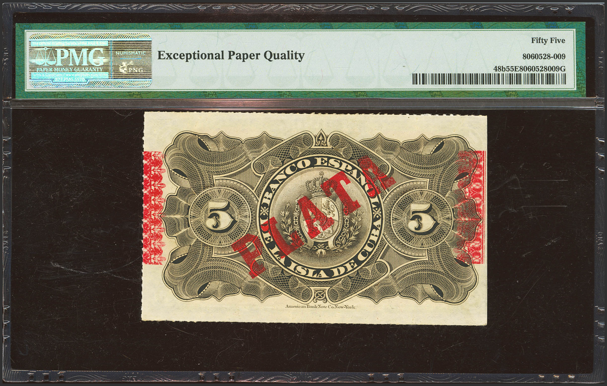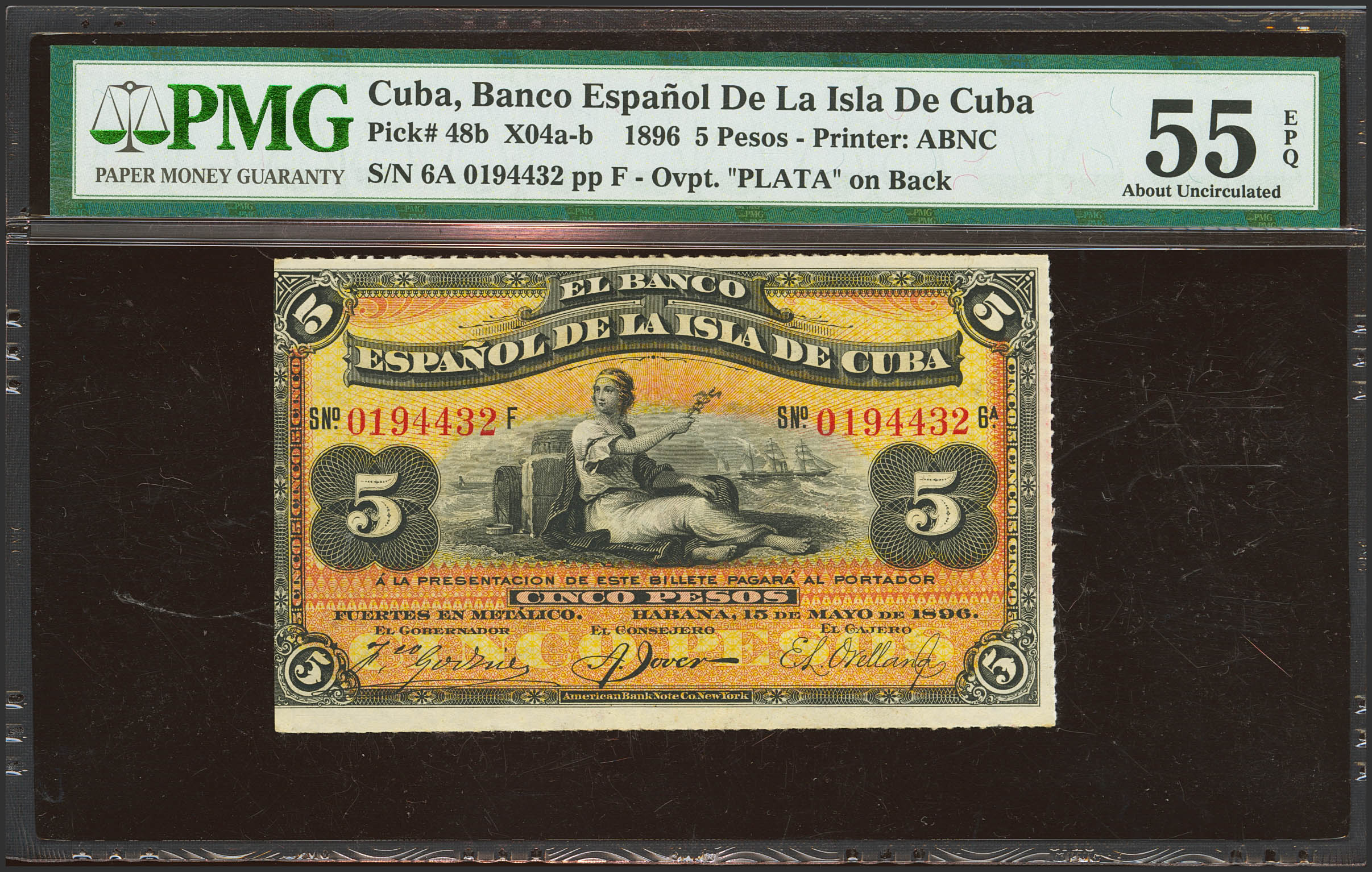 BANCO ESPAÑOL DE LA ISLA DE CUBA. 5 Pesos. 15 de Mayo de 1896. Sobrecarga PLATA, en el reverso. (Edifil 2023: 81, Pick: 48b). Raro, apresto original. EBC+. Encapsulado PMG55EPQ.