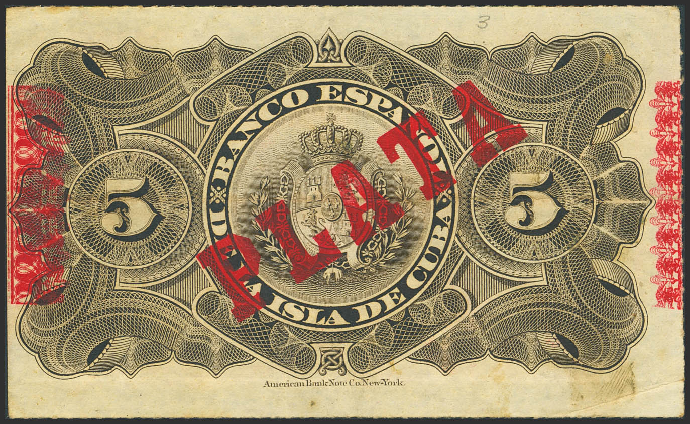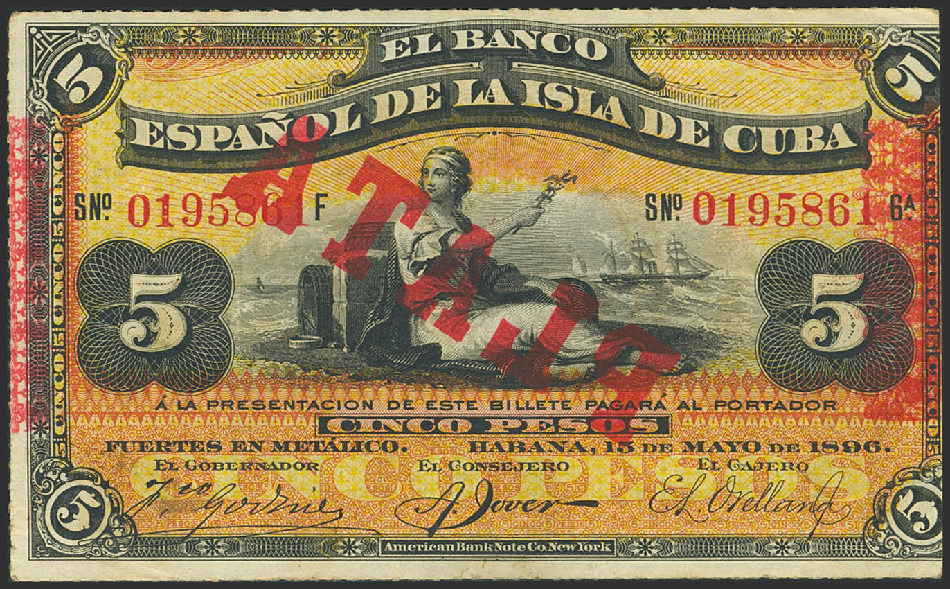 BANCO ESPAÑOL DE LA ISLA DE CUBA. 5 Pesos. 15 de Mayo de 1896. Sobrecarga PLATA, en el reverso y en el anverso sobrecarga calcada PLATA (dando la apariencia de sobrecarga invertida). (Edifil 2023: 81, Pick: 48b). Raro y espectacular, apresto original. MBC+.