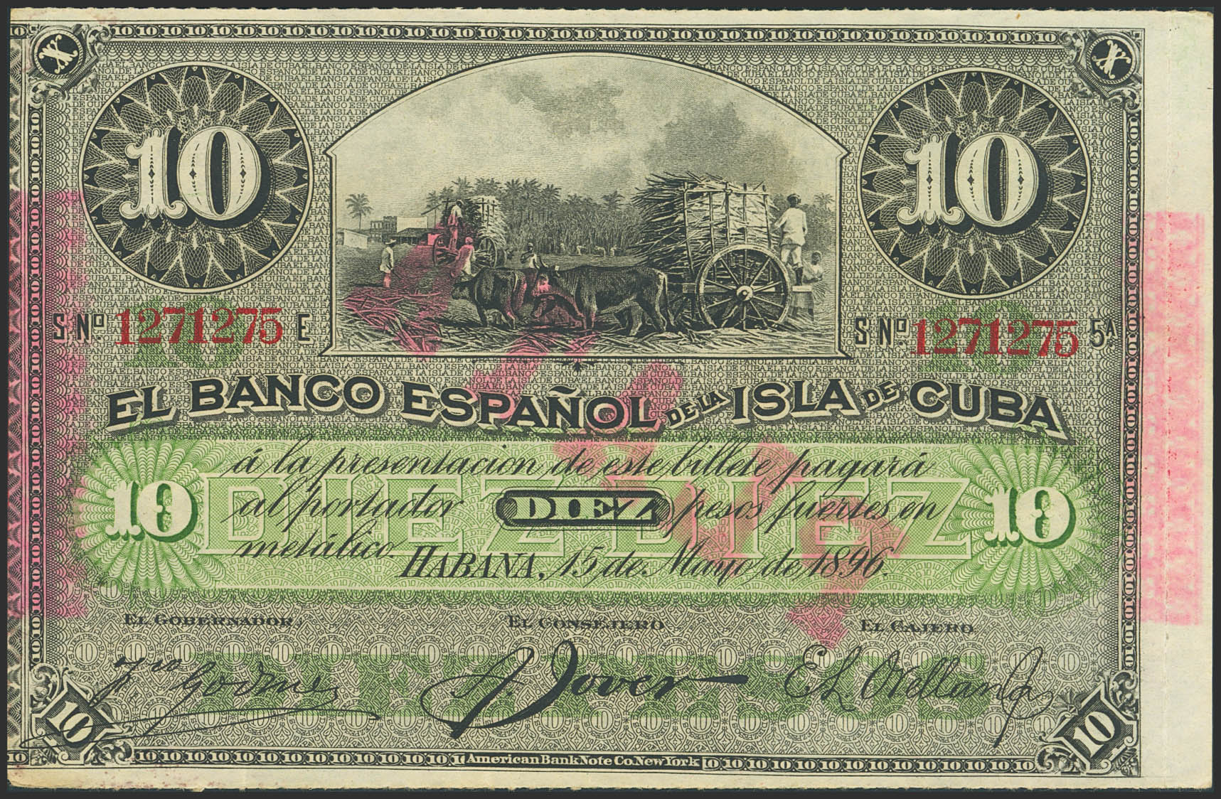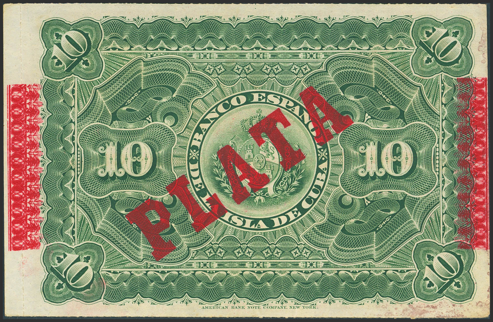 BANCO ESPAÑOL DE LA ISLA DE CUBA. 10 Pesos. 15 de Mayo de 1896. Serie E y con la sobrecarga PLATA, al dorso y en el frente levemente calcada. (Edifil 2023: 82). Raro. SC--.
