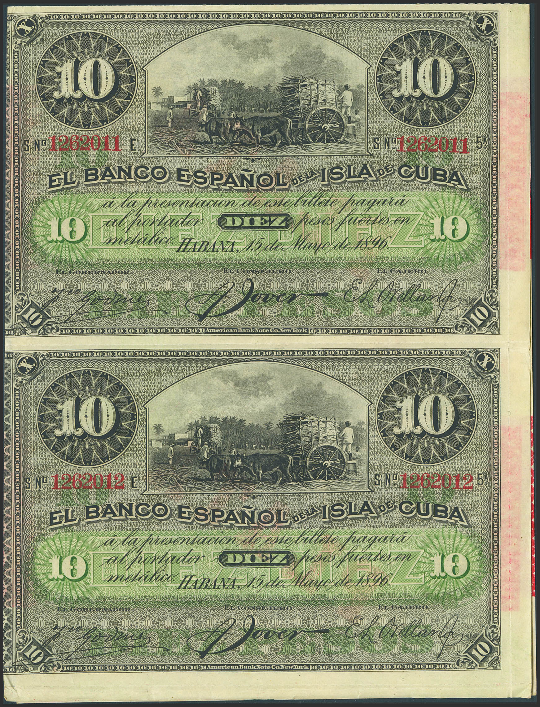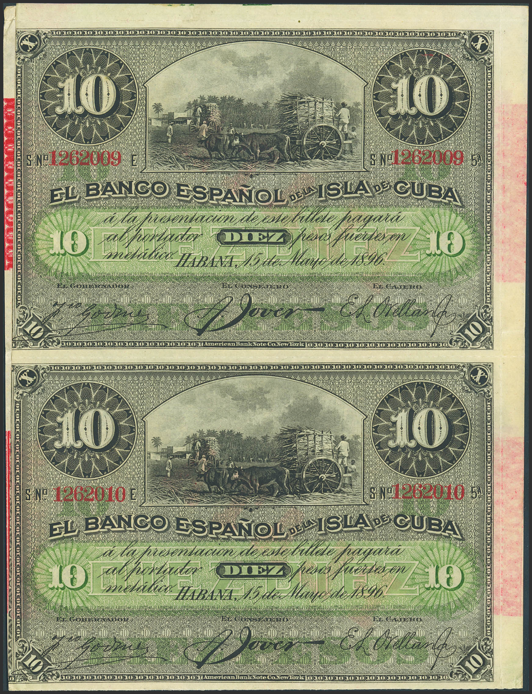BANCO ESPAÑOL DE LA ISLA DE CUBA. Conjunto de 4 billetes correlativos de 10 Pesos (sin desprender), emitidos el 15 de Mayo de 1896 con sobrecarga PLATA, al dorso. (Edifil 2023: 82). Apresto original, dos billetes punto de aguja, no se trata de un defecto, sino que todos los billetes de esa posición lo tienen debido al sistema de impresión. SC/SC-.