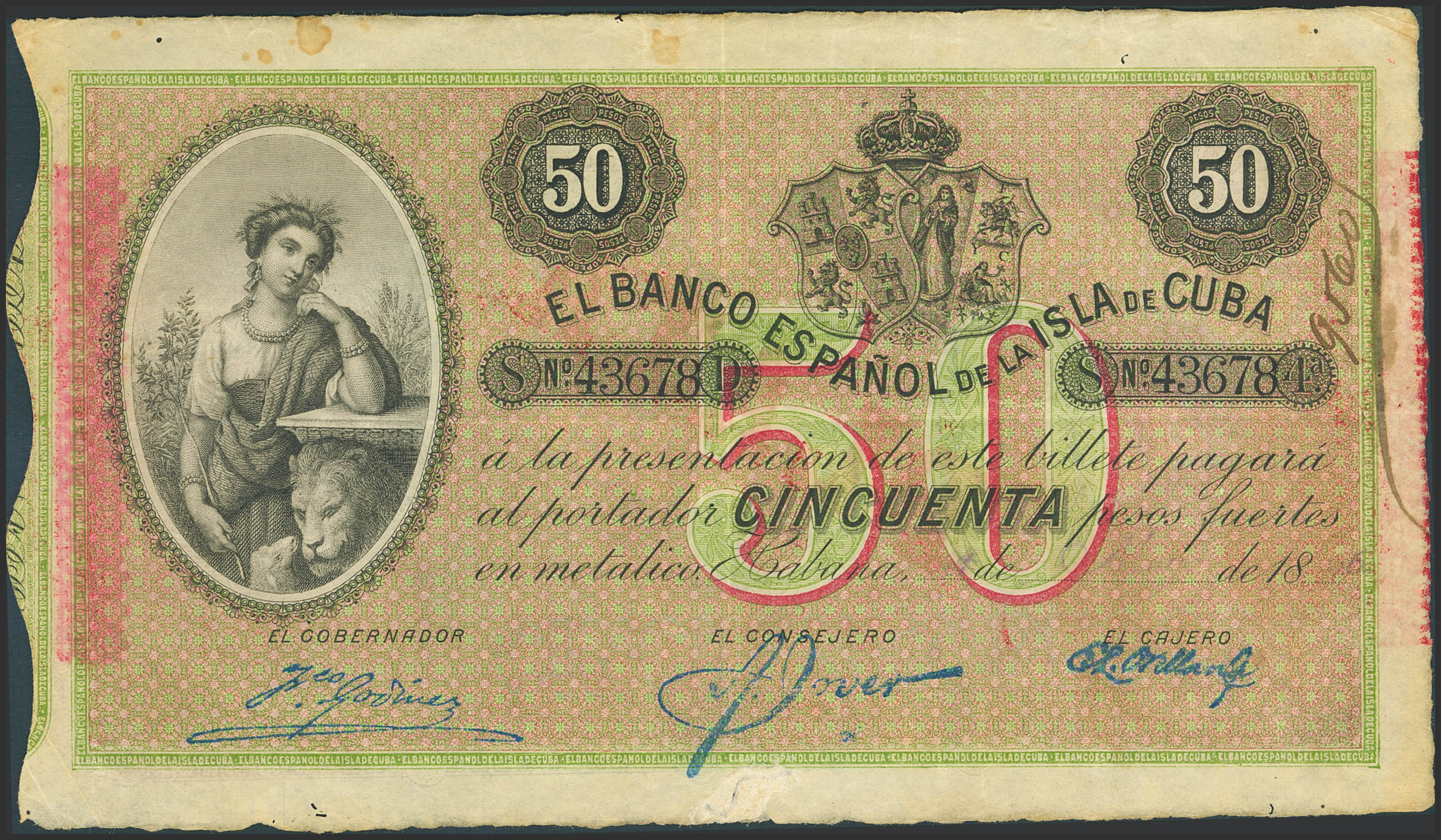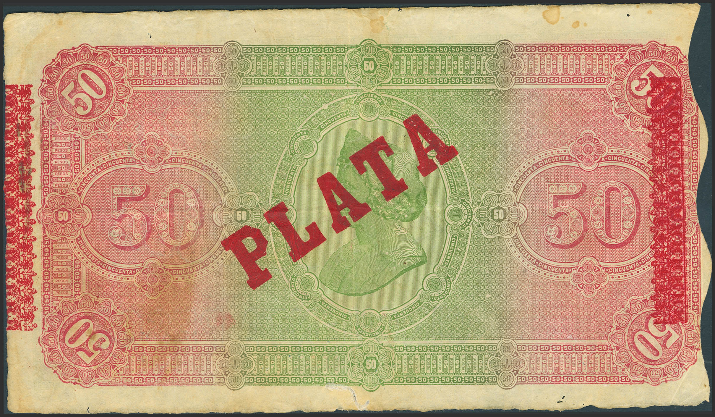 CUBA. 50 Pesos. (1896ca). Sobrecarga PLATA, al dorso. (Edifil 2023: 83). MBC-.