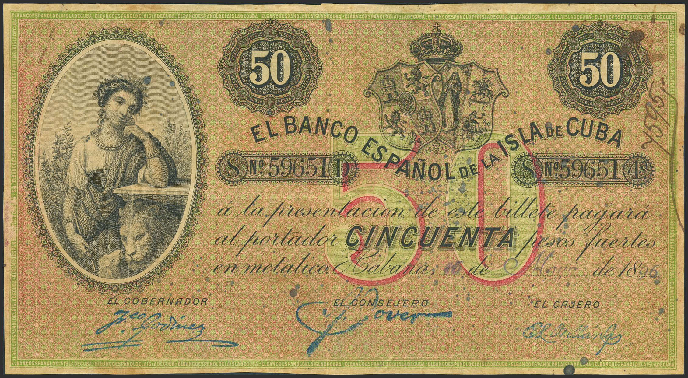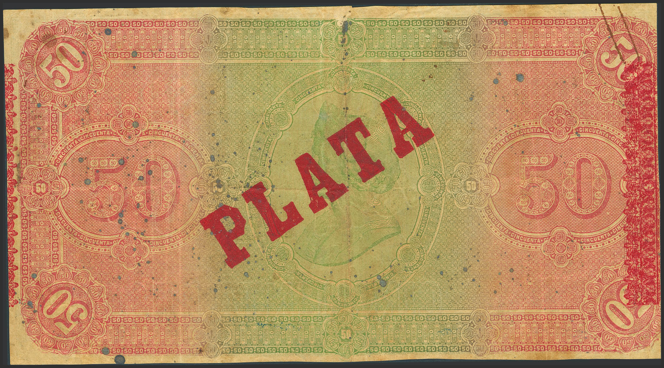 CUBA. 50 Pesos. 15 de Mayo de 1896. Sobrecarga PLATA, al dorso. (Edifil 2023: 83). Márgenes recortados. BC+.