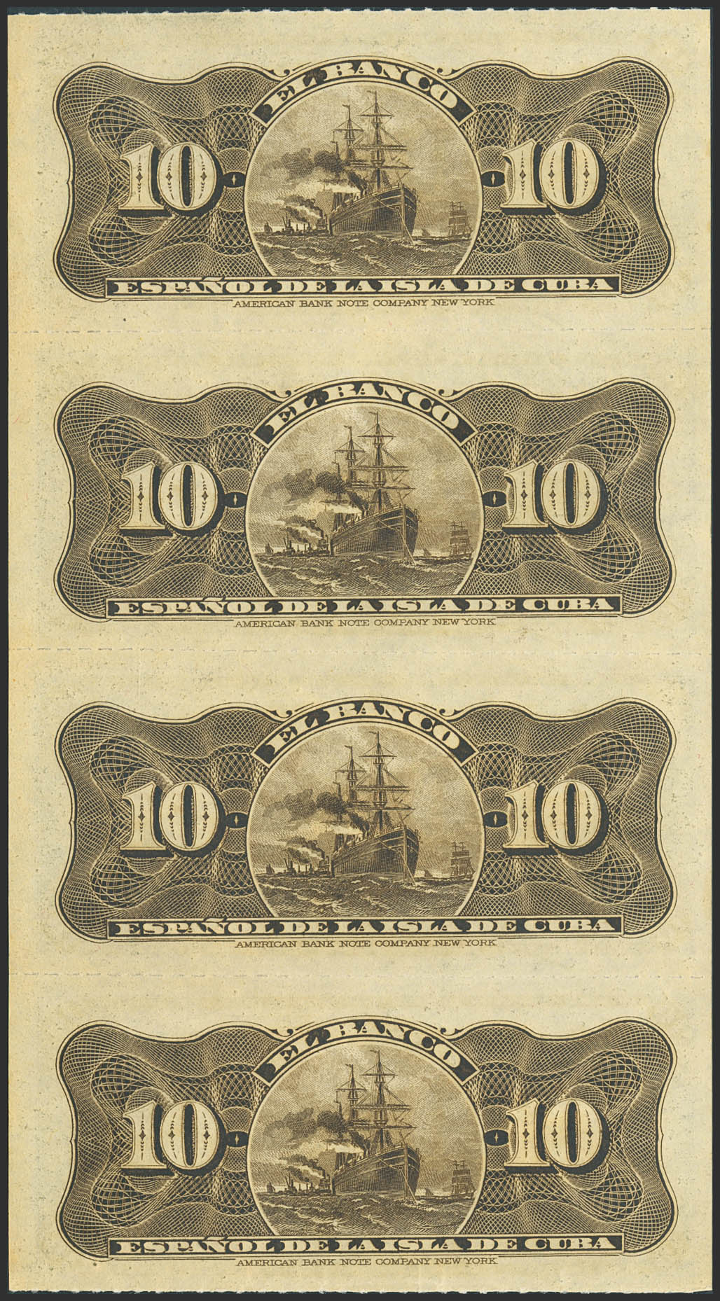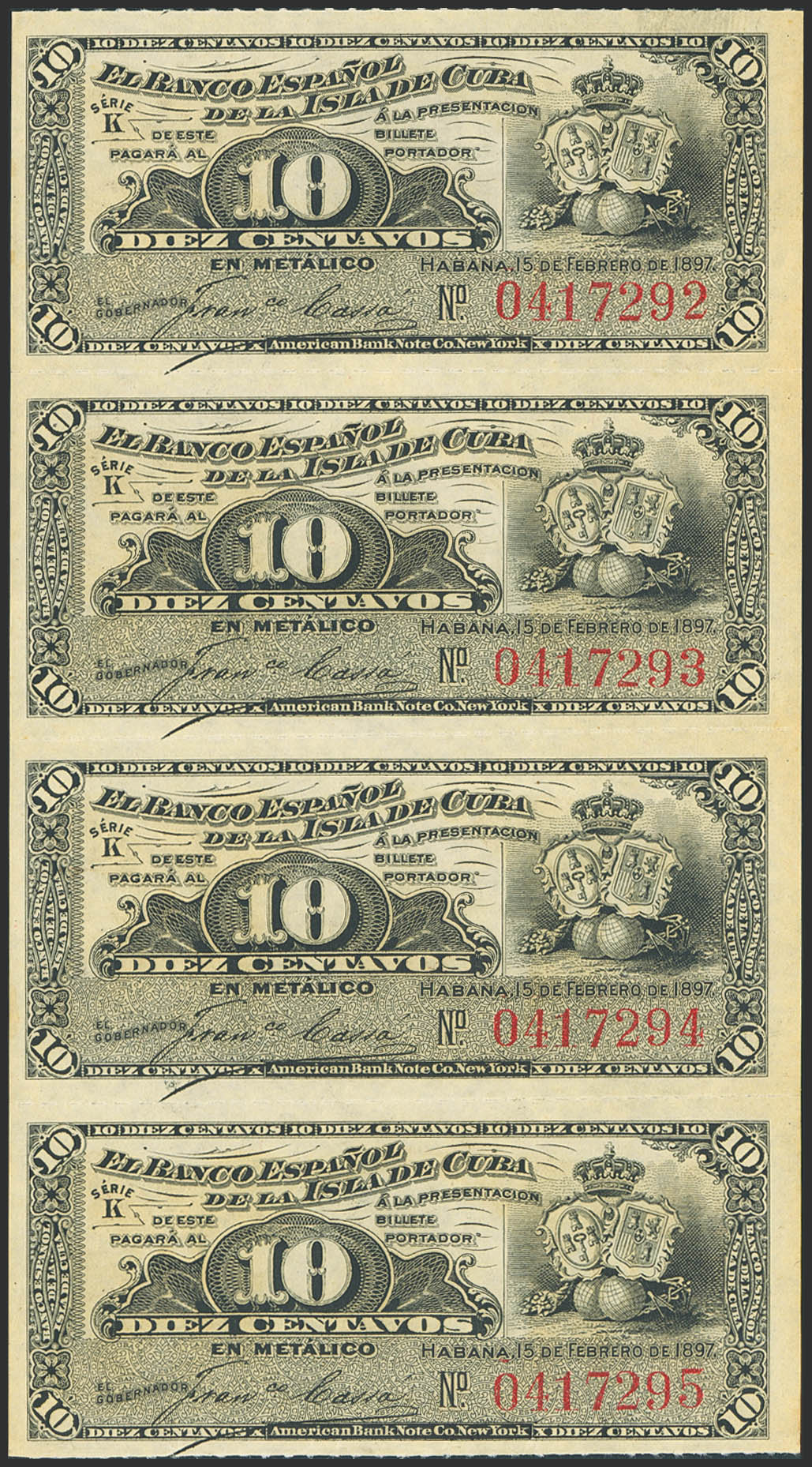 BANCO ESPAÑOL DE LA ISLA DE CUBA. Conjunto de 4 billetes correlativos de 10 Centavos (sin desprender), emitidos el 15 de Febrero de 1897. Serie K. (Edifil 2023: 84). Inusual. SC.