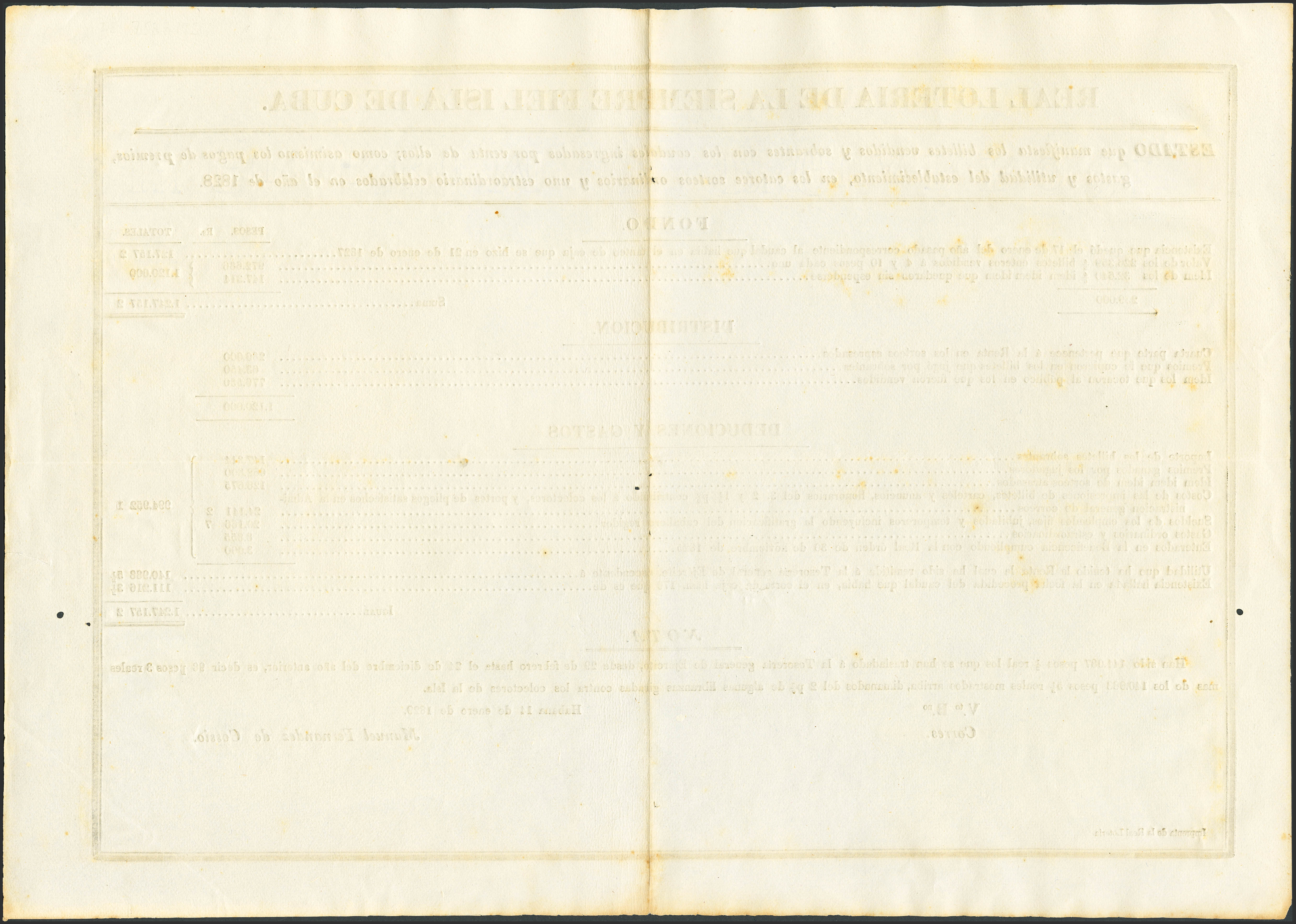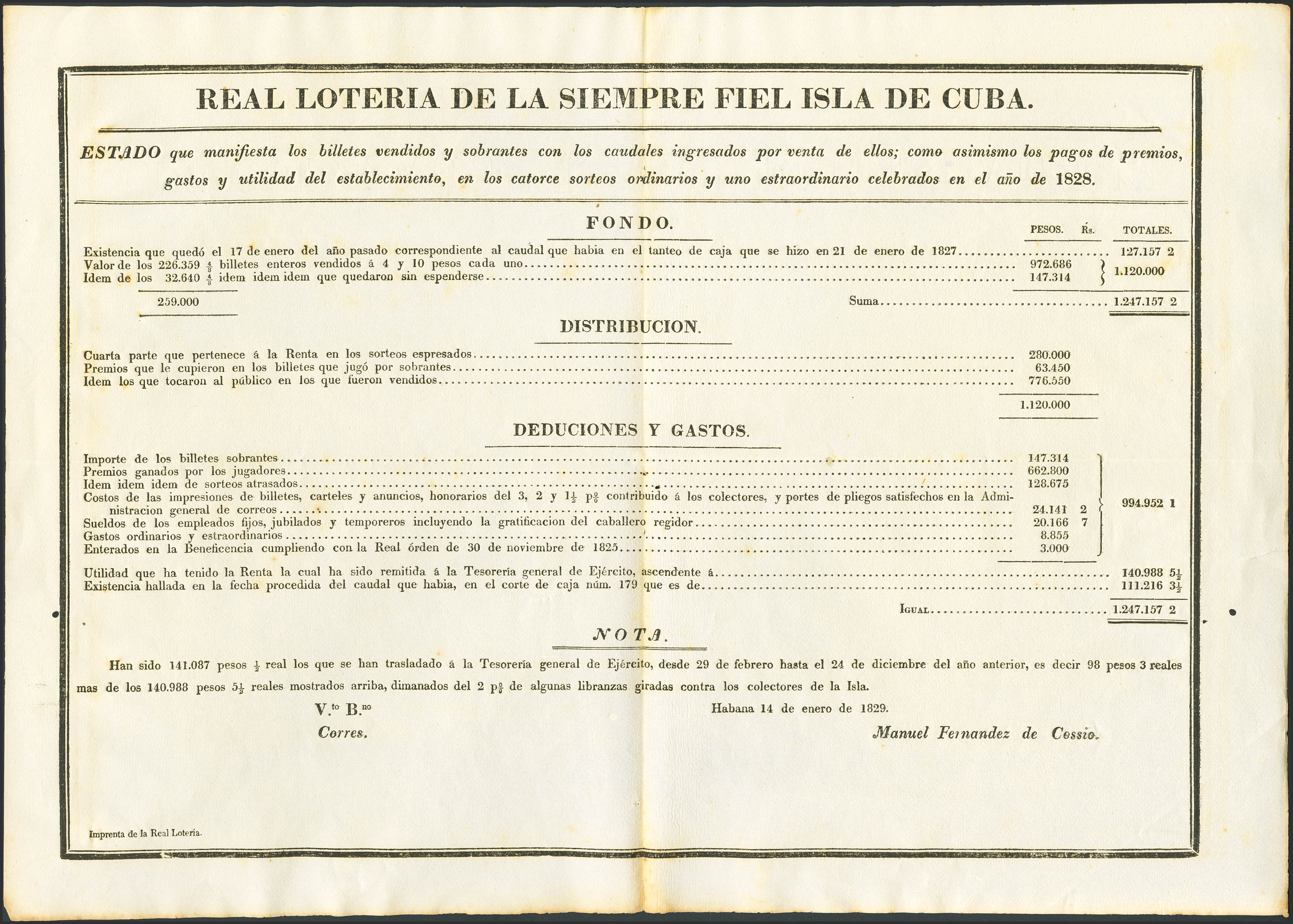 REAL LOTERIA DE LA SIEMPRE FIEL ISLA DE CUBA. 14 de Enero de 1829. Espectacular cuadro sinóptico del estado de las cuentas generales de los sorteos celebrados en 1828, rarísimo. EBC.