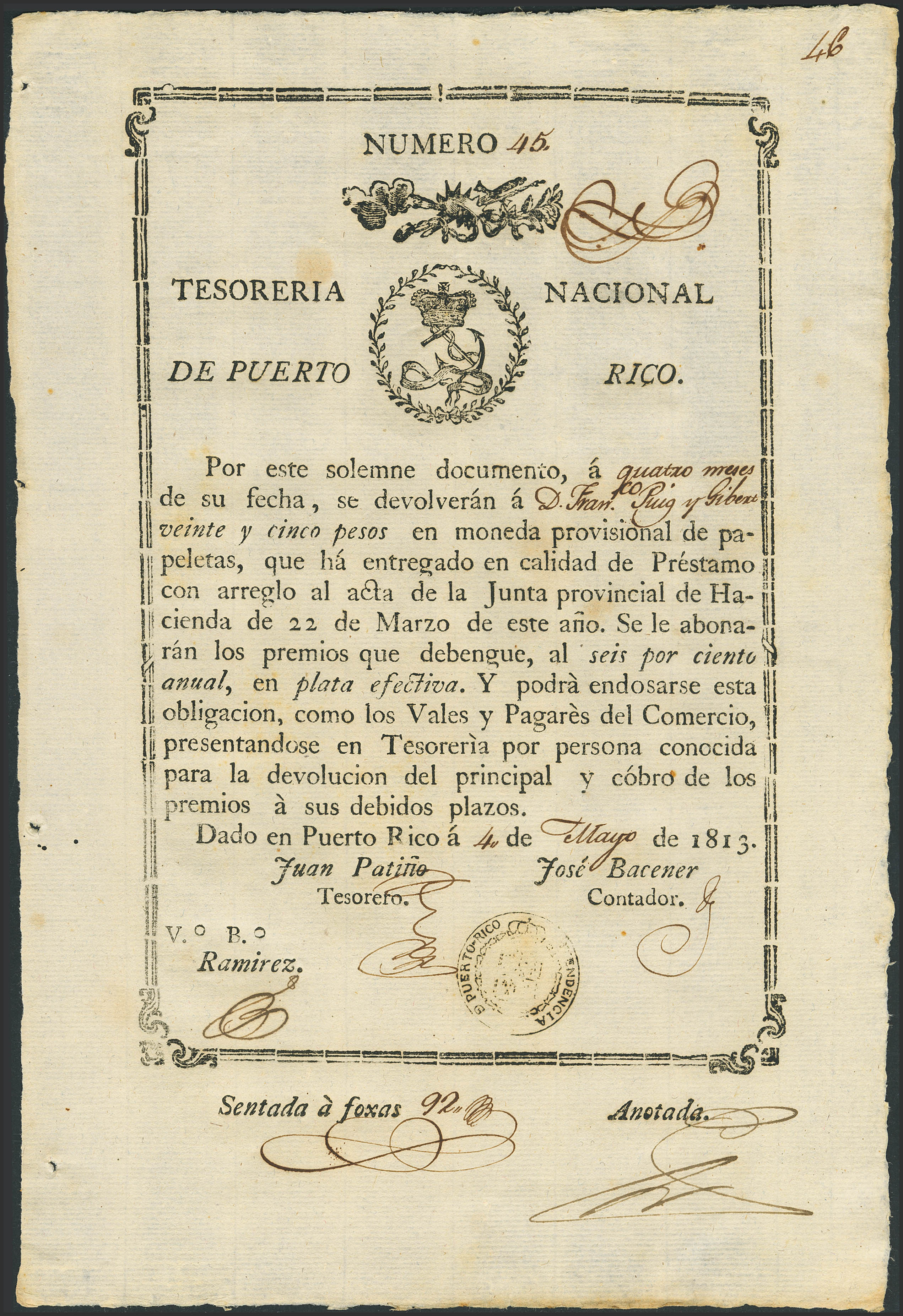 PUERTO RICO. 25 Pesos. 4 de Mayo de 1813. Real Tesorería. Sin serie. (Edifil 2023: 4). Muy raro. SC-.