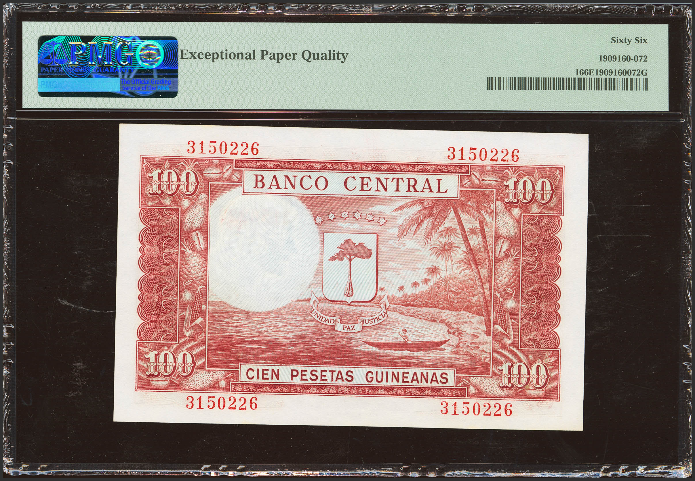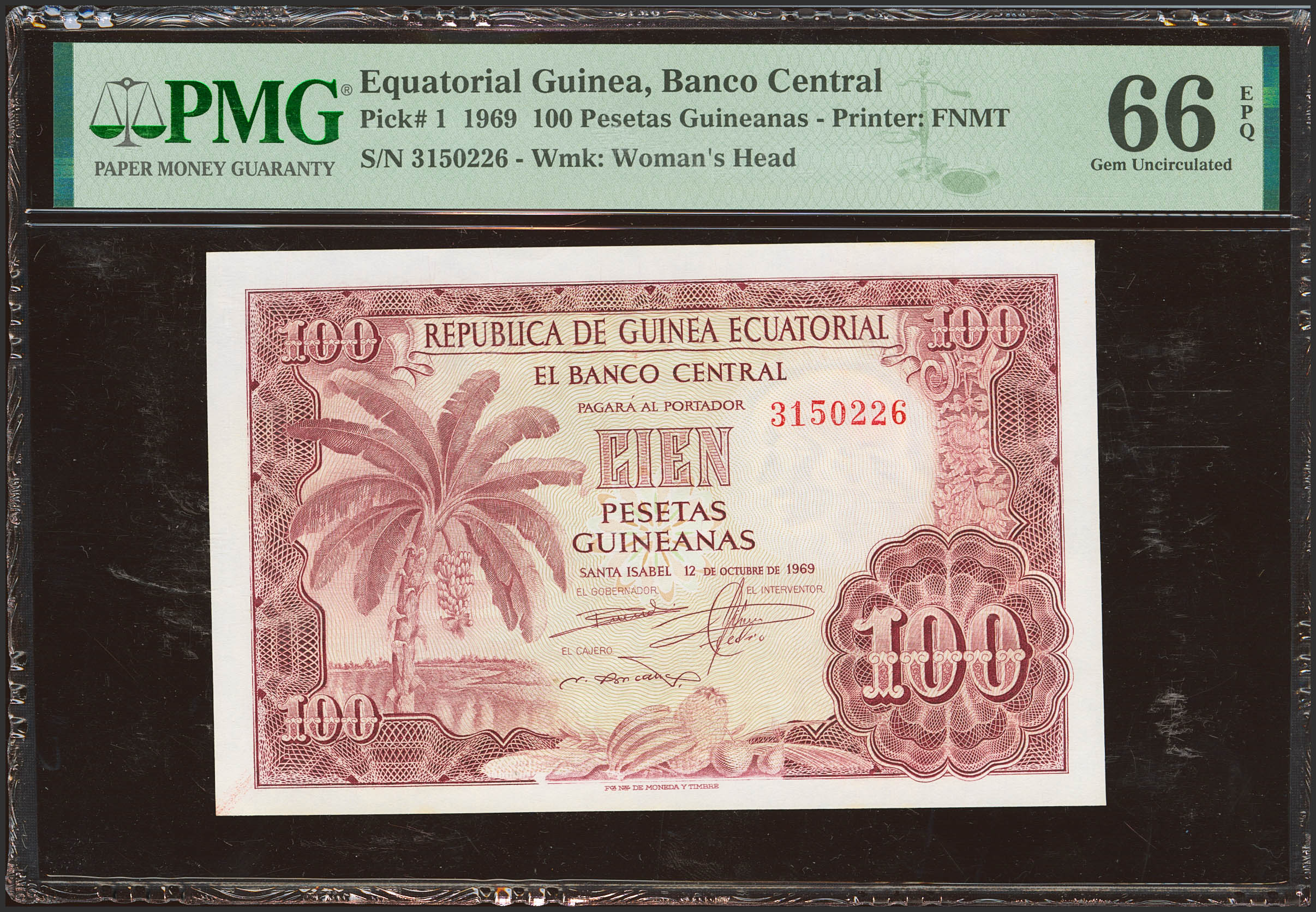 GUINEA ECUATORIAL. 100 Pesetas. 12 de Octubre de 1969. Sin serie. (Pick: 1). Inusual en esta excepcional calidad, apresto original. SC. Encapsulado PMG66EPQ.